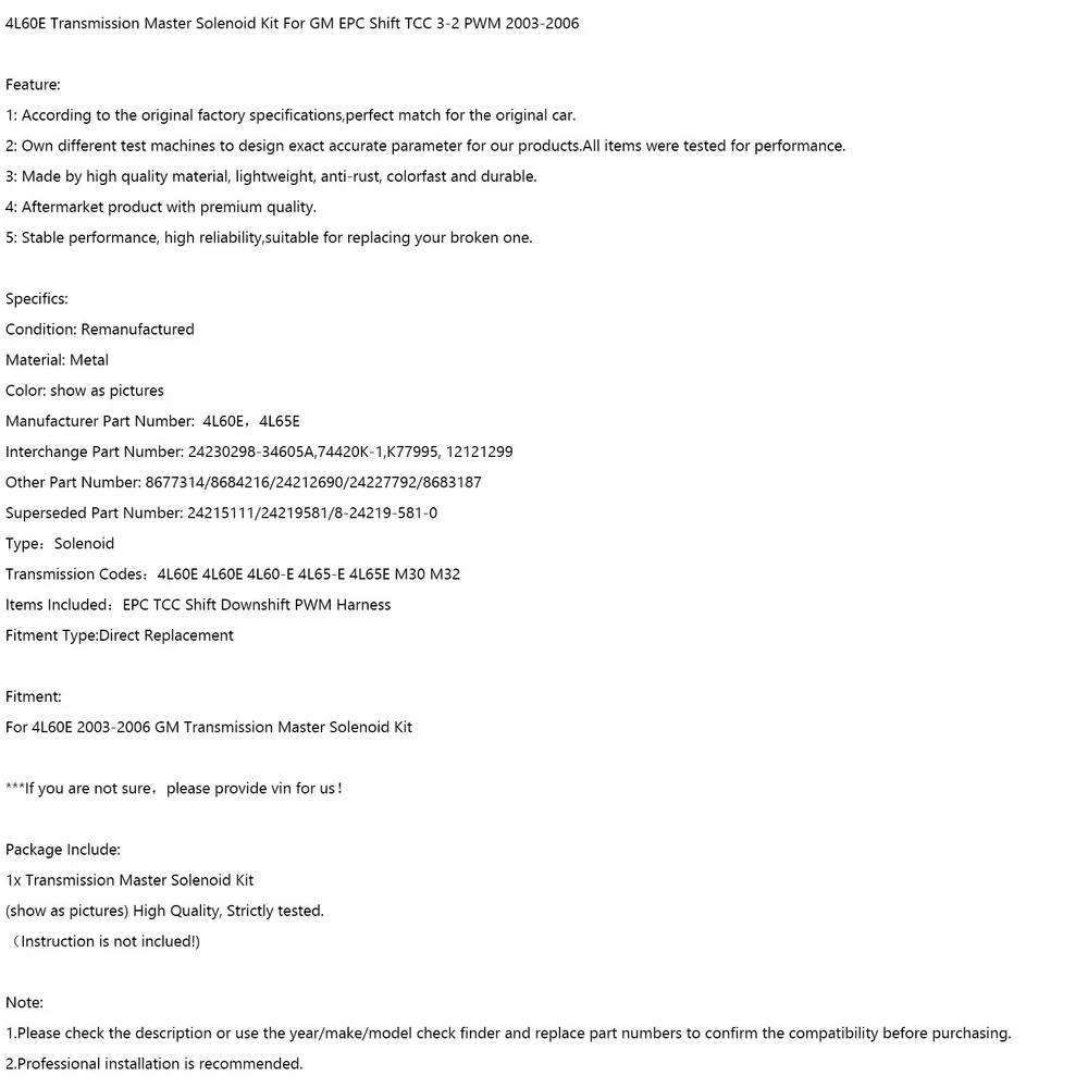 For BMW E46 323i 325i 328i 330i M3 305 02-06 LHD Center Console Trim Base BE F13 70.61 USD 74.33 USD Free shipping 5% off Gas Tank Fuel Cock Valve Petcock fit for Yamaha YZF R1 XJ900 YZ80 4KM-24500-00 18.76 USD Free shipping 7" LCD Digitizer Touch-Screen C070EAT01.0 For Uconnect Radios VP2 2018-2022 83.4 USD 87.79 USD Free shipping 5% off 6L80 6L90 Transmission Rebuild 1-2-3-4 3-5-Reverse Clutch Seals Pack O-Rings 20.89 USD 21.99 USD Free shipping 5% off NEW Set of 4 Door Handles Chrome For Chrysler 300 & 300C 2005-2010 4589009AH USA 74.87 USD Free shipping Oil Cooler Filter Housing Seal Gasket O-ring 21304-JA11A For Nissan Armada Titan 10.68 USD Free shipping 1pcs Fuel Injectors 7561277 13537561277 Fit BMW N45 N46N E93 320I 2.0L 17.87 USD Free shipping CARBURETOR CARB REPAIR REBUILD KIT FOR GY6 125CC Aprilia PD24J BMW ATV Go Kart 15.79 USD Free shipping CNC Adjustable Kickstand Side Stand Fit HONDA CBR 600 1000 RR 600RR 1000RR 41.86 USD Free shipping M18X1.5 Female Aluminum Weld On Fitting Bung US 11.2 USD 11.79 USD Free shipping 5% off Piston Ring Pin Clip Kit Std 47Mm For Yamaha Raptor Yfm 90 Yfm90R Atv 2009-13 YU 17.79 USD Free shipping 18213-65J00 Upstream Lambda O2 Sensor For Suzuki Grand Vitara 1.6 2.0L 06-15 29.79 USD Free shipping A Fantastic Shop Send us a message Our Store Seller Profile Feedbacks Save this seller Contact 4L60E Transmission Master Solenoid Kit For GM EPC Shift TCC 3-2 PWM 2003-2006 4L60E Transmission Master Solenoid Kit For GM EPC Shift TCC 3-2 PWM 2003-2006 Feature: 1: According to the original factory specifications,perfect match for the original car. 2: Own different test machines to design exact accurate parameter for our products.All items were tested for performance. 3: Made by high quality material, lightweight, anti-rust, colorfast and durable. 4: Aftermarket product with premium quality. 5: Stable performance, high reliability,suitable for replacing your broken one. Specifics: Condition: Remanufactured Material: Metal Color: show as pictures Manufacturer Part Number: 4L60E,4L65E Interchange Part Number: 24230298-34605A,74420K-1,K77995, 12121299 Other Part Number: 8677314/8684216/24212690/24227792/8683187 Superseded Part Number: 24215111/24219581/8-24219-581-0 Type:Solenoid Transmission Codes:4L60E 4L60E 4L60-E 4L65-E 4L65E M30 M32 Items Included:EPC TCC Shift Downshift PWM Harness Fitment Type:Direct Replacement Fitment: For 4L60E 2003-2006 GM Transmission Master Solenoid Kit ***If you are not sure,please provide vin for us! Package Include: 1x Transmission Master Solenoid Kit (show as pictures) High Quality, Strictly tested. (Instruction is not inclued!) Note: 1.Please check the description or use the year/make/model check finder and replace part numbers to confirm the compatibility before purchasing. 2.Professional installation is recommended. About US About Our Items We strive to describe all items accurately and thoroughly, with the utmost care and attention to detail. However, to ensure a mutually satisfactory transaction, we kindly ask for your assistance in thoroughly reviewing the item description and photos, and addressing any questions before placing a bid. Customer Satisfaction We stand behind our commitment with exceptional service, a 100% money-back guarantee, and a dedication to customer satisfaction. I am readily available to address any inquiries or concerns you may have, both before and after your purchase. Our aim is to ensure your shopping experience is enjoyable and that you're delighted with your purchase. Feedback Your feedback is crucial to our business's success. If you're satisfied with your purchase and the service you received, we would greatly appreciate your positive feedback, along with an overall Detailed Selling Rating (DSR) of 5. Please take a moment to leave us positive feedback. Our eBay account is set up to automatically reciprocate positive feedback once yours is received. If you're considering leaving neutral/negative feedback or opening an eBay/PayPal case, we encourage you to reach out to us immediately. We're committed to resolving any issues to the best of our ability. Shipping Parcel will be shipped using Standard shipping method. For security purposes, items will be shipped exclusively to the confirmed address on Paypal. Please ensure your Shipping address is up to date before proceeding with payment. Estimated delivery time within the United States ranges from 3 to 10 business days, depending on your location. Returns We accept returns within 60 days from the date the buyer receives the item. If the item is found to be defective upon receipt, the customer has up to 30 days from the date of receipt to request an exchange for a new item or a refund. For returns due to a change of mind, we accept items in their original selling condition. However, if the package has been opened due to a mistaken order, it does not qualify for our return policy. Please note that the buyer is responsible for covering the cost of return postage. If you encounter any issues, please reach out to us via eBay message, and we'll respond within 24 hours. 02E Automatic Trans 6 Speed DSG Clutch Repair Kit For VW Audi MK5 MK6 TDI 2.0T 299.87 USD Free shipping U150 U151 U250 Transmission Valve Body 7 Solenoid For Toyota Lexus 2004-2014 142.99 USD Free shipping U760E U760 TOYOTA RAV4 Transmission Valve Body For Toyota Camry RAV4 269.87 USD Free shipping U140 U240 U241 Transmission Valve Body For Toyota RAV4 Solara 2001-2002 199.87 USD Free shipping A6MF1 A6LF1/2/3 Valve body W/Solenoids For Hyundai Sonata Kia Chevrolet 6-Speed 199.87 USD Free shipping 901064 K110 K111 K112 CVT Transmission Chain Belt For TOYOTA RV4 167.87 USD Free shipping 6HP21 6HP28 Transmission Valve Body Plate Number A065 B065 For BMW Jaguar 269.87 USD Free shipping A340E A343F Transmission Solenoid Service & Kit Filter For Tundra V8 2001-04 US 75.87 USD Free shipping 4R70W 4R75W Transmission Solenoid Service Set Shift EPC TCC 2005-2008 138.99 USD Free shipping 6F35 Tra