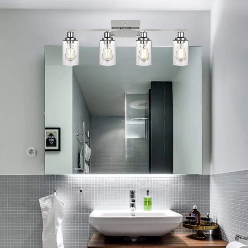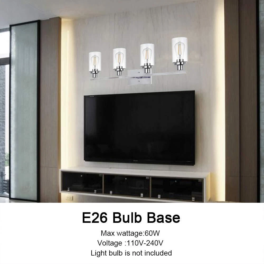 Unique Design: This wall sconce ideal for striking a balance between strength and elegant beauty. Encased in attractive clear glass cylinder maximizes light output for an optimally bright ambience. The wall mount light design allows for this sconce to be installed in an upwards or downwards position Easy Installation: All mounting hardware required for installation are included in the package. Just need to follow the illustrated instructions provided for assembly and installation Bulb Type: Support any LED/CFL/or other less than 60W bulbs with E26 Base for this wall sconces(Bulbs NOT Included), Could be fully dimmable when used with dimmable bulbs and compatible dimmer switch Application: Ideal as a bathroom vanity light fixtures, living room sconces wall lighting, wall lights bedroom or porch light fixtures wall mount and so on, the clear glass shade sconces adds a modern decor touch Dimensions: Bathroom Light: 10.4" (H) x 31" (L), Back plate: 4.72" (H) x 7.9" (L), Clear Glass Shade: 6" (H) x 4" (Opening). The bathroom lights design allows for this sconce to be installed in an upwards or downwards position