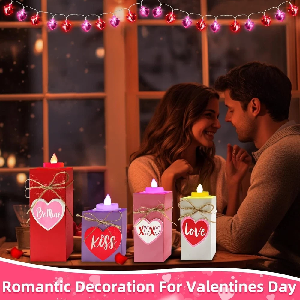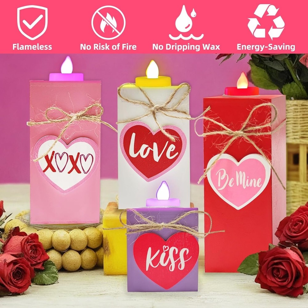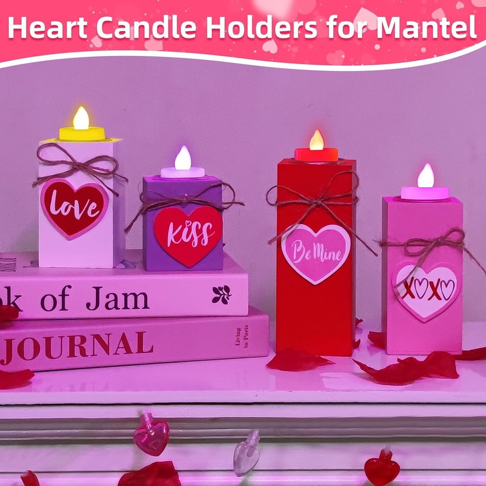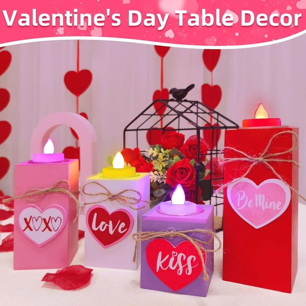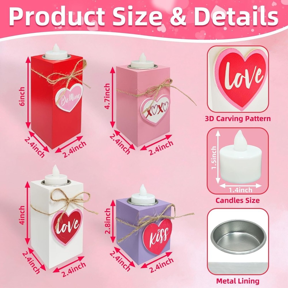 4PC Valentines Wooden Heart Flameless Candle Holders, Multicolor - Free Shipping About this item 4 Pack Valentine's Day Wooden Heart LED Candles: Includes 4 wooden teacup candle holders of 4 different heights, paired with 4 LEDs candles, providing an ample quantity and warm color scheme to meet your Valentine's Day decoration needs Valentines Romantic Design: Home heart-shaped decors in classic Valentines colors of red pink white and purple; Candle holders are adorned with 3D hearts, "kiss" and "love", perfect for your home on Valentines Day to add romantic atmosphere Safe and Durability: Red pink white purple candle holders are made of premium wood with a smooth surface; Not easy to fade warp or break; LED candle is powered by 3 button batteries (included), no harmful gases or fire hazards, safe for kids and pets 4 Size Fit Most Occasion: 4 uniquely sized wooden candle holders, length and width are 2.4”, heights are 2.9", 4", 4.7", 6"; Included candles are approx 1.4" x 1.5"; They can be used as a set or placed individually on dining table, mantel, bedroom Valentines Day Decorations: Romantic candle holders are suitable for dining tables, mantelpieces, desks, windowsills, bedrooms, living rooms, anniversaries, weddings and dinners; They can make a sweet gift for lovers family friends on Valentines Day Product Description 【Product Specification】 Quantity: 4 Size: Purple candle holder: 2.4 * 2.4 * 2.8 in (L*W*H) White candle holder: 2.4 * 2.4 * 4 in (L*W*H) Pink candle holder: 2.4 * 2.4 * 4.7 in (L*W*H) Red candle holder: 2.4 * 2.4 * 6 in (L*W*H) Candle: 1.4 * 1.5 in (D*H) Color: red pink white purple Material: plastic, wood Light color: red, pink, purple, warm white Light mode: constant light Power supply: 3 button batteries (LR1130) (included) Applicable occasions: table, dining table, mantelpiece, desk, window sill, coffee table, bedside table, children's room, girl's bedroom, bedroom, living room, dinner, family, apartment, party bar, indoor and outdoor, Valentine's Day, wedding, proposal, birthday 【Package Includes】 Desktop wooden candle holder with LED candles *4