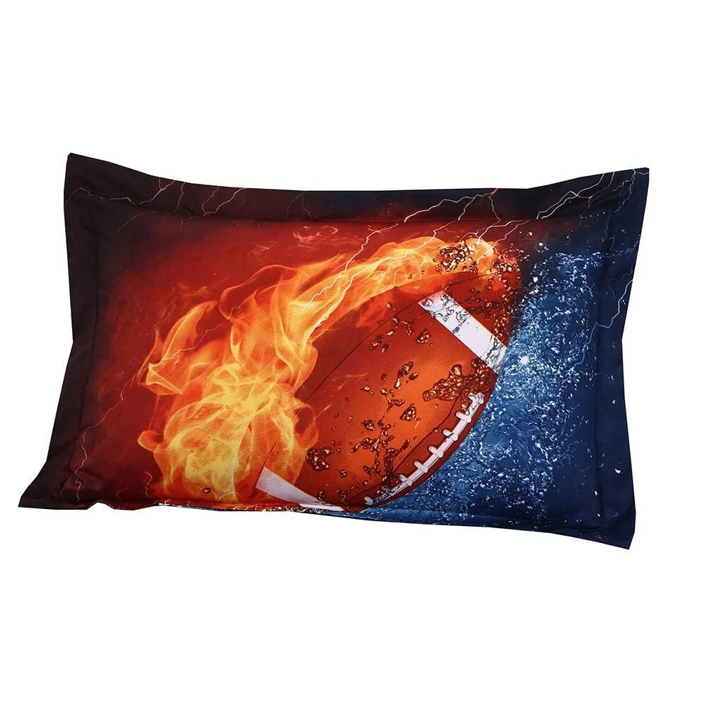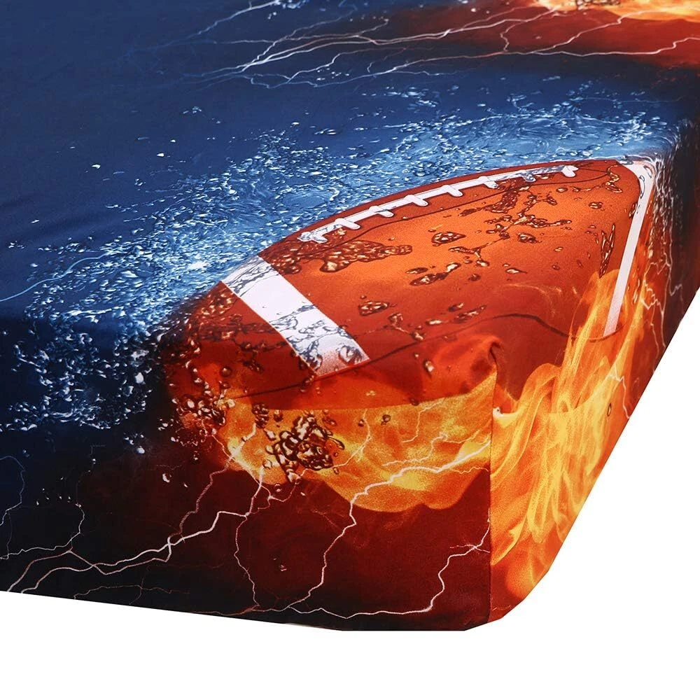 4Pcs American Football Sheets Queen, Bed in a Bag Football Bedding Sheet Set, Soft Microfiber, and Fade Resistant, Sports Sheets for Boys Girls Teens on , Queen Included:The football queen sheet set includes 1 fitted sheet (79”* 60”* 14”)+1 flat sheet (92”* 102”)+2 pillowcase (20”* 30”). Queen sheet set deep pocket with elastic all around, fits mattresses up to 14". Competitive Edge: 3 stitches of work per centimeter make the American football sheets queen size bed set durable. The material used is microfiber, which is soft, fade resistant, lightweight and skin-friendly. Features: Half fiery half watery footballs with a dark blue background has been designed for the football queen size sheets. Our sports sheets set collection will create a new sleeping experience, making you feeling refreshed. Ease of Care: The sports queen size bed sheets are machine washable, simply wash in cold water and tumble to dry. You do not need to iron it. Service: If the football queen size sheets deep pocket are any issue, we are more than happy to solve it for you.
