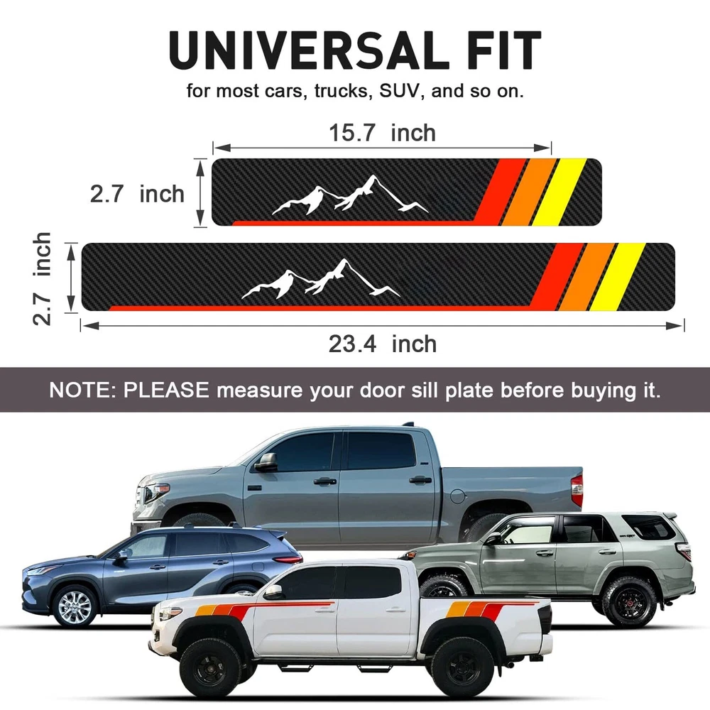 Feature Protective - Prevent scratches and scuffs, and waterproof, non-slip, anti-wear. Eye-catching look - 3D carbon fiber texture + logo image on it, provide the most dramatic effect, make your car look dazzling. Flexible design - you can also cut it to your customizable size to fit your cars. Easy to Install - just peel-n-stick. speical adhesive, no damage to your vehicle. Fitment Universal fit for most toyota vehicles, sush as Toyota Tacoma,Silverado,Camry,Sequoia,Tundra,4Runner, Rav4,Highlander etc. Specification Type: Car Door Threshold Sill Sticker Color: Carbon Fiber Size(approx.): L: 60cmx7cm=23.6"x2.7"; S: 40cmx7cm=15.7"x2.7" Material: 3D carbon fiber (NOT real carbon fiber ) Attachment Method: Self-adhesive Installation Method 1. Pls use alcohol or agent to clean the position of the installation (to make sure it without the grease.Wax or dust etc.) 2. Pls ensure the position of installation can be completely fit the case before install, (Note: if there any questions or misfit , please contact us) 3. Rive the strong double-sided adhesive of the back, if meet the case of a relatively low temperature, please heating it via the hair dryer or lighter 4. According to the comparison stick up it and press about 1-2 minutes (Note:do not wash your car in 24 hours , the adhesive should be fixed after 12 hours ) 5. The installation have been completed.(Easy to install) Package Included 4pcs Door Sill Protectors