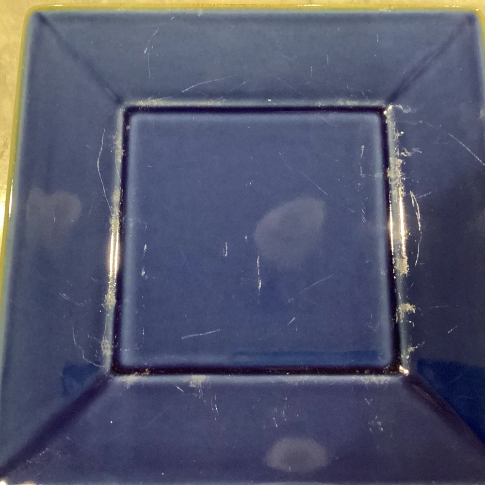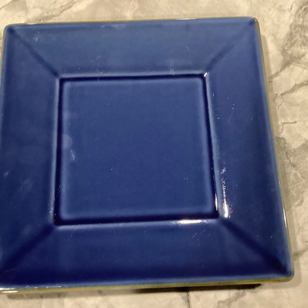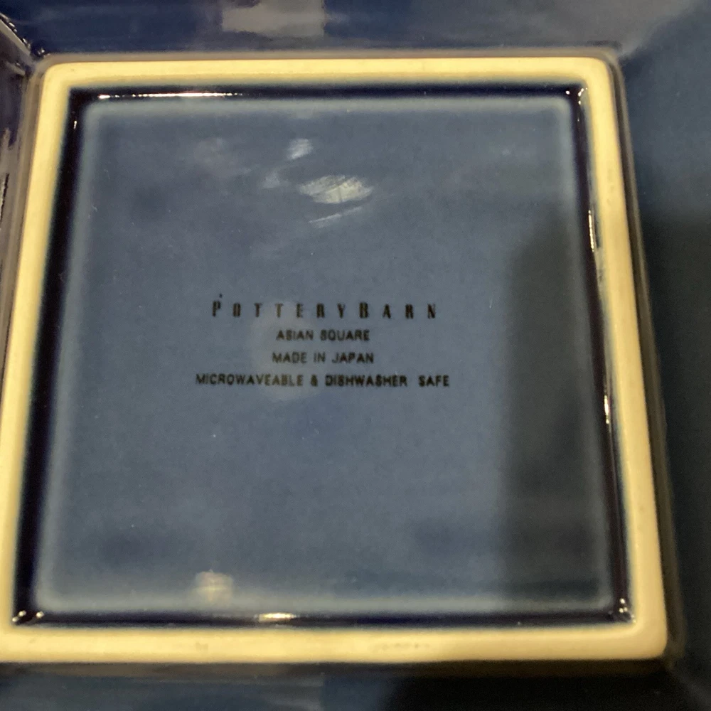 This product is a set of four Pottery Barn Asian Blue square salad/dessert plates, each measuring 8x8 inches. The plates are made of stoneware and have a solid blue color. They feature a contemporary Asian style and are suitable for all occasions. Made in Japan, these plates have one compartment and are ideal for serving salads or desserts. Please view all photos.