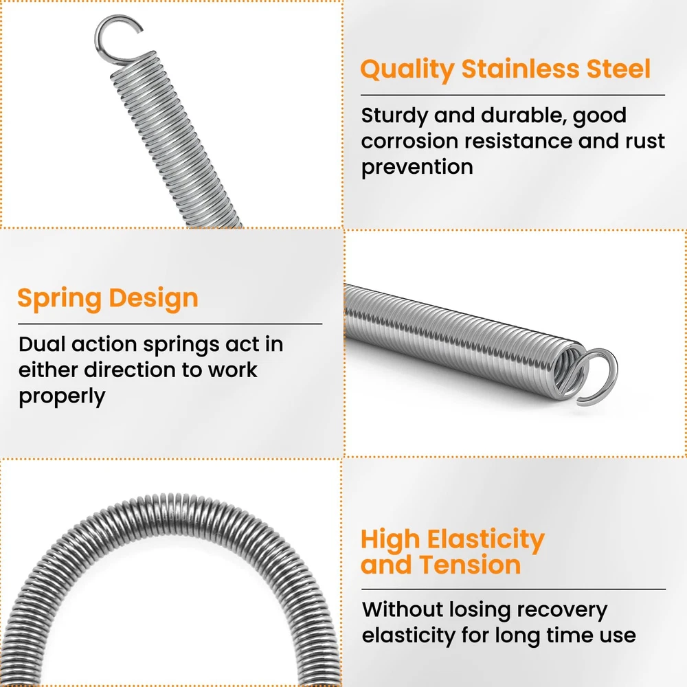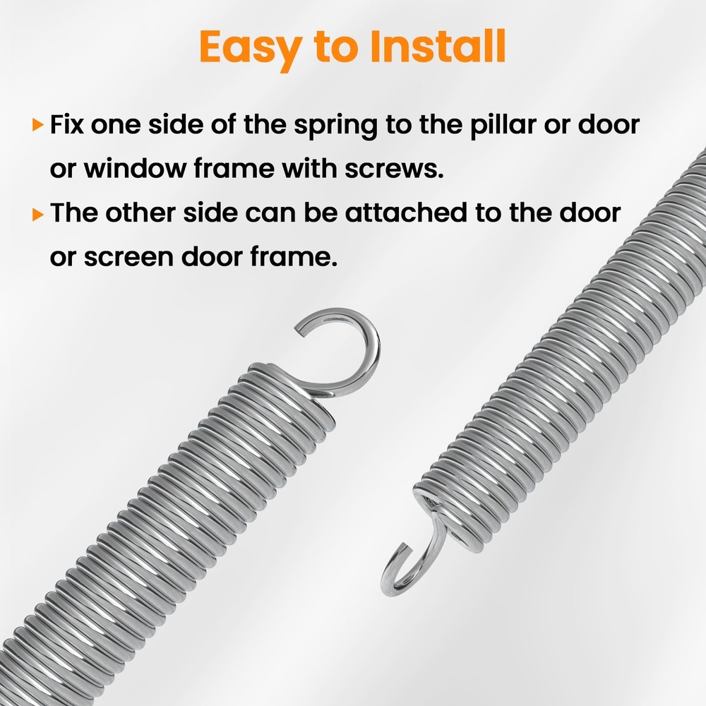 4Pack 1Ft Stainless Steel Self Closing Gate Spring RV Screen Door Spring Closure Self Closing Spring Function: The auto-closing screen door spring is designed to automatically close gates and doors, allowing the door to open fully and close automatically to the closed position. Dual action springs act in either direction to work properly. Material: Made of high quality stainless steel, sturdy and reliable, good corrosion resistance and rust prevention. The spring can provide high elasticity and tensile tension for long time use without losing recovery elasticity. Size and Quantity: 12 inch * 0.25 inch (length * outside diameter) Package includes 4 springs and 8 screws (each spring with two screws) Easy to Install: Fix one side of the spring to the pillar or door or window frame with screws, and the other side can be attached to the door or screen door frame. Wide Applications: Widely used in agricultural fences, garden fences, sheds, furniture, RV screen doors, tent camper doors, automobiles and various doors and windows. Specification Material: stainless steel Length: 12 inch Outer diameter: 1/4 inch Adaptability: Applied to automobiles, household appliances, furniture, machinery and equipment, daily life equipment, sanitation machinery, RV screen doors and various doors and windows. Package Details. 4 Pcs springs, 8 Pcs screws Characteristics: 1. Extension springs can be installed on the doors and windows, which can retract the doors and windows back to the normal position automatically. 2. High quality and high elasticity springs ensure high tensile strength and high tensile strength with long-lasting excellent performance. Shipping We offer FREE shipping on all orders! We ship within Three business days of payment, usually sooner. We use a selection of shipping services such as UPS, FedEx, USPS etc. We only ship to the lower 48 states, no APO/FPO addresses or PO Boxes allowed. Local pickups and combined shipping options are not provided at this time. Return You can return a product for up to 30 days from the date you purchased it. Any product you return must be in the same condition you received it and in the original packaging. Please keep the receipt. Payment We accept payment by any of the following methods: PayPal Please pay as soon as possible after winning an auction, as that will allow us to post your item to you sooner! Feedback Customer satisfaction is very important to us. If you have any problem with your order, please contact us and we will do our best to make you satisfied. Contact Us If you have any queries, please contact us via ebay. We usually respond within 24 hours on weekdays. Please visit our eBay store to check out other items for sale! Thank you for shopping at our store.