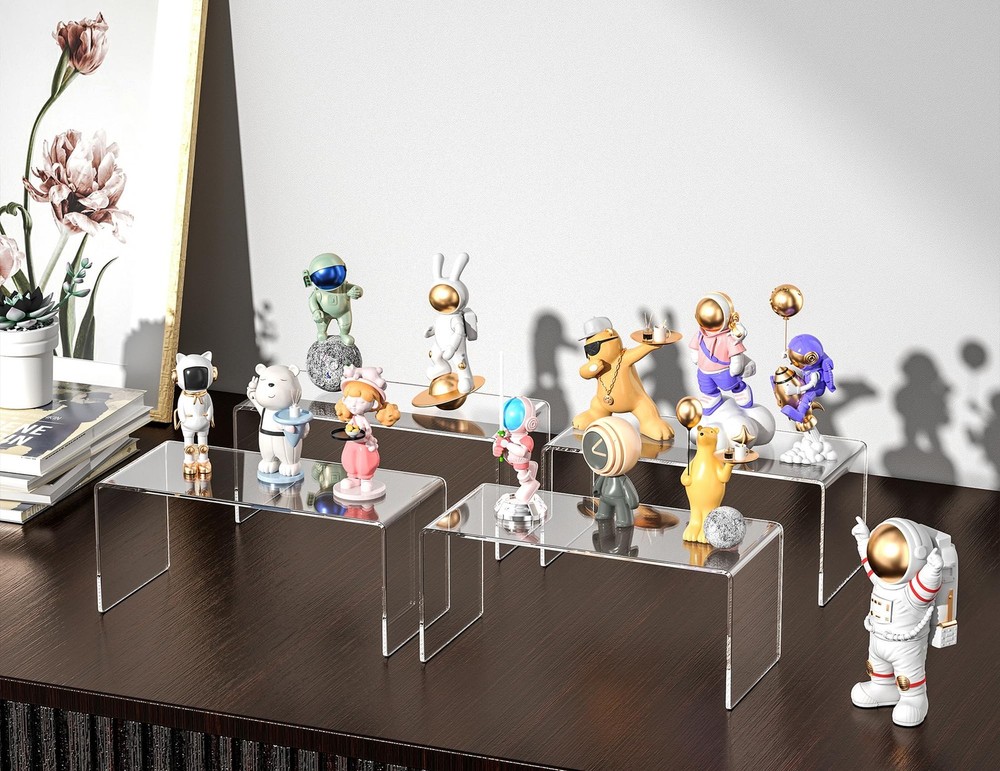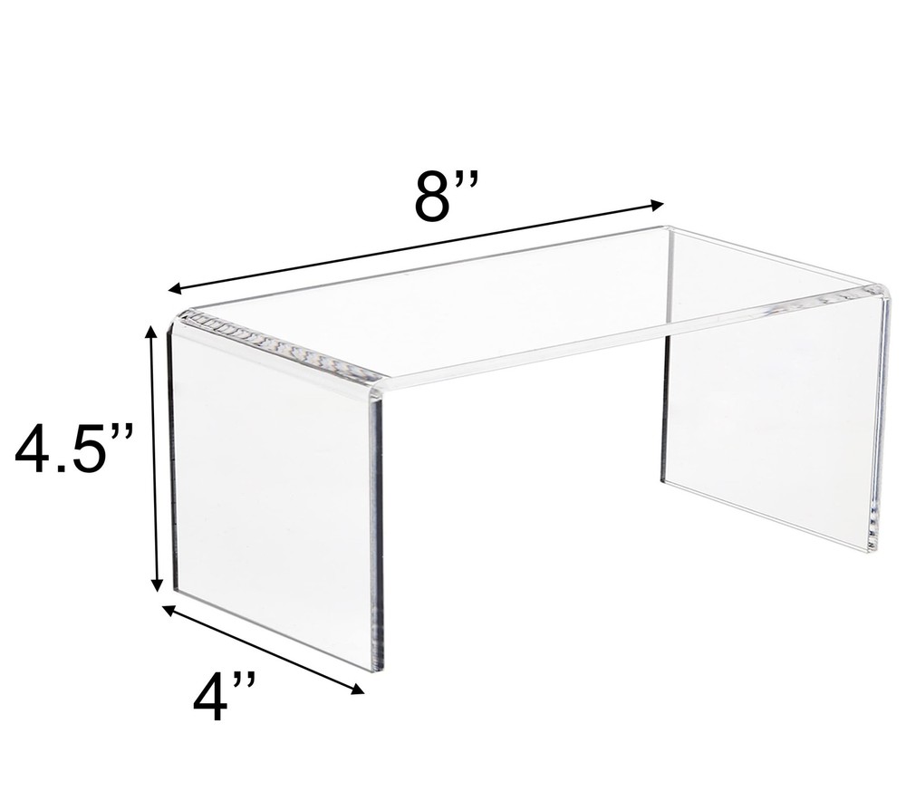 Made from 5mm thick, clear flame polished prime grade acrylic glass. These showcase display stands can be placed anywhere in any occasion, it can be applied to display jewelry, food, toys and more Made from 5mm thick, clear flame polished prime grade acrylic glass Figures Display stands- These Claytonic acrylic display riser works great for showcase Funko Pop Figures, Nendoroids and Amiibos. Figures Display stands- These Claytonic acrylic display riser works great for showcase Funko Pop Figures, Nendoroids and Amiibos. Dessert Table Display- The display riser was made of crystal clear acrylic plexiglass, it is perfect to fit in any event to showcase your special cakes, cupcakes and other treats for your candy table at birthday party, wedding party. Package included- 4 packs of 8W X 4D X 4.5H Inches acrylic riser shelf.