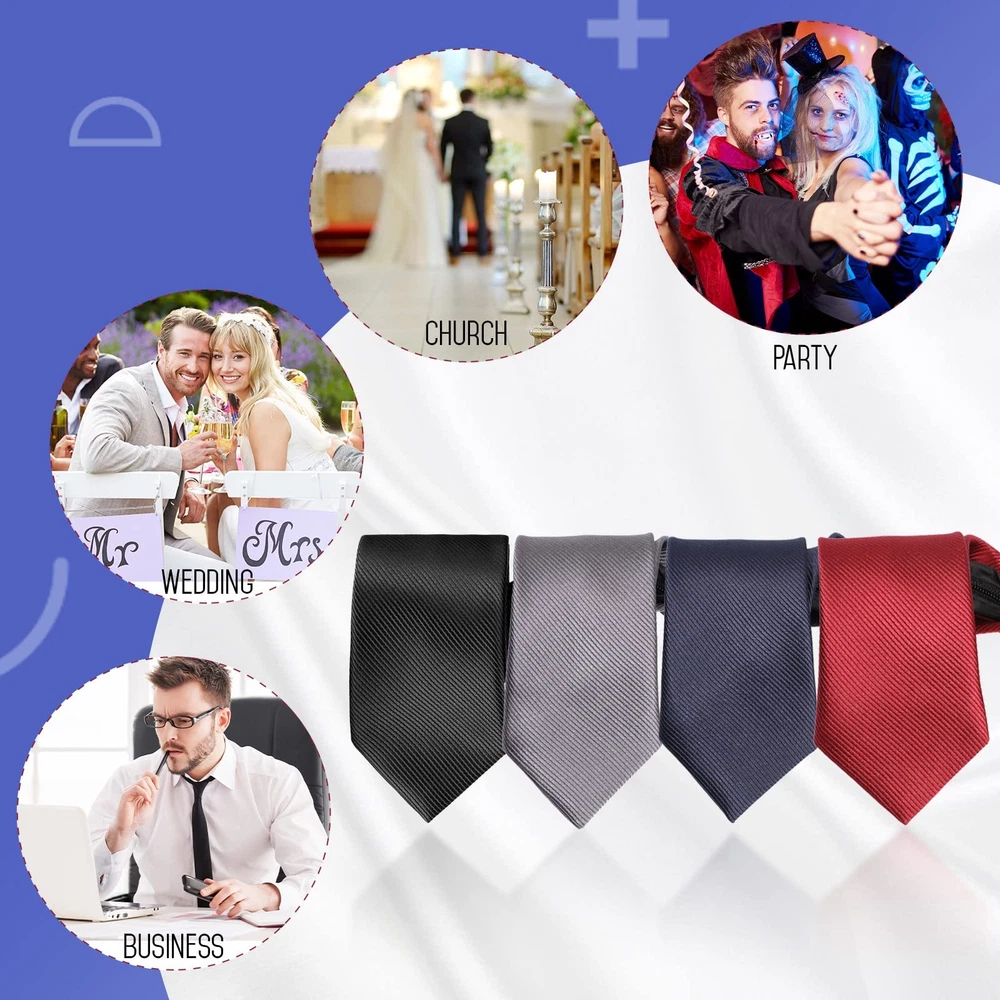 Features: Versatile to match: Our solid color ties are suitable for matching with suits, tuxedos, shirts, vests, suspenders, etc. You can also match them to your own needs or ideas to form your own style. Carrying maturity: A tie is often considered a symbol of a mature man. You can prepare such a zip dress tie for your son or brother at the age of 18, not only to celebrate his coming of age, but also to let him feel the maturity, responsibility and commitment of a grown man. Specifications: Material: polyester silk and zipper Color: as pictures show Size: one size, approx. 19 inches/ 48 cm in length, the widest part of the tie is 2.35 inches/ 6 cm Package includes: 4 x Solid color zipper ties Notes: Manual measurement, please allow slight errors on size. The color may exist slight difference due to different screen displays. Amount of packaging: the package comes with 4 pieces of zipper ties available in solid color, enough quantity and versatile color to meet your needs of wearing and matching different clothes, adding seriousness to you Universal fit: the clip on neck tie fits a neck size of about 7.5 inches (loop diameter), the length of the tie is 19 inches/ 48 cm, the widest part of the tie is 2.35 inches/ 6 cm, the proper size for most men, you can adjust it according to your own needs to make it fit Serviceable material: the clip on ties for men is made of polyester silk and zipper, features fine workmanship, smooth and flat appearance, not easy to deform, reliable material to provide you with a long time of service Easy to wear: these solid color neckties are pre-tied ties, which are easy to wear, adjustable zipper, you don't need to spend too much time wearing them, even for tie beginners, these slim ties are pre-tied with a neat knot, giving you convenience and efficiency Suitable gifts: classic and modern solid color skinny zipper ties are suitable for various formal, professional or casual occasions, you can prepare such ties for your husband on your anniversary, for your father on Father's Day, for your brother on his birthday, for Valentine's Day to show your care and love