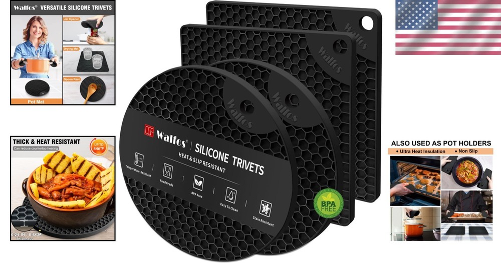 Versatile Silicone Trivet Mats: 4 Black Non-Slip Hot Pads for Every Kitchen ‹ › ‹ › ‹ › ‹ › ‹ › ‹ › ‹ › ‹ › ‹ › ‹ › Versatile Silicone Trivet Mats Set of 4 Black Non-Slip Hot Pads for Every Kitchen Key Features: Non-Slip and High Heat Resistant: These trivets for hot dishes withstand temperatures from -104℉ to 446℉, safeguarding your countertops and tables from hot pots and pans. High-Quality Silicone and Food Safety: Crafted from food-grade silicone, BPA-free and long-lasting, these trivets resist rust, cracking, and chipping, making them a light and flexible alternative to metal options. Multi-Function: These hot pot holders serve various purposes as silicone mats, drying mats, jar openers, spoon holders, garlic peelers, and coasters. (Sizes: Square Trivets: 7.1" x 7.1", Round Trivets: 7" x 7", Thickness: 0.24") Easy to Dry and Clean: Designed to capture water vapor and condensate, simply squeeze out or shake to dry. Dishwasher safe or hand-wash for easy maintenance. Easy to Use and Store: Lightweight and convenient, they can be stored easily on your table or hung on hooks, ensuring a clean and tidy home at all times. Benefits: Protects surfaces from heat damage, keeping your dining area safe and stylish. Multi-functional design that provides versatility in any kitchen setting. Lightweight and portable, making it easy to use for any cooking task or event. Effortless cleaning process adds to your kitchen efficiency. Why Choose Our Silicone Trivet Mats? Invest in the essence of culinary convenience with our Silicone Trivet Mats, meticulously designed to elevate your kitchen experience. As a part of your kitchen arsenal, these hot pads not only protect your surfaces but also adapt to a myriad of tasks, showcasing flexibility and durability. Crafted with silicone, they exemplify safety with a non-slip design ensuring your pots and pans stay secure. Join the ranks of countless satisfied customers who have transformed their kitchen dynamics. Experience the perfect blend of function and aesthetics today! Order your set of Versatile Silicone Trivet Mats and redefine culinary elegance in your kitchen! Shipping Free & Fast Shipping - We offer free shipping to most of the USA with a normal delivery time of 3-7 days. However, due to the current situation, additional delivery time (up to 3 weeks) may be required for some items. Alternative Carriers - We may use alternative carriers (e.g. USPS, FedEx, UPS, etc.) to ensure your package arrives safely and on time. Due to the use of multiple carriers, we are unable to provide a tracking number automatically. Handling Time - Orders are processed and shipped within 1-2 business days of receiving cleared payment. Shipping Restrictions - Shipping to Alaska, Hawaii, Puerto Rico, Guam, and other US territories may incur shipping charges or delivery restrictions. Please contact us before ordering, or your order can be refunded/cancelled. State Restrictions - There may be restrictions based on your state of purchase. For example, certain items may not be shipped to California due to state regulations. Contact for Tracking Updates - If you require tracking updates or have any concerns about the delivery of your order, please feel free to contact us, and we will be happy to assist you. Return 30-Day Hassle-Free Returns - We want you to be completely satisfied with your purchase. If you are not, you can return the item within 30 days of receiving it for a full refund or exchange. Easy Return Process - To start a return, simply contact us and we will provide you with a prepaid return shipping label and detailed instructions. Restocking Fee - There are no restocking fees for returns. However, the buyer is responsible for return shipping costs if the return is not due to a seller's error. Refund Processing Time - Refunds will be processed within 5 business days of receiving the returned item in its condition. Payment We accept all major credit cards, PayPal, and Apple Pay for your convenience. Your payment information is secure and encrypted to ensure a safe and seamless transaction. Please complete your payment within 3 days of purchase to avoid any delays in shipping. Feedback Your feedback is extremely important to us. We strive to provide the best products and customer service possible. If you are satisfied with your purchase, please take a moment to leave us a positive review. If you have any concerns or issues with your order, please contact us before leaving negative feedback. We are committed to resolving any problems and ensuring your satisfaction. Contact Us If you have any questions or concerns, please feel free to out to our customer support team. You can contact us through the eBay messaging system. We are available Monday to Friday, 9:00 am to 5:00 pm EST, and we will do our best to respond to your inquiry within 24 hours. Buy it now and enjoy a pleasant shopping experience! Unit Quantity: 4 Material: Silicone,BPA Free Department: Adults,Unisex Theme: Silicone Trivet Mats Occasion: Multipurpose,Home,Kitchen Set Includes: Pot Holders Features: Dishwasher Safe,Heat Resistant,Non-Slip,Flexible,Long-Lasting,Lightweight Color: Black Type: Pot Holders Number of Items in Set: 4 Style: Modern Size: M Care Instructions: Dishwasher Safe
