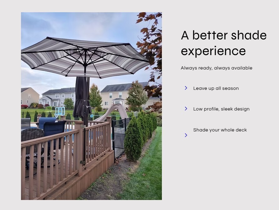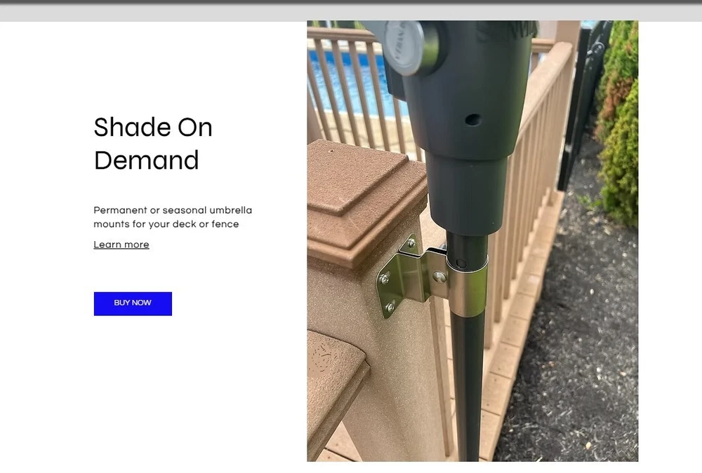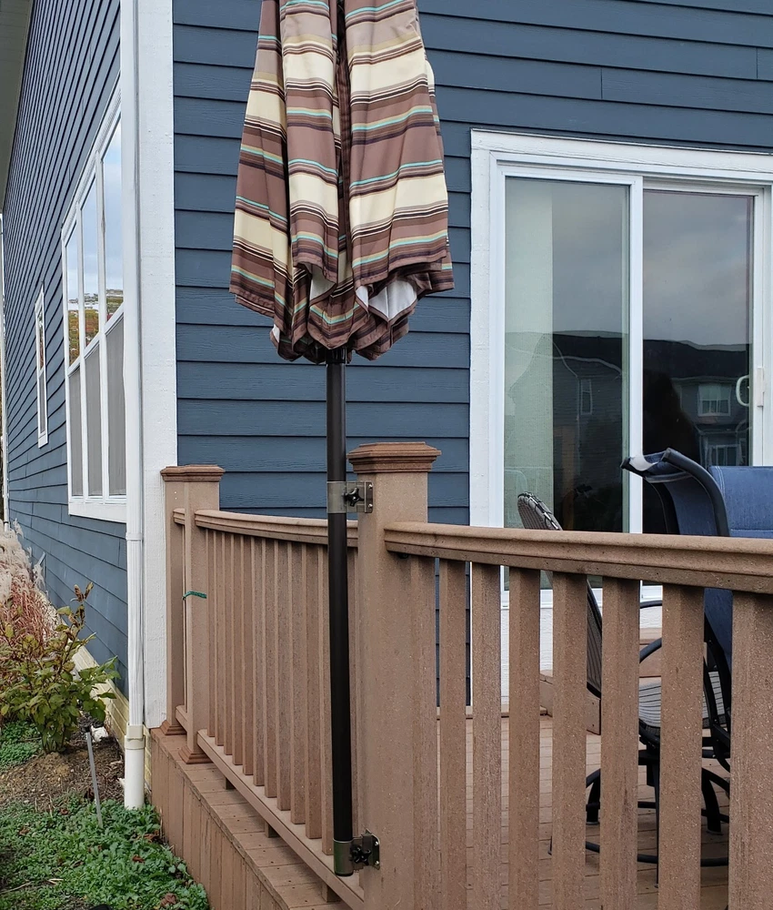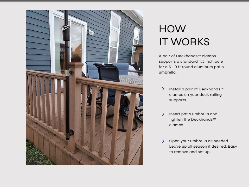 Shade On Demand Permanent or seasonal umbrella mounts for your deck or fence posts One Piece Patented Stainless Steel design. 4 Pack Deckhands™ clamps - flat mount for wood: Designed to hold a 1.5-inch diameter pole Includes 4 individual flat mount Deckhands™ clamps (to support four umbrella poles) and 32 mounting screws for installing directly onto wood supports. The screws are stainless steel #12 - 1.25 inches long. Have a smaller pole? perhaps string light pole? check out our Adapters… Made in Rochester, New York , U.S.A. About Us: 20 years ago we wanted a better shade solution for our own deck. We made some home-made solutions which over the years became the Deckhands™ clamp system.