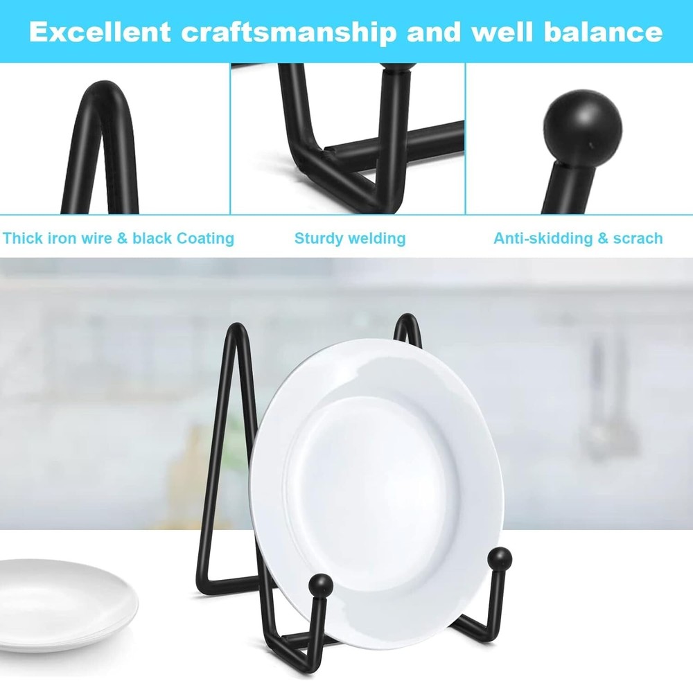 Ouskr 4 Pcs 4-1/4 Inch Plate Stands for Display, Metal Iron Picture Frame Holders Stand for Book Photo Small Easels Plaque Dish Art Tabletop Decorative Black About this item What You Get: 4 pcs* 4-1/4 inch plate stands for display, it fits the item which the height from 5 inch to 12 inch. Stability and Sturdy: This plate holder display stand usesthicker metal wire as the raw material, strong and durableand. Triangular design for enhanced stability. Elegant Contemporary Design: The plate holder display stand is designed with a matte black finish which prevent from rusting. With simple structure and color, it is a simple, elegance and practical stand for you. Wide Applications: It can be used as decorative plate stand, picture stand, photo holder, small book display stand, plaque stand, postcard holder, card display stand, art display stand or easel stand for wedding sign. Quality You Can Trust: The plate stands for display are made of high quality metal materials and our Ouskr team is confident enough in the quality of the products to last for years.