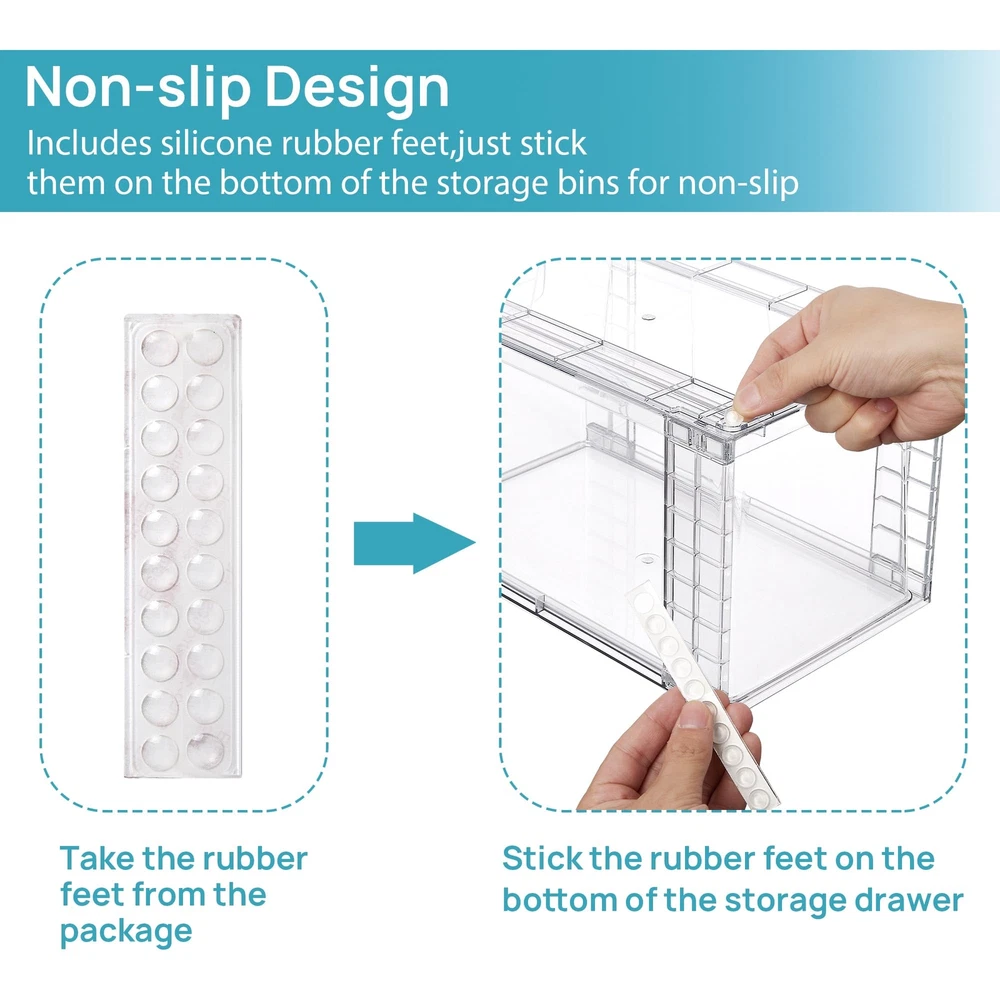 Stackable Design---The top of the drawer has a groove design to ensure that it is not easy to collapse when stacked. Stacking helps maximize the use of vertical storage space, saving space and keeping your space organized Easy Installation---Just insert the connecting holders into the groove of the bottom plates and install the upper plate.Then you will get large capacity storage drawers Drawer Structure for Easy Access---The storage box has built-in guide rails and can be pulled out smoothly. Just pull out the handle and you can easily access what you need, making life simple and efficient. It is also equipped with anti-slip silicone pads to make the box more stable and prevent it from sliding when pulled out Transparent and Visible---The storage container is made of PET plastic. The transparent visual storage organizer can help you find what you need quickly without having to worry about rummaging around in a pile of clutter, which will save you time Multiple Uses---Perfect for a variety of places in the home, they fit under the bathroom/kitchen sink, in the pantry, in cupboards, in the refrigerator, and more. It can organize daily necessities such as facial creams, facial cleansers, facial masks, cosmetics, medicines, office supplies, snacks, fruits, etc. The top is flat, thus providing extra space for other items