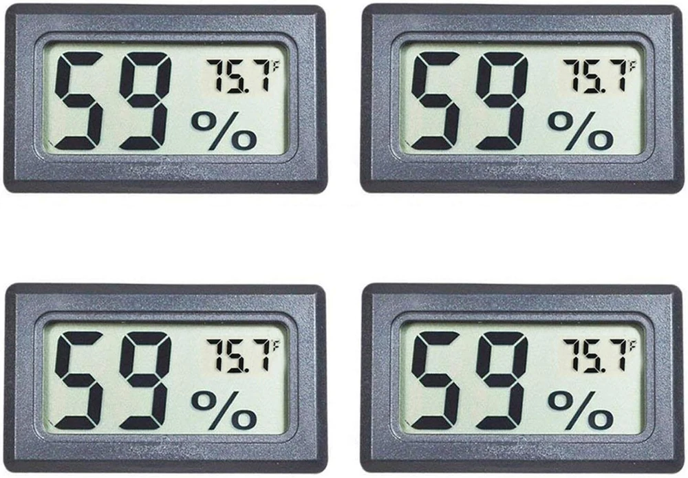 4-Pack Mini Digital Temperature Humidity Meters Gauge Indoor Black Product Details Color: Black Brand: Veanic Product Dimensions: 1.89"W x 1.13"H Item Weight: 0.01 Ounces Battery Description: LR44 Mini Digital Humidity Thermometer allows you to easily know the temperature and humidity around you 2in1 meter with built-in probe; digital electronic thermometer and hygrometer for measuring temperature and humidity for indoor use Fahrenheit (°F) display, this thermometer displays temperature in Fahrenheit; Size: 1.89" x 1.13" x 0.6" (48mm x 28mm x 15mm) Temperature measuring range: -58℉-158℉ ; Humidity measuring range: 10%-99%RH (Measures conditions every 10 seconds) Temperature measurement accuracy: ±2℉; Humidity measurement accuracy: ±5%RH The mini hygrometer thermometer widely use in jars, reptile tank, guitar case, incubators, brooders, office, green house and any other place that requires monitoring of temperature and humidity levels Accuracy The humidity measuring range: 10%-99%RH with ±5% RH tolerance; the temperature measuring range: -58℉-158℉with ±2°F tolerance Mini size Mini Size making it ideal for use in jars, incubators, brooders,reptile tank, guitar case any other place Long Battery Life This Mini hygrometer thermometer is powered by 2 LR44 battery that provides 12-18 months of battery life. (Include 4 LR44 Backup Batteries) NO BACKLIGHT FUNCTION Specification: Type: Digital Thermometer Hygrometer Dimension: 1.89 x 1.13 x 0.6" (48 x 28 x 15mm) Humidity measurement range: 10%-99% Humidity measurement accuracy: +/-5% Humidity sampling period: 10 seconds Battery Type: LR44 button batteries Temperature measurement range: -58℉-158℉ Temperature measurement accuracy: ±2℉ (under normal temperature) Function: Measuring temperature and humidity Package: 4 x Digital Thermometer Hygrometer (Battery Included) 4 x LR44 Backup Batteries