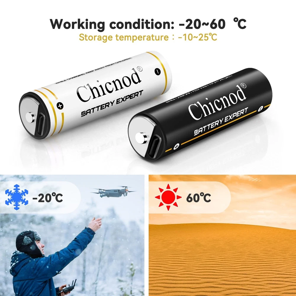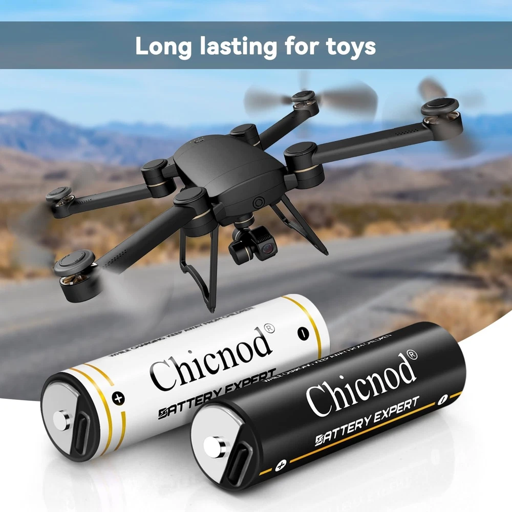 4Pack Rechargable AA Lithium Batteries, 3300mWh Double A Battery 1.5V Constant Output Lithium ion Double A Battery Long Lasting USB Fast Charging Product Details Number of Items: 4 Brand: CHICNOD MPN: 2AC-60 UPC: Does not apply EAN: Does not apply Number of Batteries: 2 A batteries required. (included) Brand: CHICNOD Battery Cell Composition: Lithium Ion Recommended Uses For Product: Toys Remote Control Flashlight, Gaming Controller Unit Count: 1.0 Count Product Dimensions: 3.94 x 3.7 x 0.79 inches Item Weight: 3.84 ounces Item model number: 2AC-60 Batteries: 2 A batteries required. (included) Date First Available: October 9, 2023 Manufacturer: Qinuo Dianzishangwu Shenzhen Youxiangongsi Country of Origin: China Lithium Batteries AA:High Capacity AA Li-ion batteries with 3300mWh Lithium ion battery,low self-discharge rate and long lasting use give you a better experience when playing electronic toys. Lithium ion battery has a better performance, it is lightweight and with a portable protective case very easy to storage. Quick Charge AA Batteries:Quick charge within 1.5hours and 2.5hours for standing charging speed. Comes with 2 usb to type c charging cord,1 black+ 1 in white. Do not need a battery charger, you can charge the batteries with any power source with USB port. Chicnod 4pack aa batteries can be fully charged within 1.5 hour for fast charging mode,2.5H by standard charging speed, comes with USB C 2 in 1 charge cable (1 Black,1 white),it not require any batteries charging adapter, it powered by USB power source like power-bank,power slot with USB bay ,DC or AC adapter or computer, laptop,easy to charge. Green led light indicates the charging is in processing ,and when it is green is fully charged. Safe Guarantee:Built-in PCB Protective Chip,to protect aa batteries from over-charge,over-discharge,over-heat and short-circuit. NOTE: DO NOT Use constantly for high current draw products, when the batteries discharge current higher than 2A it will be automatically shut off because of the over-current protection design. It is safe to use and charge. Precautions:1. Working condition:-20~60C Storage temperature:-10~25C 2. Please contact us if there anything need our help.