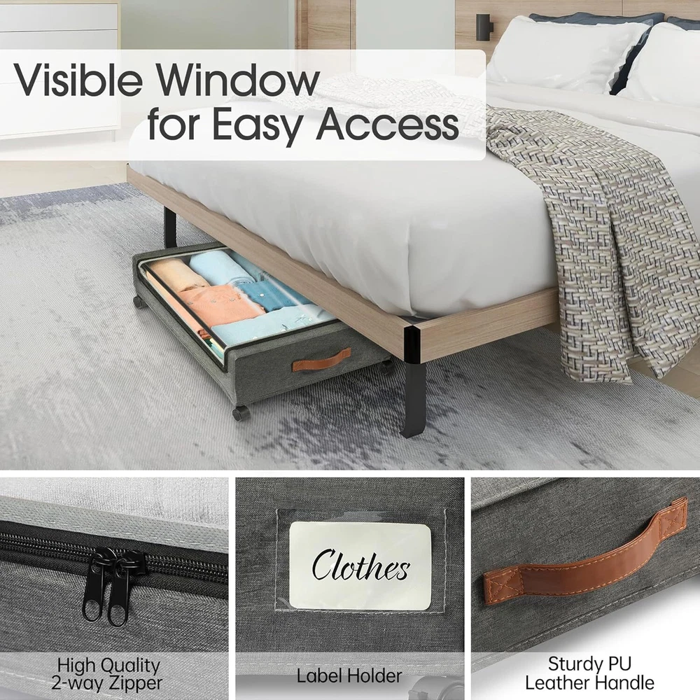 Hold Up to 66lbs: under bed storage with wheels is made of high quality 600D oxford fabric and sturdy metal frame, can hold up to 66 lbs, stronger than other fragile metal mesh, spacious capacity perfect for storing clothes, toys, books, shoes and other heavy items also won't compromise stability and durability 360°Rotating Silent Wheels: Say goodbye to constantly carrying heavy storage boxes around your house.This under bed rolling storage comes with 4 x 360°rotating wheels,two of which have locking function.When you need it to remain stationary, just press the locking mechanism gently. No matter how full the cart is, adults and children can easily slide on the floor and carpet Clear Window & Label: Our rolling underbed storage bins are equipped with a Clear window, you can clearly see the stored items, say goodbye to the trouble of misplacing items. Additionly, the included label is great for labeling contents, allowing you to quickly identify and find the item you're looking for without having to open multiple containers or boxes Versatility: Under bed shoe storage dimensions:30.71 x 16.93 x 6.69 inches (with wheels), (applicable under-bed height > 7in), large capacity exceeds your expectation to store more daily items. It can be placed under beds, sofas, tables, and closets to maximize unused space. In addition, this under bed storage drawers can be folded up when not in use, perfect for small families and college dorms that need extra storage space Easy to Install: This rolling storage bin is designed to easy installation and hassle free.Including user-friendly instruction and require minimal effort to set up, which also means you can quickly install and utilize the underbed storage space,saving valuable time and effort,ideal for bed rotting, the blind, and seniors with mobility issues