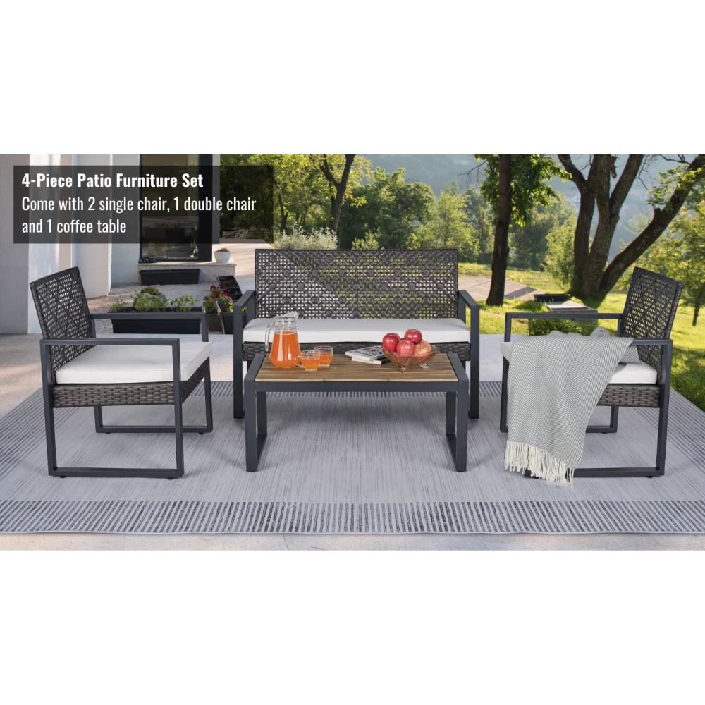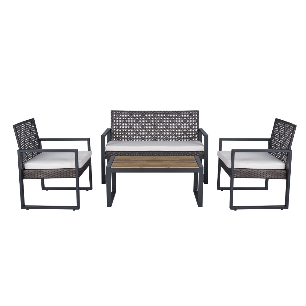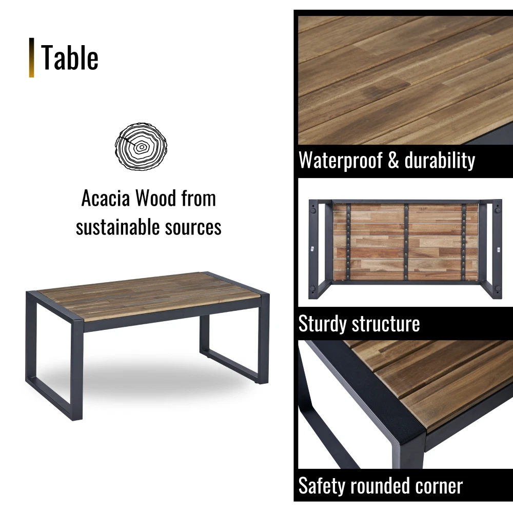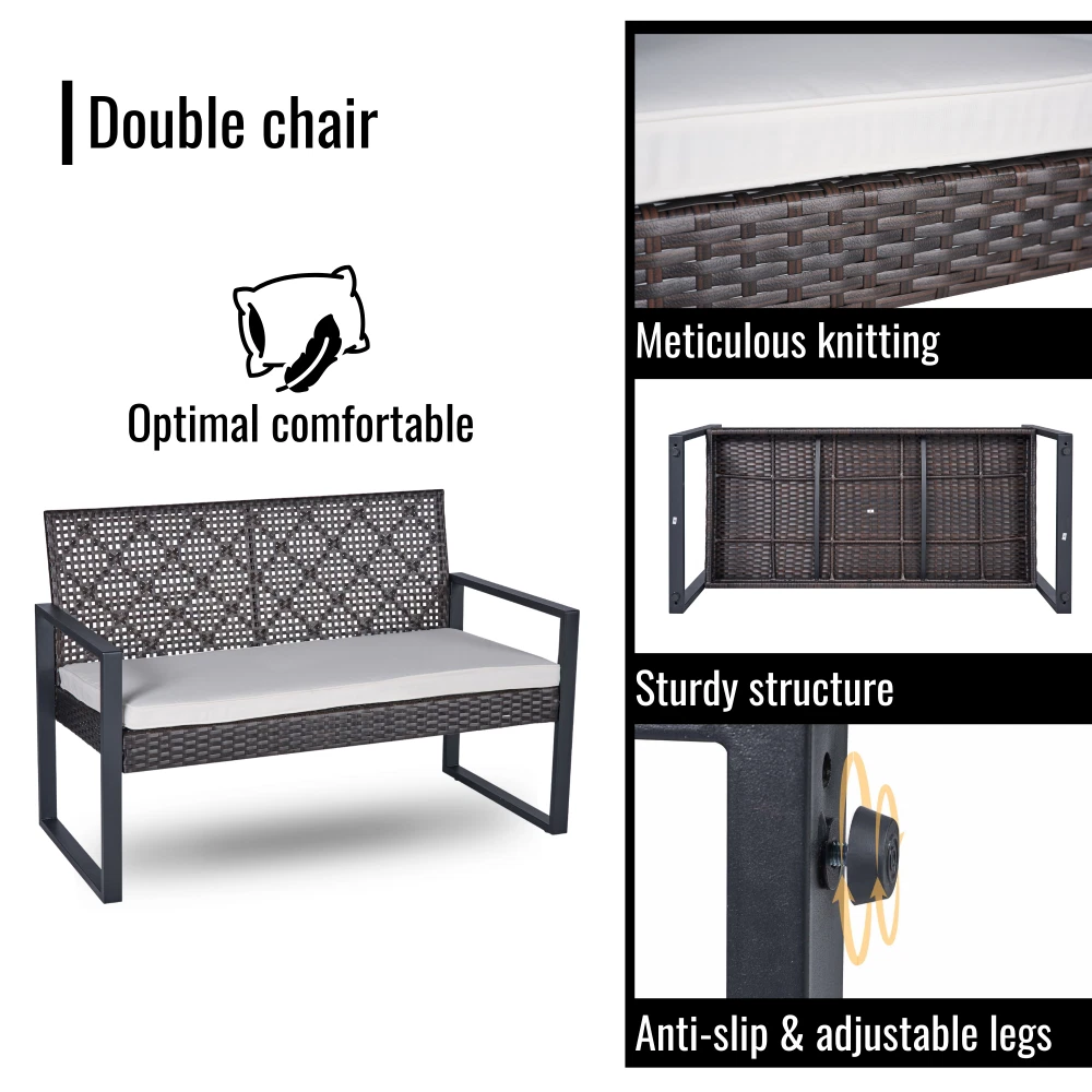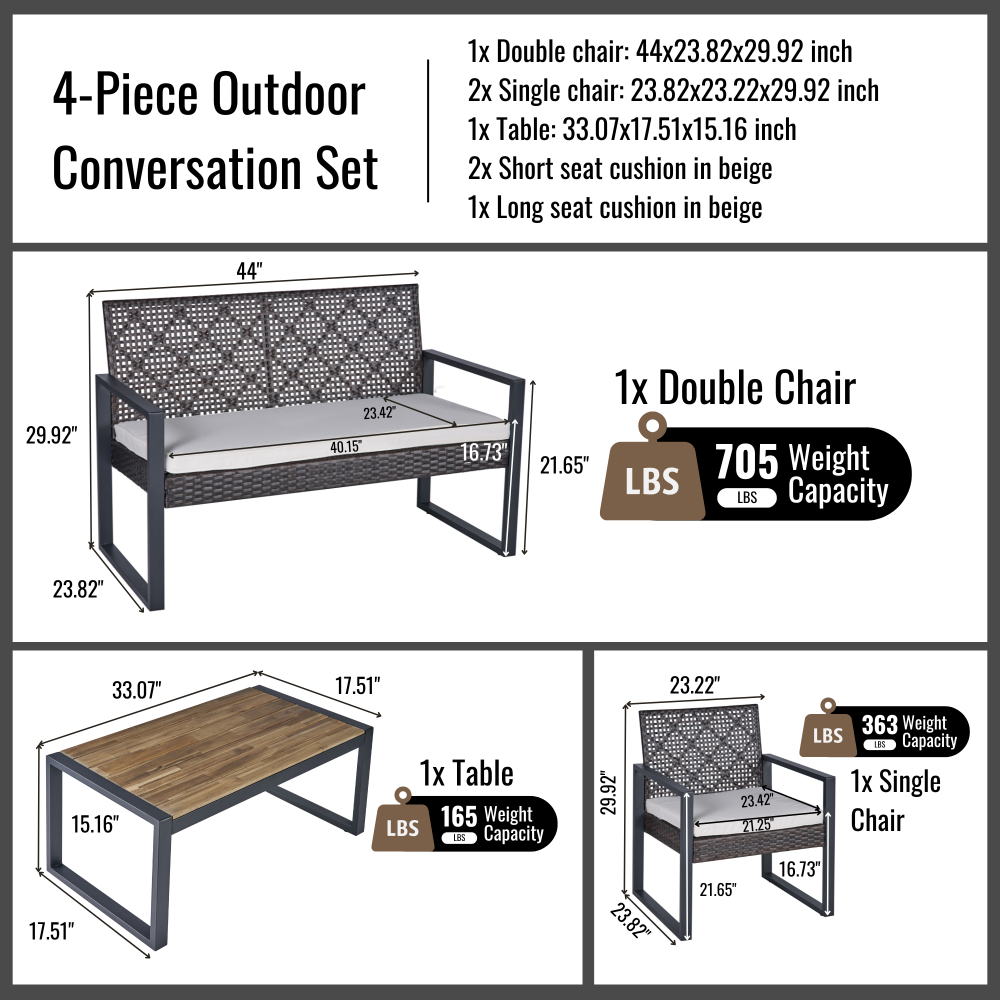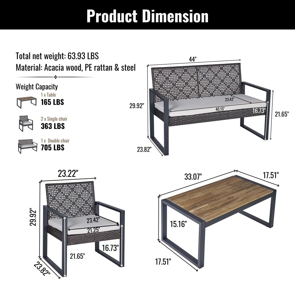 MODERN SET IN COZY HOME: Versatile and stylish outdoor patio furniture set, designed to elevate your outdoor living space with comfort and elegance. Crafted from high-quality PE rattan, powder coating frame with solid acacia wood, this set combines durability with a sleek aesthetic, perfect for any patio, balcony, porch, garden, backyard and lawn. NATURAL LOOK TABLE: Conversation patio furniture set brings a unique blend of rattan and wood. The natural look from sustainable solid acacia wood and the modern look of modern brown rattan is perfect for any space. Complete the assembly with few steps and enjoy leisurely moments outdoors. with drinks, snacks, or decorative accents. STURDY CHAIRS: The spacious double chair provides ample seating for two individuals, allowing you to unwind and enjoy the outdoor moments. Its ergonomic design ensures optimal comfort, while the sturdy plastic rattan construction guarantees long-lasting use and a high weight capacity of up to 705 lbs for double chair and 363 lbs for single chairs. All of the chair legs own adjustable nuts which brings to comfortable experience. DURABILITY MATERIAL: Durable and weather-resistant materials hold up to the elements; anti-rust and anti-corrosion treatment thanks to qualified polyester rattan, high-quality powder coating frame, UV tested cushion cover and acacia wood with water-based oil protection. ONE SET: includes one dounle chair size 44 x 23.82 x 29.92 inches; two single chairs size 23.82 x 23.22 x 29.92 inches, one table size 33.07 x 17.51 x 15.16 inches, clear instruction paper and extra a free part of hardware for replacing in case needed. Product Material Rattan Made by polyester, can be recycled, mixture light brown color Frame Steel with powder coating, black color Cushion Cover: Polyester fabric, density 160gsm, waterproof, black color Polyester wadding and a non-woven fabric layer batting cushions Zipper: yes / removable Wood Thickness 12mm, Acacia solid wood from sustainable sources Weight Capacity Double chair 705 lbs Single Chair 352 lbs Table 155 lbs Certificate ISO 9001:2015 Factory ISO 105 B02:2014 Fabric