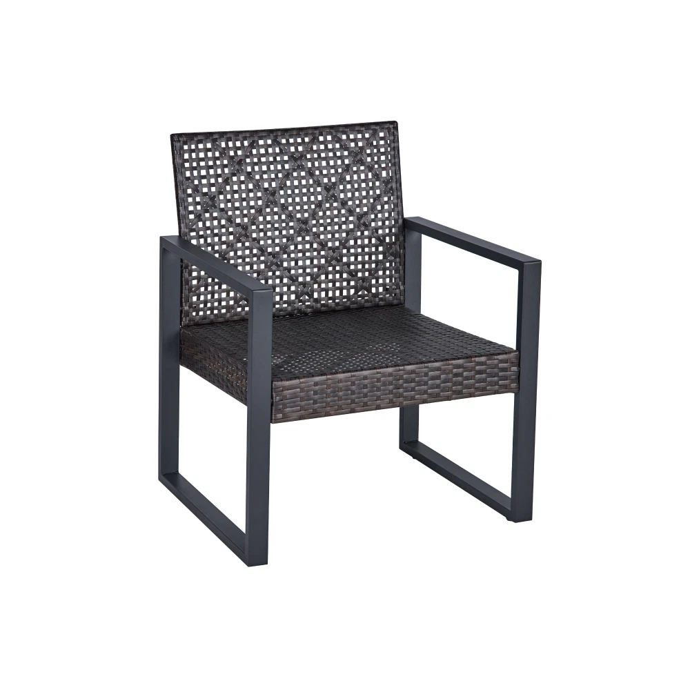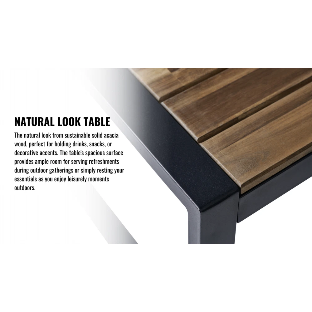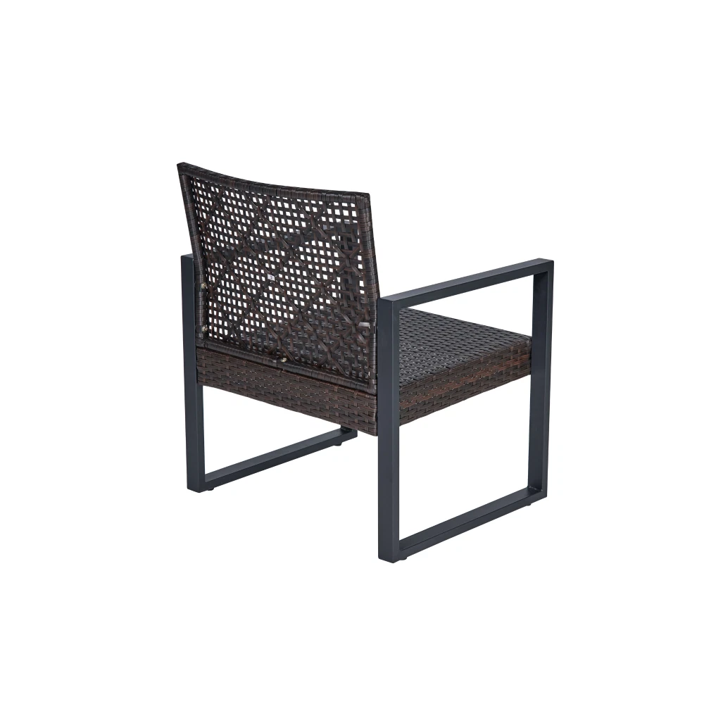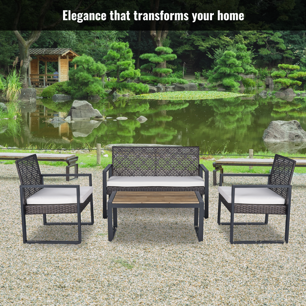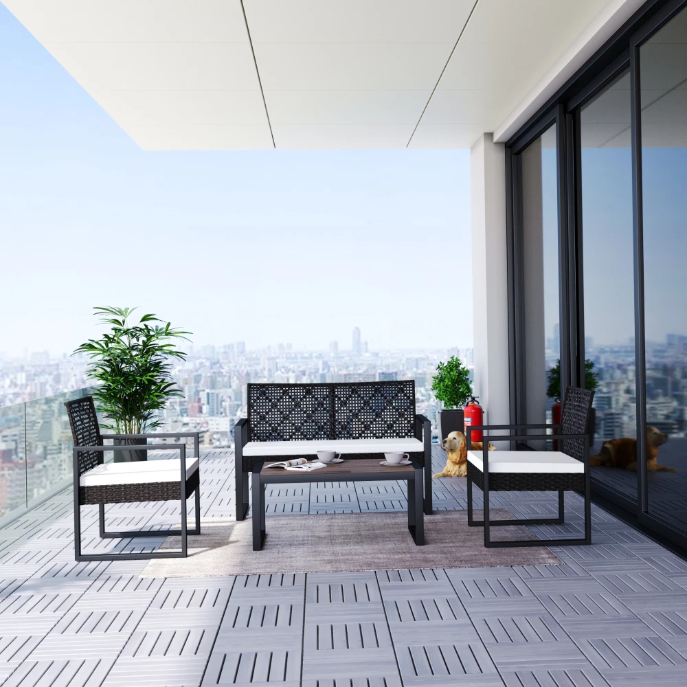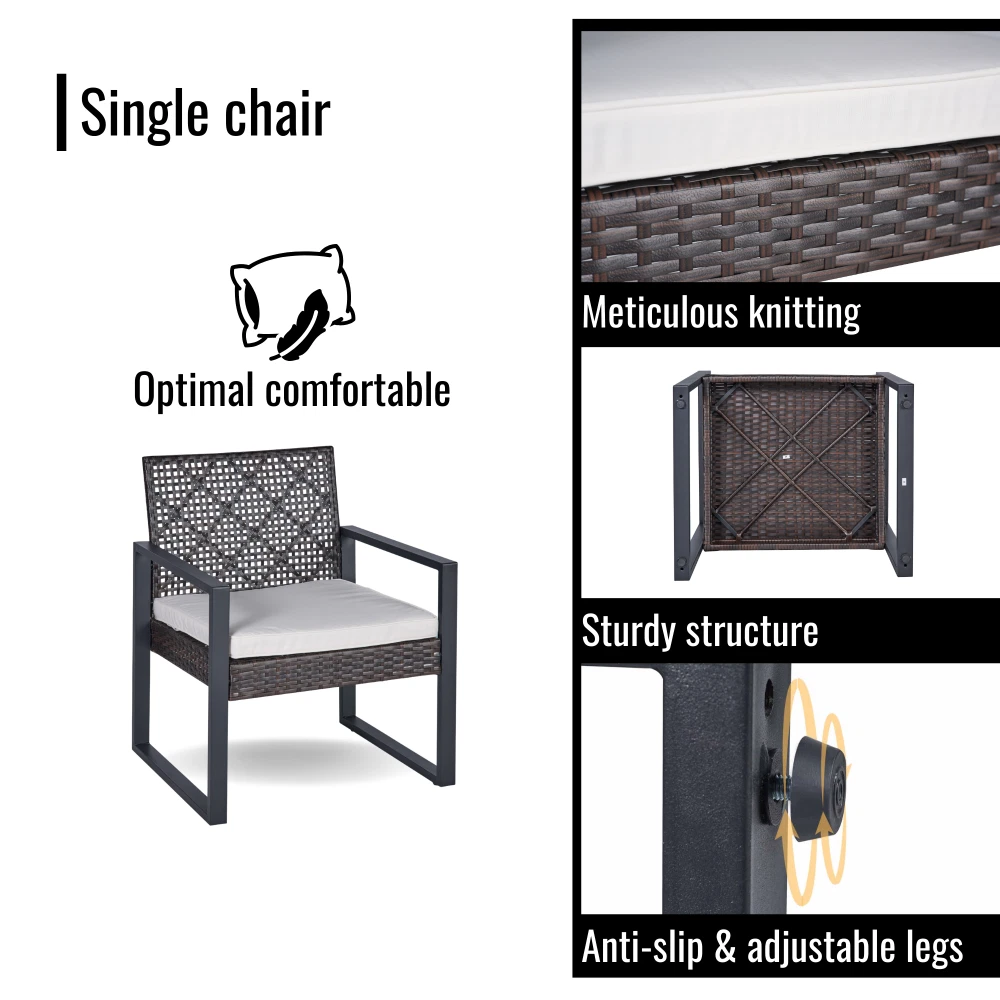 MODERN SET IN COZY HOME: Versatile and stylish outdoor patio furniture set, designed to elevate your outdoor living space with comfort and elegance. Crafted from high-quality PE rattan, powder coating frame with solid acacia wood, this set combines durability with a sleek aesthetic, perfect for any patio, balcony, porch, garden, backyard and lawn. NATURAL LOOK TABLE: Conversation patio furniture set brings a unique blend of rattan and wood. The natural look from sustainable solid acacia wood and the modern look of modern brown rattan is perfect for any space. Complete the assembly with few steps and enjoy leisurely moments outdoors. with drinks, snacks, or decorative accents. STURDY CHAIRS: The spacious double chair provides ample seating for two individuals, allowing you to unwind and enjoy the outdoor moments. Its ergonomic design ensures optimal comfort, while the sturdy plastic rattan construction guarantees long-lasting use and a high weight capacity of up to 705 lbs for double chair and 363 lbs for single chairs. All of the chair legs own adjustable nuts which brings to comfortable experience. DURABILITY MATERIAL: Durable and weather-resistant materials hold up to the elements; anti-rust and anti-corrosion treatment thanks to qualified polyester rattan, high-quality powder coating frame, UV tested cushion cover and acacia wood with water-based oil protection. ONE SET: includes one dounle chair size 44 x 23.82 x 29.92 inches; two single chairs size 23.82 x 23.22 x 29.92 inches, one table size 33.07 x 17.51 x 15.16 inches, clear instruction paper and extra a free part of hardware for replacing in case needed. Product Material Rattan Made by polyester, can be recycled, mixture light brown color Frame Steel with powder coating, black color Cushion Cover: Polyester fabric, density 160gsm, waterproof, black color Polyester wadding and a non-woven fabric layer batting cushions Zipper: yes / removable Wood Thickness 12mm, Acacia solid wood from sustainable sources Weight Capacity Double chair 705 lbs Single Chair 352 lbs Table 155 lbs Certificate ISO 9001:2015 Factory ISO 105 B02:2014 Fabric