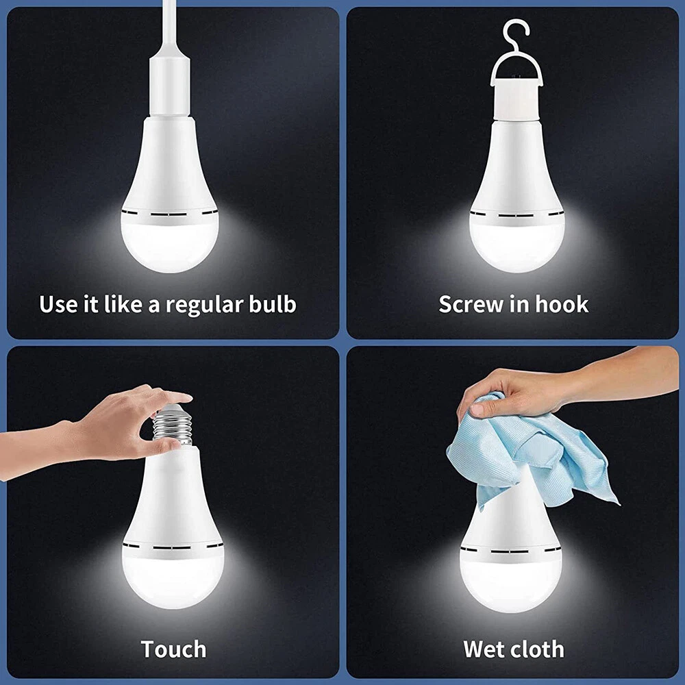 Product Description Commonly Ask Q: Why is it called emergency bulb? A: These rechargeable emergency light bulbs with built-in backup batteries, usually work the same as ordinary light bulbs, daily use of the bulb will charge itself, when the home power outage, to ensure that the power switch is turned on, the emergency light bulbs will automatically light up, can be in the home power outage to maintain lighting for 4-5 hours. Q: How do I use these LED Battery Light Bulb? A: It's the same as a regular bulb, screwed in anywhere you want to use it, like a ceiling fixture, a desk lamp in a room, a floor lamp in a living room, etc. How can I test the emergency mode at home if there is no power outage? Method 1: Screw our emergency LED light into any E26/E27 fixture and plug it into an 85 volt - 120 volt outlet, turn on the bulb, cut the main breaker, the bulb will stay on, turn it off, and it will be turned off. Method 2: Screw our emergency LED light into any E26 fixture, plug it in, use a damp cloth or wet paper towel Connect the prongs of the plug and our bulb will be turned on. [Use Like Regular Bulb] Comes with most common E26/E27 base,Screw the light bulb in any place. It will charge itself automatically and prepare for power failure. You can replace your current bulb in any room, storage, basement, hallway, barn etc. [Screw Into Hook, Light Up Anywhere] After charging, screw the rechargeable light bulbs into the hook and press the button to light the bulb.It can be hung in tents or other places when camping. [Power Out, Light On] Light Up With Figers:After charging, hold the screw with your two fingers, and then press the top of the screw with your wet fingertip, and the bulb will light up. The Emergency Bulb provides the same soft white light as a 60-Watt Incandescent lamp bulb, 800 LED Lumens. Its lifespan of 25,000 hours equals 2.85 years of accumulated use. It requires 120VAC input voltage, a closed circuit, and a single socket fixture. The LED Emergency Bulb works like an energy-saving bulb during regular use and switches to emergency light during a power outage, running on a lithium-ion battery. Thanks to a smart-charging feature, the light bulb can automatically refill its battery when the switch is on. Details: Small waist dob emergency light Size: 7 * 14 cm Lamp bead model: 2835 Number of beads: 26 Voltage: 85-265 v Lamp holder: the E26 / E27 Power: 12 w Color temperature: white light Package Bulb * 4 Hook with switch * 4 About Us Payment Shipping Terms Contact Us 1.We are honest eBay sellers. 2.We offer best price products to worldwide. Office time: Monday to Saturday, CST: 9:30-18:30 1. We ONLY accept PayPal. 2.Payment must be received within 7 days after winning the item. To claim back the Final Value Fee from eBay, an UPI (Unpaid Item Case) will be filed automatically if buyers fail to make the payment in 7 days after item ends. 3.If you have any problem with the payment after bidding, please let us know within 24h via eBay message. Thank you! 1. USA Stock, we ship from USA . 2. All packages will be shipped within 1-2 business day . 3. We will provide a tracking number. 4. Please note that there are certain circumstances that we unfortunately can not have control i.e. weather condition, delay by post office, Sundays, National Holidays, etc. 5. We don't arrange shipment on weekends. We appreciate your great understanding. 1. Free 30 day returns. We accept return and exchange. 2. Please read the detail of listing before you purchase it. If you have any problem with the listing, feel free to contact us firstly. 3. Returned item must be in brand-new, un-used, undamaged and re-sellable condition, including original packaging and complete accessories that came with the item (with all tags and labels attached). If the item is returned damaged, or has been opened or used, we may issue a partial refund in accordance to its condition and the issue. Returned item will be refused if it contains any scratches, dirt, or sign of usage. 4.All the items are double checked before shipment, If item is damaged, defective or missing components upon arrival, please provide us photos of the damaged package or defective item, we will respond you within 24 hours and resolve your issue asap. 1.Please contact us via eBay message. 2.Since you and us may located in the different time zones, please allow us to respond you within 24 hours on office time. we will respond you within 48 hours on holidays. 3.We are doing our best to offer you a better shopping impression on eBay. If you have any issue about the transaction, feel free to contact us before opening eBay case, PayPal case and leaving Neutral feedback or Negative feedback, we will resolve your issue properly. About Us 1.We are honest eBay sellers. 2.We offer best price products to worldwide. Office time: Monday to Saturday, CST: 9:30-18:30 Payment 1. We ONLY accept PayPal. 2.Payment must be received within 7 days after winning the item. To claim back the Final Value Fee from eBay, an UPI (Unpaid Item Case) will be filed automatically if buyers fail to make the payment in 7 days after item ends. 3.If you have any problem with the payment after bidding, please let us know within 24h via eBay message. Thank you! Shipping 1. USA Stock, we ship from USA . 2. All packages will be shipped within 1-2 business day . 3. We will provide a tracking number. 4. Please note that there are certain circumstances that we unfortunately can not have control i.e. weather condition, delay by post office, Sundays, National Holidays, etc. 5. We don't arrange shipment on weekends. We appreciate your great understanding. Terms 1. Free 30 day returns. We accept return and exchange. 2. Please read the detail of listing before you purchase it. If you have any problem with the listing, feel free to contact us firstly. 3. Returned item must be in brand-new, un-used, undamaged and re-sellable condition, including original packaging and complete accessories that came with the 