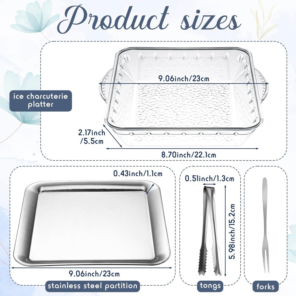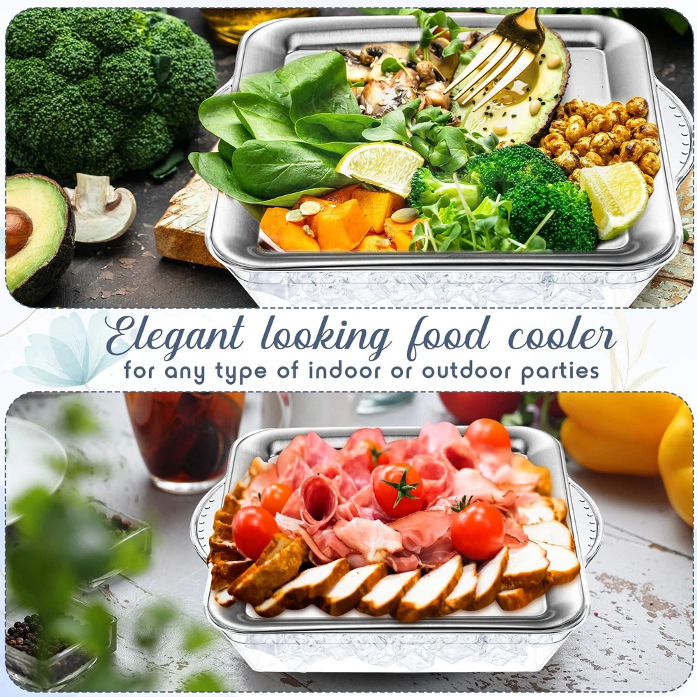 Features: Ideal for Gifting: This classic tray makes a nice gift for weddings, birthdays, and celebrations by its elegant appearance and it won't stain, or absorb food odors and flavors. Everyone will appreciate a practical and multi use gift they can use over and over. Efficient Cooling Capability: The bottom tier can provide improved space for holding ice, allowing for more ice cubes to be stored. The chilled serving tray ensures food stay cooler for longer durations, making it an excellent choice for outdoor picnics or barbecues on hot days. Specifications: Material: PET plastic, stainless steel Color: white, silver Size: Square ice tray: 10.04 x 8.66 x 2.17 inches/ 25.5 x 22 x 5.5 cm Square veggie tray: 9.06 x 9.06 inches/ 23 x 23 cm Ice tong: 6 inch Package includes: 4 x Square ice trays 4 x Square veggie trays 4 x Ice tongs 16 x Fruit forks Notes: Manual measurement, please allow slight errors on size. The color may exist a slight difference due to different screen displays. Package Inclusions: Experience social or family gatherings at ease with our chilled veggie tray set, including 4 square ice trays, 4 square veggie trays, 4 ice tongs, and 16 fruit forks for a delightful snacking and appetizer experience Double Layer Tray Design: The upper fruit tray offers space for an array of edibles like fruits, vegetables, cold cuts, condiments, and meats, including sushi. The base ice tray allows for ice cube storage, maintaining your food's freshness Quality Materials: PET plastic and stainless steel are applied in veggie trays sets, which are an essential addition to your indoor or outdoor gatherings. You'll love the practicality and versatility of this repeatedly usable tray set Easy Clean Design: Keeping the set pristine is easy, thanks to its straightforward cleaning process. Simply rinse it with water after use, and it's ready for another round. Plus, it's dishwasher safe for stainless steel trays ultimate convenience Versatile Usage: Nice for family reunions, corporate events, picnics, barbecues, camping, and more. This elegant food cooler tray compliments indoor or outdoor settings, providing a practical solution to keep your food chilled outdoors