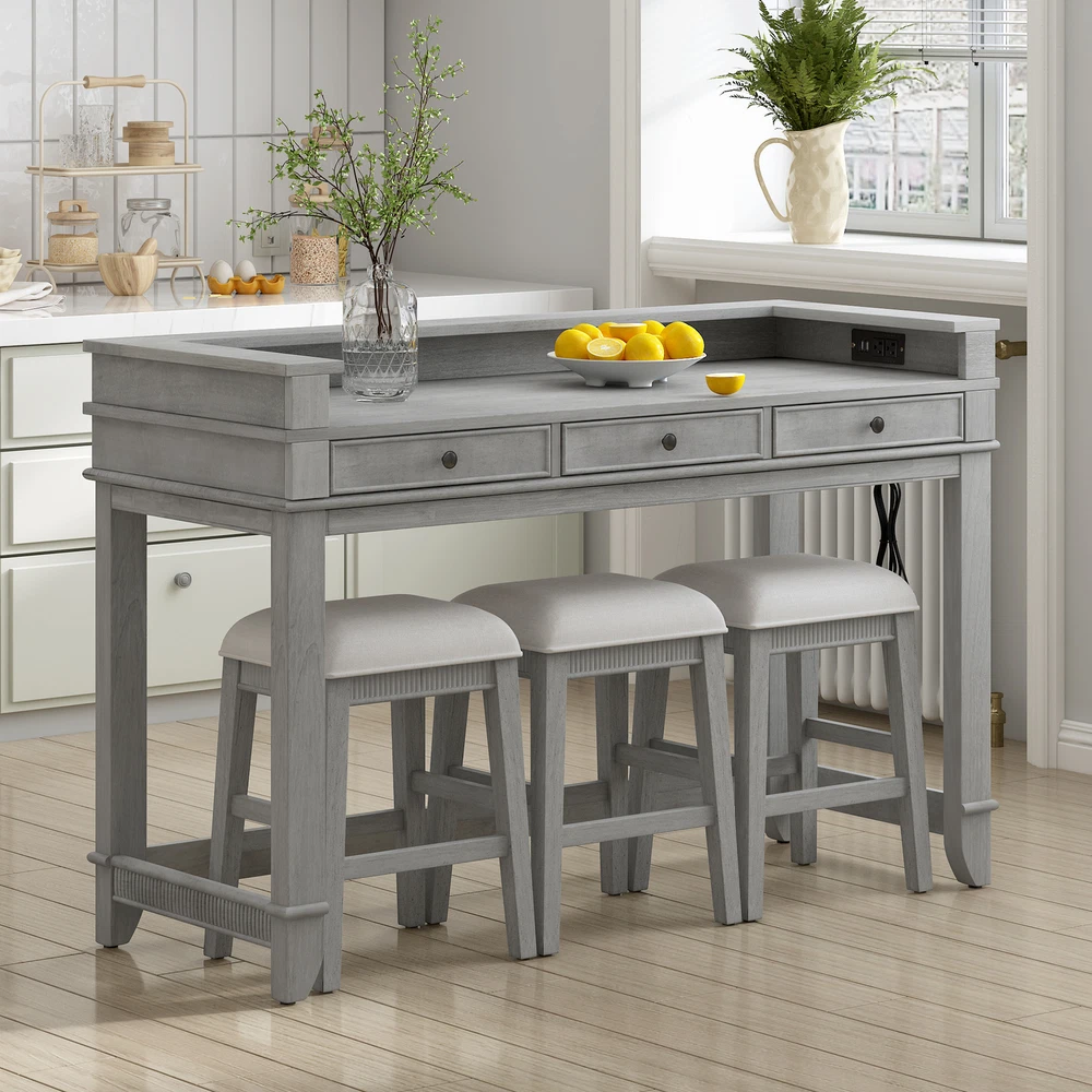 4-Piece Dining Bar Table Set with 3 Stools, Dining Table w/Charging Station Create a harmonious atmosphere in your home with our delicate and elegant retro bar table set. Featuring a USB port and power strip on the right side, you can work or dine while keeping your devices charged. When not in use, three stools can be stored under the table, saving space and adding to the aesthetic appeal of your space. Crafted with MDF and rubber wood, the table and stools are sturdy and comfortable, complete with a sponge-upholstered seat. The tabletop's fence design adds an extra layer of protection for your belongings, making this set both practical and beautiful. Weight&Dimensions: Table: 54''L×21''W×35.2H,70.5LBS Stool: 14.4''L×11.4''W×20''H,8.8LBS/piece Seat Dimensions: 14.4''L×11.4''W Weight Capacity: Table: 595 LBS; Stool: 330 LBS/piece Specifications: Material: Tabletop: MDF; Legs&Frame: Rubber Wood; Pieces Included: 1 table+ 3 stool Package Number: 2 Assembly Required: Yes Additional Tools Required: All Tools Included Notice: Color: Items may slightly differ from photos in terms of color due to the lighting or your monitor's display. Size: Manual measurement has been used, there may be some reasonable error. Package: This Product Will be Shipped Separately in Multiple Boxes.