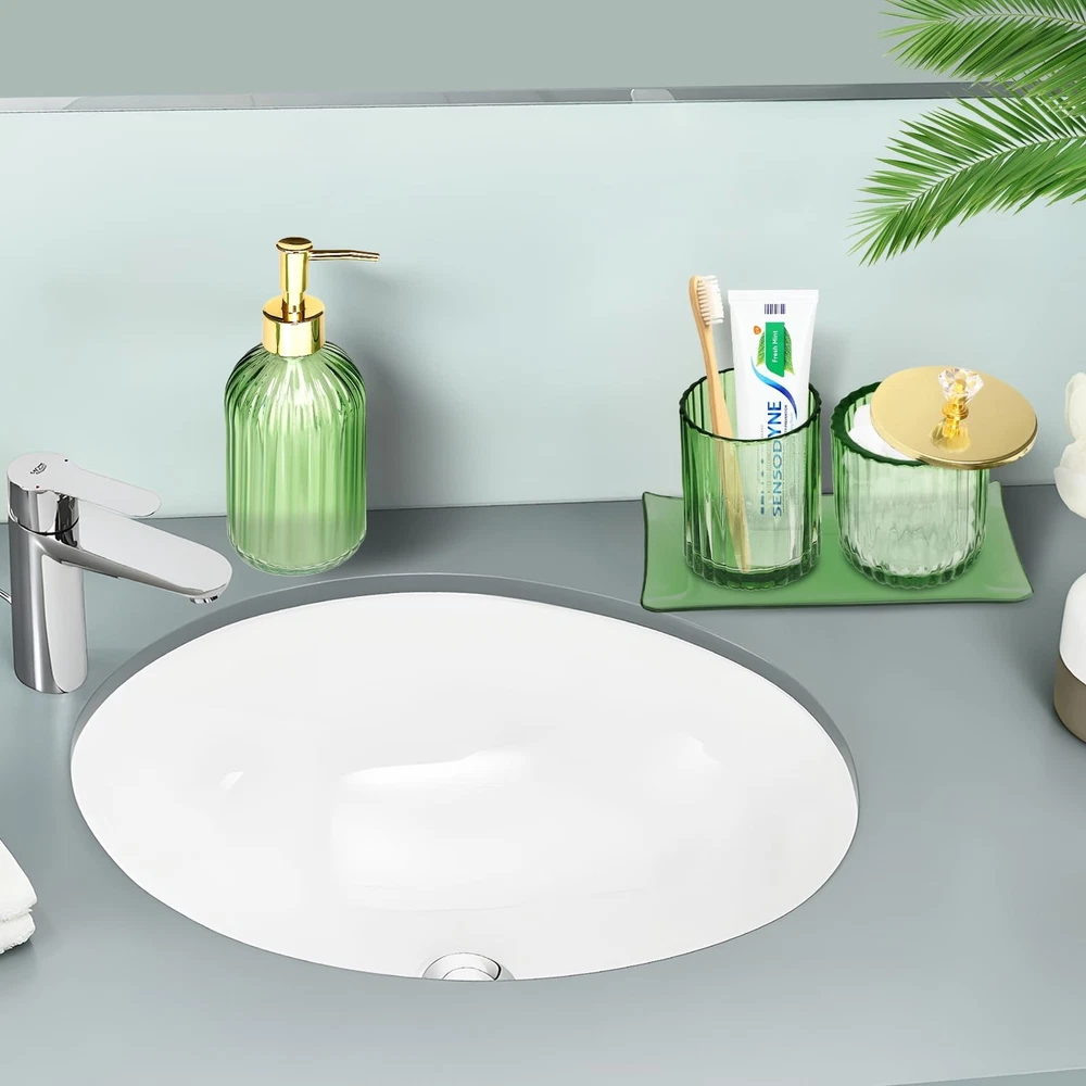 MULTIFUNCTION GREEN GLASS BATHROOM ACCESSORIES SET -- 4 pieces bathroom set includes a Lotion Soap Dispenser, a Vanity Tray, a Qtip Holder, and a Toothbrush Holder, Perfect for storing your toiletries or your cosmetics, the green tray can also hold your jewelry and keeping your bathroom counter fully organized and neatly DECORATIONS FOR HOME APARTMENT / BATHROOM -- The green glass bathroom set is ideal decoration fits various styles: bathroom decor, industrial style, western decor, modern style, contemporary decor, and country decor. Ideal bathroom accessories set for home decor, bathroom decor, and farmhouse decor. Great for the kitchen and bath, for countertop organize, vanity top, makeup table, and craft PREMIUM STURDY MATERIAL-- All pieces of bathroom accessory set are made of high-quality pressed heavy glass, with a nice weight, non-cheap plastic, and Easy to clean. Green cups are as clear as green crystals. High-quality stainless steel lid, gold plating process, beautiful and not rusty GREAT GIFTS IDEA -- A perfect gift for family, friends, and coworkers; perfect as a housewarming present, wedding gift, and perfect for remodelers looking to upgrade the bathroom in their home or apartment; bathroom essentials for a new home; guest bathroom decor 100% -- We are committed to presenting the best quality materials and satisfaction services to our customers. If you have any issue with the contemporary bathroom accessories set, please us, we will be happy to help you