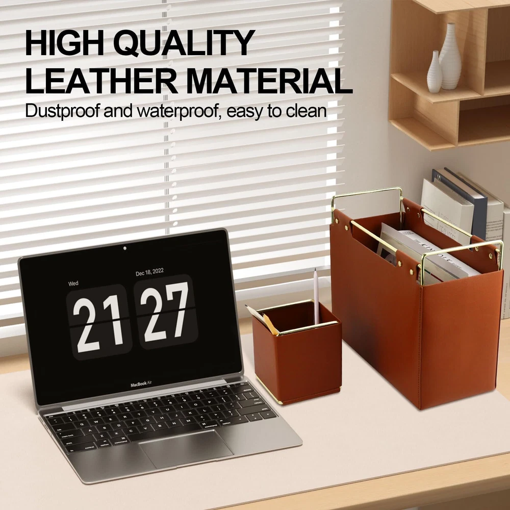 Introducing our Premium Leather Desktop Storage Organizer Set – the ultimate solution for decluttering and enhancing your workspace. Crafted with meticulous attention to detail and an unwavering commitment to quality, this organizer set is a stylish and functional addition to any professional or home office. Premium Quality Leather Craftsmanship: Crafted from durable and elegant genuine leather, our desk organizer set not only looks stunning but also withstands daily use, ensuring a timeless addition to your workspace. Versatile Organization Solutions: Designed to maximize your desk space, this set includes multiple compartments, trays, and pockets tailored for pens, notepads, business cards, documents, and small office essentials, keeping everything neatly in place. Enhances Professional Image: Elevate your work environment with a sophisticated leather organizer that reflects your professionalism and attention to detail. Impress clients and colleagues with a well-organized workspace. Easy Access & Quick Cleanup: With its thoughtful layout and smooth leather surfaces, accessing your items is effortless, while spills and dust are easily wiped away, maintaining a clean and professional look. Package:Include: 1*Pencil Cup, 1*Business Card Holder, 1*Letter Tray, 1*Files Holder