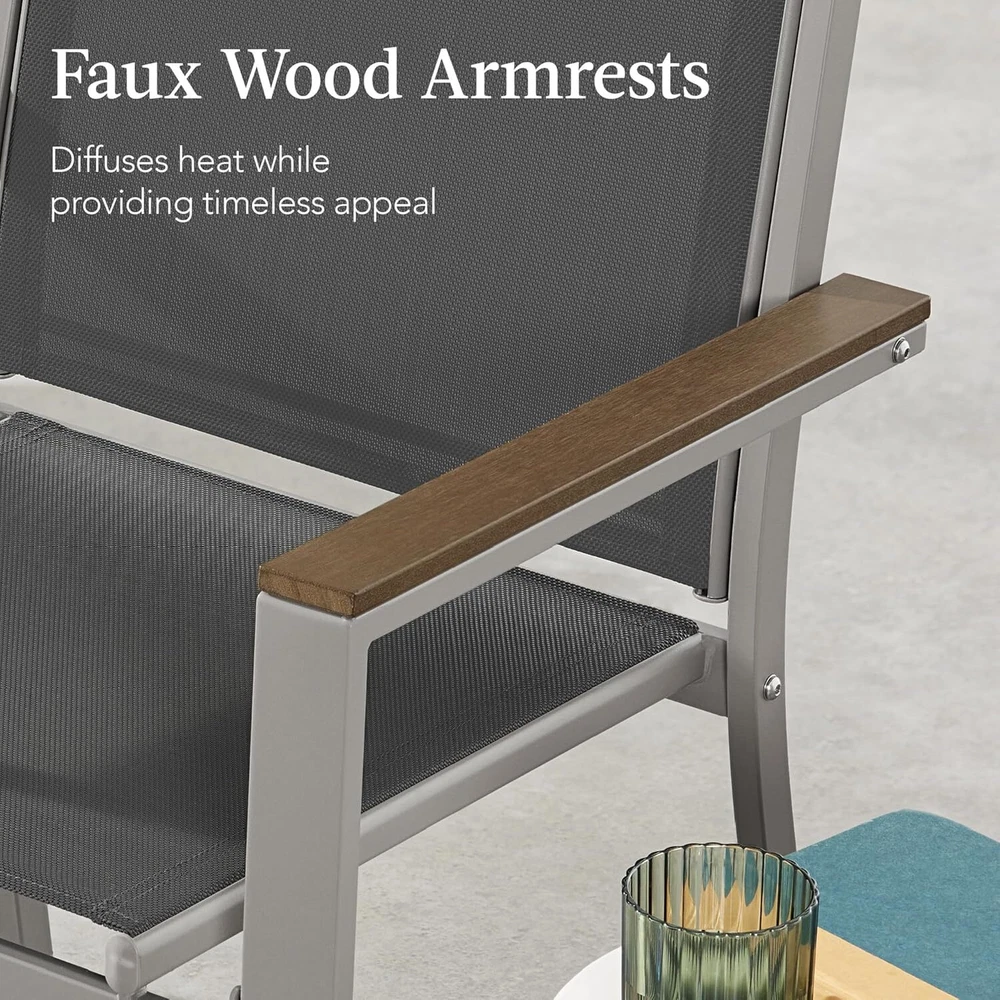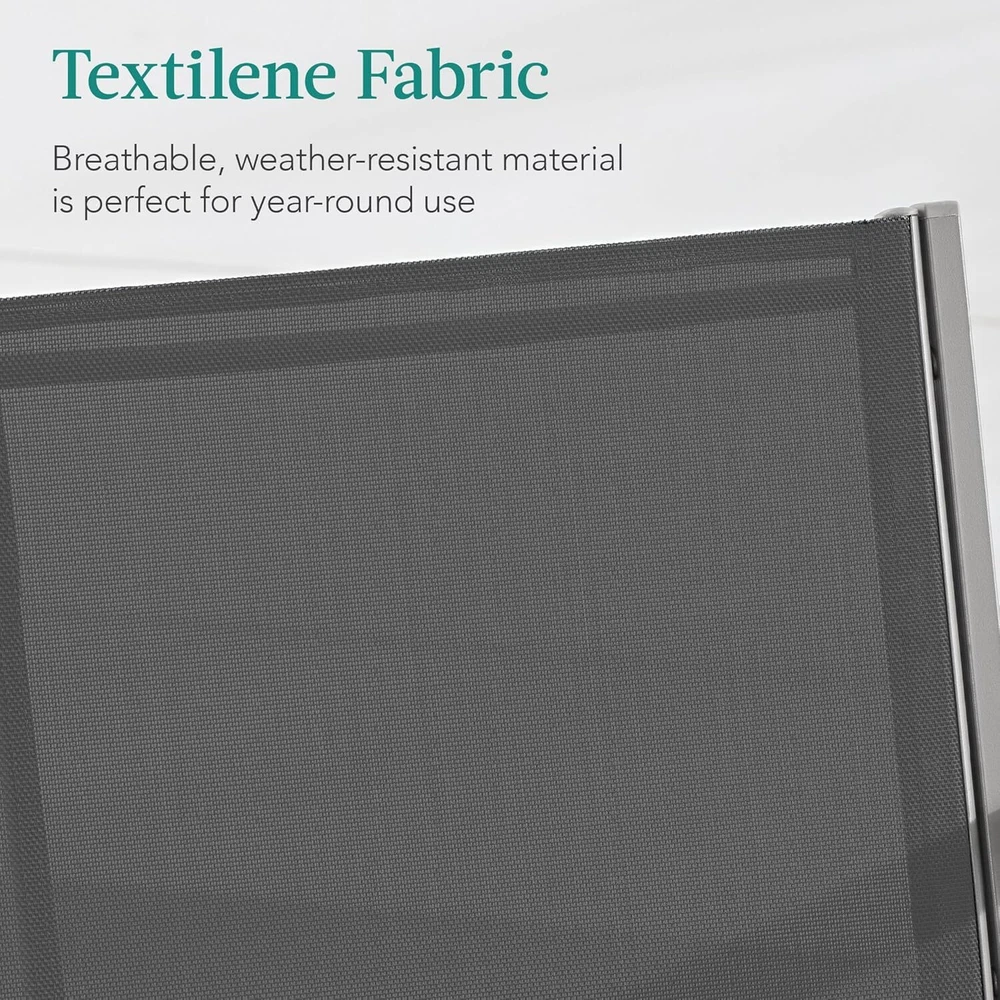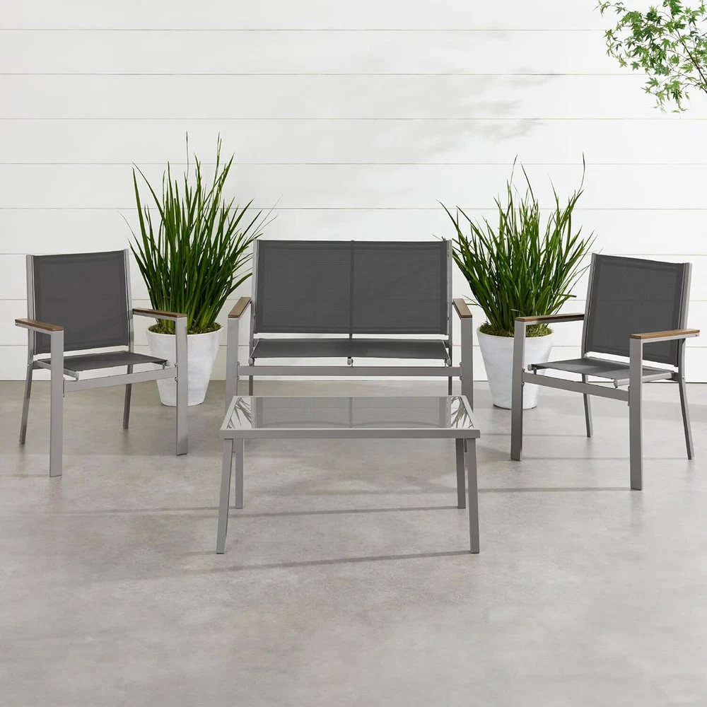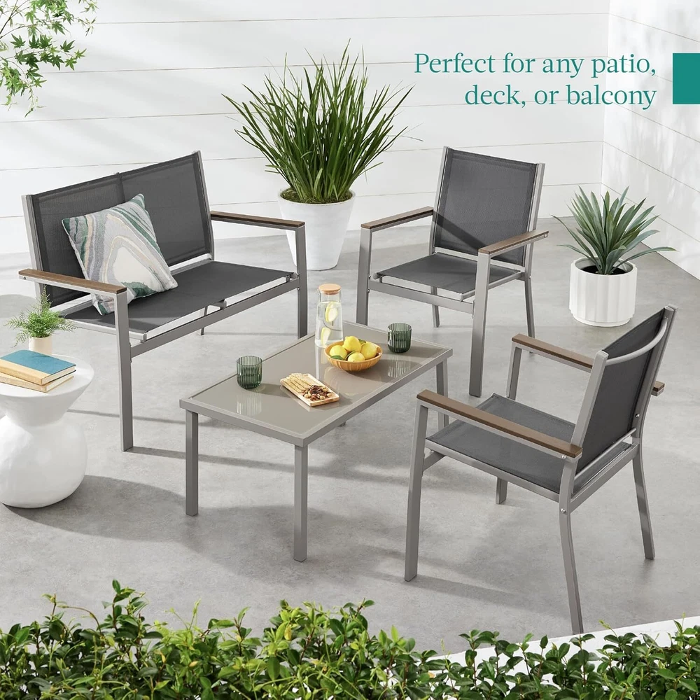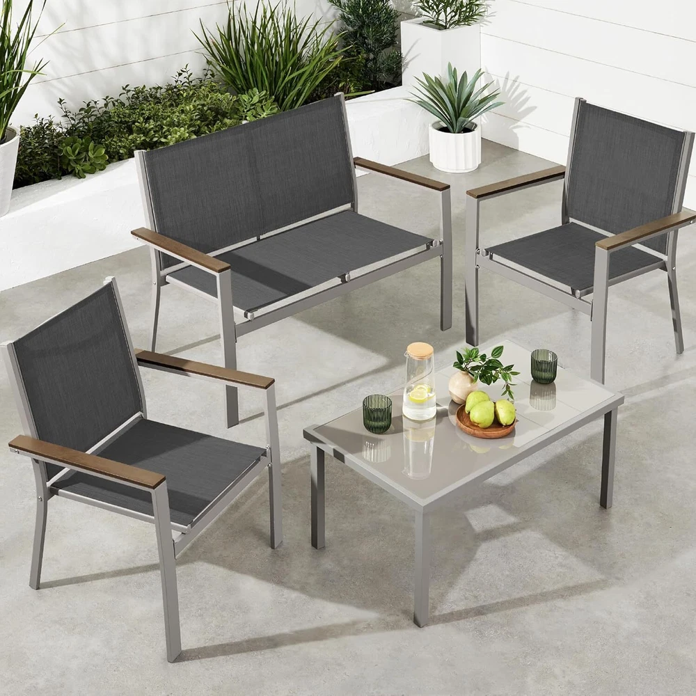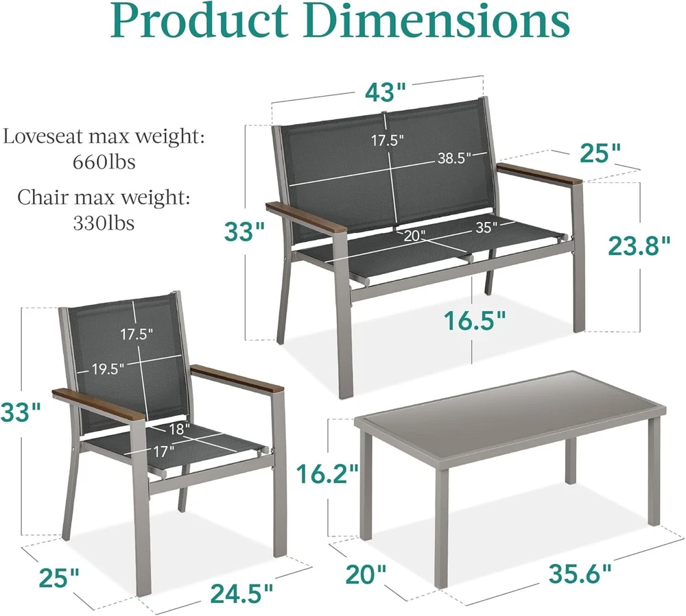 VERSATILE SETUP: This set features a modern aesthetic, complete with a table, loveseat, and two single chairs that can be mixed & matched to your sitting space TEXTILENE FABRIC SEATS: These seats use light yet durable textilene to create a cool, breathable surface that is weather-, UV-, and tear-resistant for lasting quality FAUX WOOD ARMRESTS: Accent panels on the steel armrests help elevate the arms for a more relaxed posture and diffuse heat to prevent burns during full-sun conditions CONTEMPORARY DESIGN: Stylish steel frames are wrapped with tightly woven textilene to capture a modern appeal while providing reliable support GLASS TABLE TOP: The removable, tempered, and tinted glass tabletop is a smooth, easy-to-clean surface for food, drinks, and outdoor decor; LOVESEAT DIMENSIONS: 43"(L) x 25"(W) x 33"(H); LOVESEAT WEIGHT CAPACITY: 660 lbs.; CHAIR DIMENSIONS: 25"(L) x 24.5"(W) x 33"(H); CHAIR WEIGHT CAPACITY: 330 lbs.; TABLE DIMENSIONS: 35.5"(L) x 19.5"(W) x 16.5"(H); TABLE WEIGHT CAPACITY: 66 lbs. On Dec 17, 2024 at 18:07:34 PST, seller added the following information: