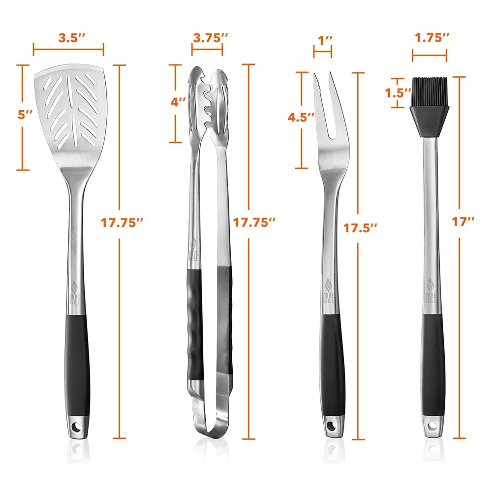 4-Piece Stainless Steel BBQ Tool Utensil Set - Professional Grade Barbecue Accessories ✓ Free 60 Day Returns ✓ Free Express Shipping Description: Features: 4-piece professional BBQ set: Top of the line, professional BBQ grill tool set from Pure Grill. 4-Piece Set Includes: meat fork, barbecue spatula, a pair of non-locking springless tongs, and a basting brush with a BPA-free silicone brush head. With the winning combination of premium craftsmanship and high-quality materials, these barbecue grill tools have been expertly designed and built to last. Heavy-duty, stainless steel: These grill tools are solidly constructed of premium 430 food-grade stainless steel. Designed to resist rust and warping, these BBQ grilling utensils will maintain their natural finish grill after grill. These barbecue tools are built to last and will not bend or break. Ergonomic handles with non-slip, comfort grip: The Pure Grill tools have been specially designed with an extra layer of BPA-free, rubberized coating for superior comfort while handling. Flip, skewer, rotate and baste with ease while using these premium quality BBQ tools. Easy to store: Designed for convenience with an oversized, integrated opening, the tools easily hang from the tool hooks on barbecue grills. Great gift for any grill master: This BBQ grilling tool set from Pure Grill is the ideal gift idea for any grilling connoisseur. Product Details: Brand: Pure Grill Material: Stainless Steel Item dimensions L x W x H: 17.5 x 1 x 17.5 inches Item Weight: 2.9 Pounds Handle Material: Stainless,Stainless Steel,Silicone,Steel Included Components: Spatula Is Dishwasher Safe: No Number of Pieces: 4 UPC: 842364122512 Manufacturer: Pure Grill Product Dimensions: 17.5 x 1 x 17.5 inches Item Weight: 2.9 pounds Country of Origin: China Item model number: TL-U22