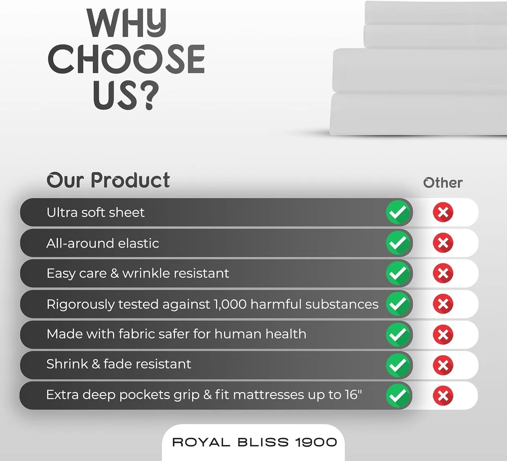 4-Piece Ultra-Soft King Split Head Mattress Sheet Set - Deep Pockets, White ‹ › ‹ › ‹ › ‹ › ‹ › ‹ › ‹ › ‹ › ‹ › 4-Piece Ultra-Soft King Split Head Mattress Sheet Set -Deep Pockets, White Features: Made from proprietary hydro-brushed fabric for unparalleled softness, keeping you cozy in winter and cool in summer. Includes: - 1 King Flat Sheet (108" x 102") - 2 King Pillowcases (20" x 40") - 1 Split Head Flex King Fitted Sheet (80" x 78" x 16" Pocket) with all-around elastic. Extra deep pockets grip and fit mattresses of up to 16 inches. Elastic all-around for a secure fit that stays in place all night. Exceptional quality made with the finest microfiber yarn, free from harmful materials. Wrinkle-resistant and machine washable for easy care. Benefits: Indulge in the luxurious softness that enhances your sleeping experience. Breathable fabric allows for temperature regulation for year-round comfort. Designed to maintain its elegance and quality wash after wash. Perfect fit for split head king mattresses, ensuring a snug and secure fit for uninterrupted sleep. Available in a variety of colors to match any bedroom decor. Why Choose Our 4-Piece Ultra-Soft King Split Head Mattress Sheet Set? If you crave the royal treatment in your sleep space, indulge in our 4-Piece Ultra-Soft King Split Head Mattress Sheet Set. Lavishly crafted from ultra-soft, breathable fabric, these sheets bring a touch of sophistication to your bedroom while ensuring you enjoy restful nights filled with comfort and relaxation. With its wrinkle-resistant design and machine-washable convenience, maintaining your luxurious sleep experience has never been easier. Elevate your sleep sanctuary and embrace the exquisite comfort that awaits. Your royally soft night starts here! Shipping Free & Fast Shipping - We offer free shipping to most of the USA with a normal delivery time of 3-7 days. However, due to the current situation, additional delivery time (up to 3 weeks) may be required for some items. Alternative Carriers - We may use alternative carriers (e.g. USPS, FedEx, UPS, etc.) to ensure your package arrives safely and on time. Due to the use of multiple carriers, we are unable to provide a tracking number automatically. Handling Time - Orders are processed and shipped within 1-2 business days of receiving cleared payment. Shipping Restrictions - Shipping to Alaska, Hawaii, Puerto Rico, Guam, and other US territories may incur shipping charges or delivery restrictions. Please contact us before ordering, or your order can be refunded/cancelled. State Restrictions - There may be restrictions based on your state of purchase. For example, certain items may not be shipped to California due to state regulations. Contact for Tracking Updates - If you require tracking updates or have any concerns about the delivery of your order, please feel free to contact us, and we will be happy to assist you. Return 30-Day Hassle-Free Returns - We want you to be completely satisfied with your purchase. If you are not, you can return the item within 30 days of receiving it for a full refund or exchange. Easy Return Process - To start a return, simply contact us and we will provide you with a prepaid return shipping label and detailed instructions. Restocking Fee - There are no restocking fees for returns. However, the buyer is responsible for return shipping costs if the return is not due to a seller's error. Refund Processing Time - Refunds will be processed within 5 business days of receiving the returned item in its original condition. Payment We accept all major credit cards, PayPal, and Apple Pay for your convenience. Your payment information is secure and encrypted to ensure a safe and seamless transaction. Please complete your payment within 3 days of purchase to avoid any delays in shipping. Feedback Your feedback is extremely important to us. We strive to provide the best products and customer service possible. If you are satisfied with your purchase, please take a moment to leave us a positive review. If you have any concerns or issues with your order, please contact us before leaving negative feedback. We are committed to resolving any problems and ensuring your satisfaction. Contact Us If you have any questions or concerns, please feel free to reach out to our customer support team. You can contact us through the eBay messaging system. We are available Monday to Friday, 9:00 am to 5:00 pm EST, and we will do our best to respond to your inquiry within 24 hours. Buy it now and enjoy a pleasant shopping experience! UPC: Not Set Item Length: Not Set Item Width: Not Set Unit Quantity: 1 count Material: Microfiber Character: Not Set Theme: Winter Features: Machine Washable,Fully Elasticized,Fade Resistant,Deep Pocket,Shrink Resistant,Wrinkle Resistant Care Instructions: Machine Wash Department: Adults Room: Bedroom Labels & Certifications: Not Set Brand: Unbranded Size: Top Split Flex Head King Type: Sheet Set Color: White Pattern: Solid MPN: Not Set Character Family: Not Set Thread Count: 1900 Country/Region of Manufacture: Not Set Style: Modern Shape: Rectangular Model: Not Set GSM (Grams per Square Meter): Over 800 Product Line: Not Set Unit Type: Unit