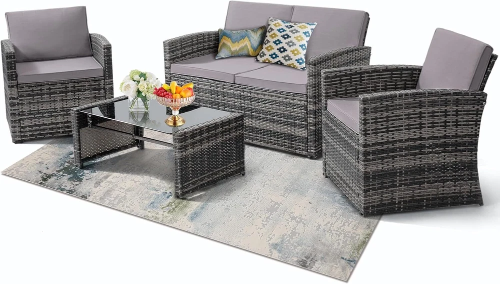 【VARIOUS COMBINATIONS】The furniture set consists of two single armchairs, a love seat and a coffee table, each of which can be moved easily, allowing you to arrange it according to the space of your home to improve space utilization 【SOFT & COMFORTABLE CUSHION】A sofa set comes with four thickened cushions and four soft pillows that can be removed with a zipper so you can clean the fabric cover; The surface of the cushion can protect it from water droplets, but it can't be exposed to rain for a long time; So the cushion must be promptly retracted in rainy days 【STURDY & DURABLE】Our four-piece sofa is crafted from a sturdy steel frame and delicate hand-woven rattan; It can withstand all kinds of weather; And can be quickly cleaned and put into use after a rainy day; Perfect for your living room, yard or poolside 【EASY TO CLEAN】Our outdoor four-piece set comes with a coffee table with a detachable tempered glass top, which is held in place by suction cups; You can put liquids like champagne on it and don’t worry about overturning it, as a glass tabletop can be restored with a simple wipe Payment 1. Payment should be completed within 3 (Three) days of auction closing. Or unpaid dispute will be filed for closing auction automatically. 2. If for some reason there is any issue with the payment, please contact us, and we will be glad to work with you to have it resolved. Shipping 1. Package handling only takes 3 business day at our warehouse, so please make sure entering correct payment and shipping information before checking out. 2. According to eBay policy, we only ship to eBay ADDRESS. Once your payment is completed, you can leave eBay note or click the button named “contact seller” in your purchase history if the changes are needed before we send the product. 3. If an address change is needed after sending your item, you will be responsible for any fees associated. 4. Orders placed on weekend will be shipped within 3 business days. Terms of sales 1. All of our items come with a 30-day return policy. We ensure all our items are new and in excellent condition prior to shipping. In the event that you receive the item that is not to the standards above, please contact us via eBay messages. All returns should be shipped with delivery confirmation.New items must be returned unused, undamaged, in the original packaging. 2. Please note that all returns must be pre-approved by us. Unauthorized returns will not be accepted. If you need to return, please check twice to confirm the item not work and contact our customer service representative, let us know the detailed problem and send us some pictures for confirmation. 3. All NON-seller mistake returns for refund are subject to 20% re-stocking fee and buyer should pay for the round-trip shipping fee. (E.g. you bought wrong model or wrong color). 4. We ONLY accept the return for original package. Please make sure that item has NO man-made sabotage. Used items will not be accepted for return. 5. We reserve the right to refuse any returns for objective reasons. Feedback 1. If you are satisfied with the product you received, please leave us positive feedback and 5 star comment, which will be highly appreciated. 2. If there is any problem about your order, please contact seller prior to leaving feedback, and we will be glad to work with you to have it resolved. 3.If you are dissatisfied for any reason, please do not be quick to leave negative or neutral feedback. We’ll try our best to resolve any problem for you to make EACH CUSTOMER 100% SATISFIED and always leave positive feedback to all our customers. Contact us 1.Before purchasing, you can contact us directly by clicking "Ask a Question" at bottom of this page. 2. After purchasing, you can contact us by clicking the button named “contact seller” in your eBay purchase history. 3. We will answer your question within 24 hours(except Holiday). FAQ Q: How do I pay for my purchase? A: We only accepts the payment method Paypal. Q: When will the item be shipped out? A: The item will be shipped within 3 business day once payment completed. Q: Where is my tracking number? A: Some of our parcels are shipped with tracking <, and u could check it as the following steps: Please log on your account. Click ”my eBay”----->”My Summary” or open your emailbox and find the shipping notification email. Q: How do I return an item? A: We accepts returns. Item must be returned within 30 days. You will be refunded within 5 working days of receiving your money back:The returned goods have been received. Please contact our customer service before you return an item.