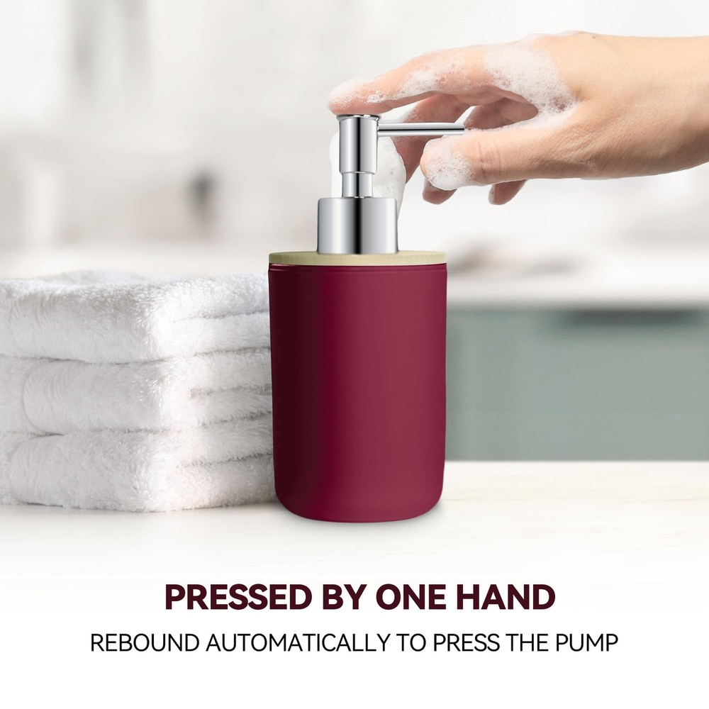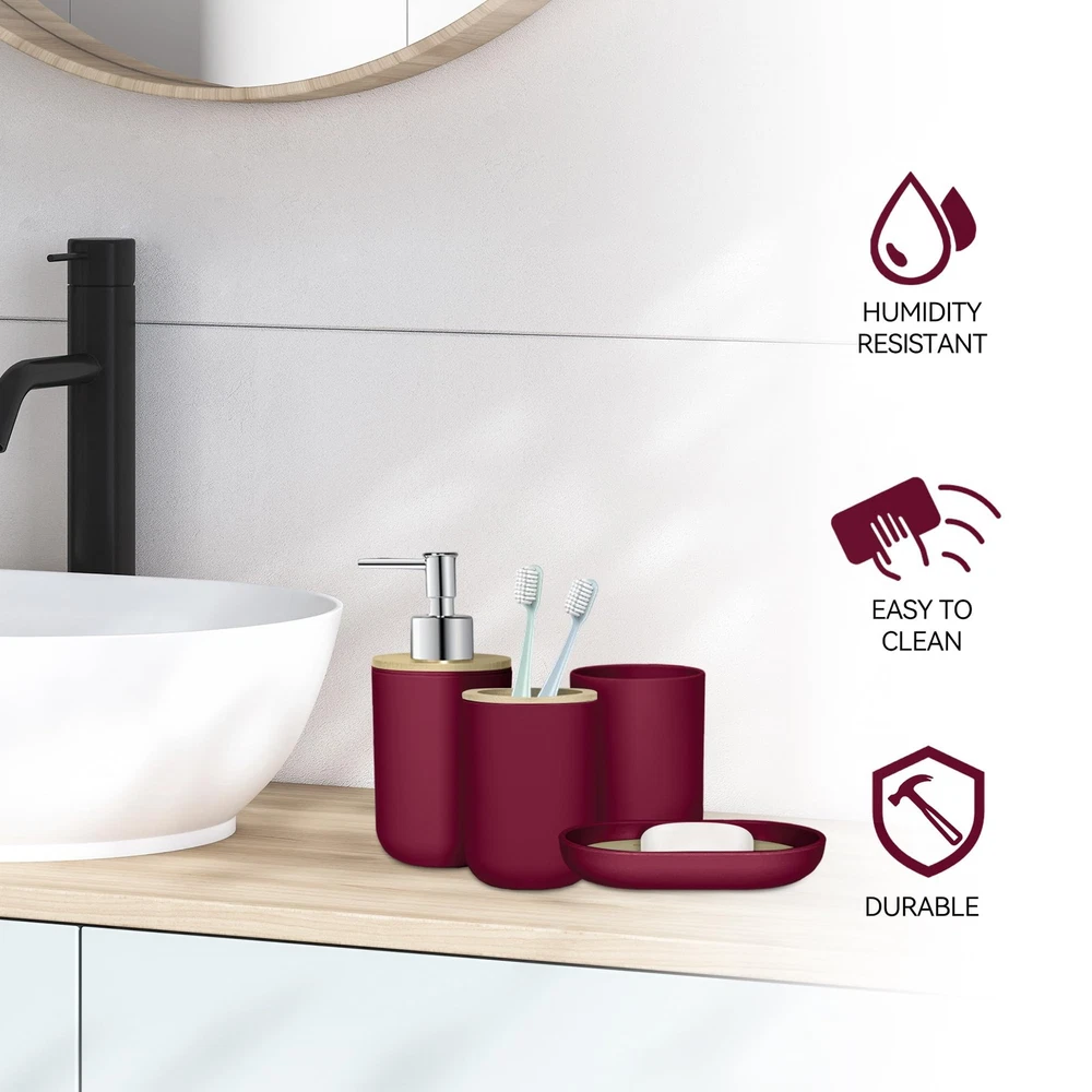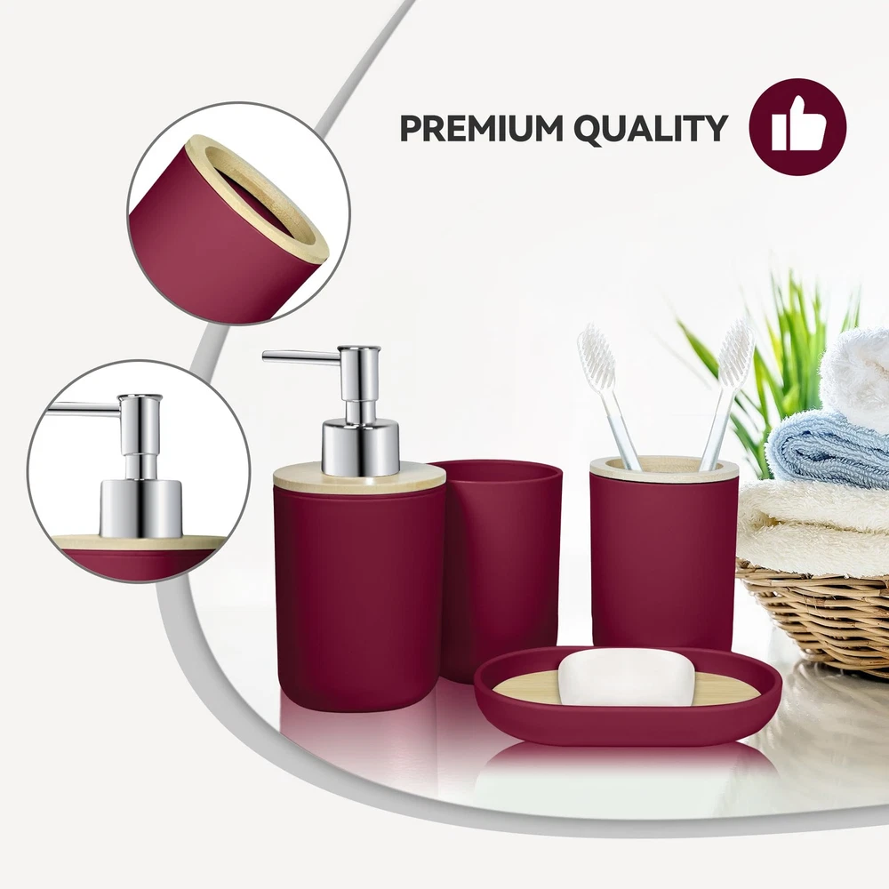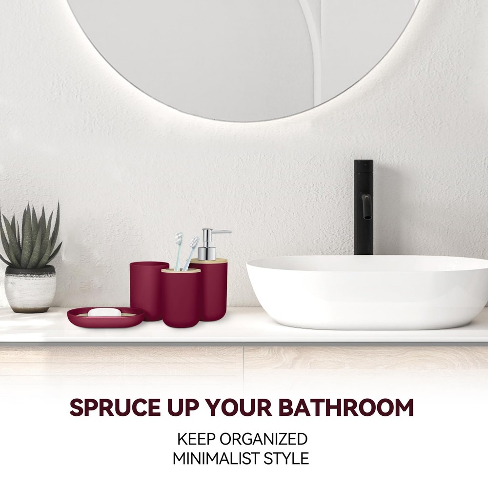 Bathroom Accessories Set Our bathroom accessories set can make your bathroom cleaner and tidier, the elegant design with fashionable colors greatly enhances your bathroom decoration and saves the bathroom storage space. Specification: Item type: Bathroom accessories set Color: Wine Red Quantity: 4 Pack Material: Safe and durable material Those products are made of thickened plastic and bamboo, don't worry that it will be as easy to break like ceramics or glass. The accessories set can accommodate all bathroom necessities. Package include: A suit contain 1 soap dispenser, 1 toothbrush holder, 1 toothbrush cup, 1 soap dish,which can meet basic bathroom supplies storage needs. Multi-purpose soap dispenser This bottle can put many things, such as liquid soap, shower gel or lotion packaging. Simple toothbrush cup and mouthwash cup Your toothbrush has a fixed place, and it will not be messy. The separation of the toothbrush and mouthwash cup will be cleaner and hygienic. Soap boxes Thick plastic soap boxes are more durable and not easy to mold. This is a perfect gift for family members, friends, relatives, colleagues, customers, neighbors. 4 PCS Bathroom Accessory Set: Includes 1 x soap dispenser, 1 x toothbrush holder, 1 x soap dish and 1 x mouthwash cup. Our modern bathroom accessories set keeps the bathroom organized and has a minimalist design that perfectly complements your bathroom decoration Bathroom Soap Dispenser And Toothbrush Holder Set: The soap dispenser pump is easy to press, will not leak, is sturdy and durable, and has a long service life. Great for liquid hand soap, dish soap, lotion, shampoo, body wash, hand sanitizer and more. Our toothbrush holders fit most sizes of electric toothbrushes, toothbrushes, toothpaste tubes and razors. The thickened plastic material ensures it's shatterproof, can withstand drops well Sturdy And Safe Material: Our bathroom set accessories are made of premium plastic, easy to clean, sturdy, and durable, making your bathroom out of the ordinary Ideal Decoration For Bathroom: Wine red and bamboo make up a very natural decorative element, giving a cozy feel. That harmonizes with most styles, adding a more rustic, boho, farmhouse, or vintage touch to your home Giftable: Functional and beautiful design makes these 4 pieces of bathroom accessories set a great gift for a housewarming, wedding, birthday, Mother's Day, Thanksgiving Day, Christmas, and also for mom, sister, colleague, and friends