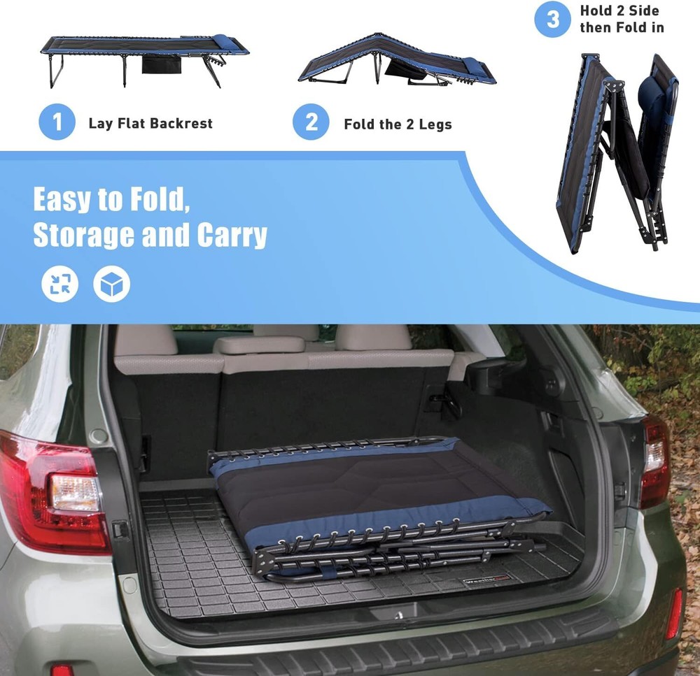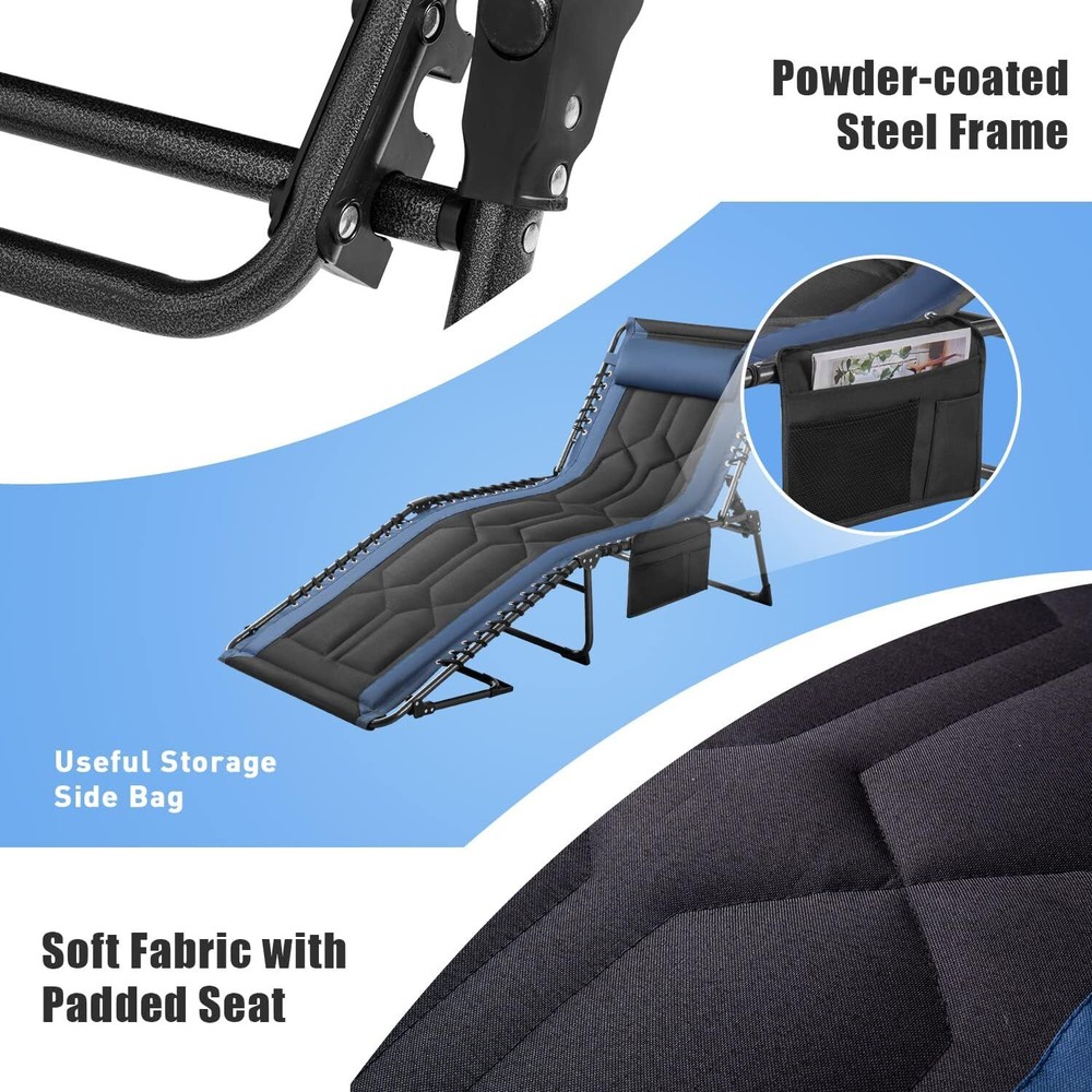Absolutely love this lounge chair! The padded seat and adjustable recline make it super comfy for beach days or lounging in the backyard. The sturdy steel frame holds up well, and the included pillow and side bag are great bonuses. Super lightweight and folds easily—perfect for travel. The blue color looks fantastic and resists fading. Best outdoor chair I’ve owned!