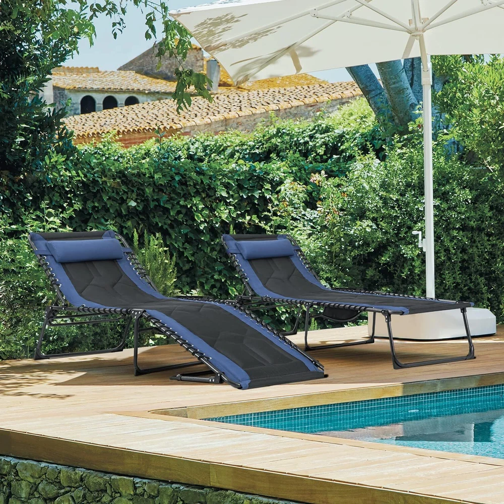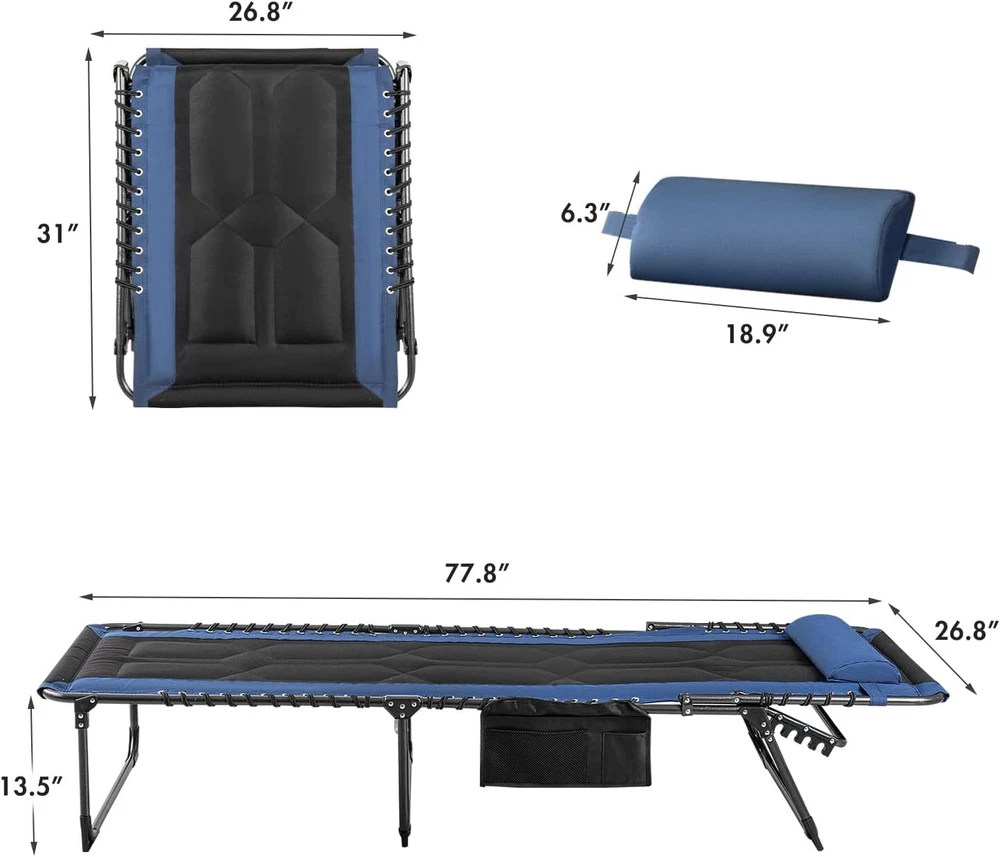 Product Description Folding Chaise Lounge Outdoor Portable Lounge Chairs 4-Position Adjustable Camping Lounge Chair with Pillow & Side Bag Lightweight Recliner Sunbathing Chair for Pool Beach Deck (Blue) [Comfortable Experience] The patio lounge chair has a wider and longer seat, enough for an adult to sit comfortably on. The Seat are thickened to provide greater comfort and stability than traditional single-layer fabric, allowing you to enjoy your leisure time freely. [Premium Material] Made of special coating steel frame, this chaise lounge outdoor provides better weight capacity and withstands bad weather. Textilene fabric offers soft and breathable while the high-elastic oxford rope offers extra support. [Thoughtful Design] Comes with adjustable headrest, you can freely adjust the position to your like. The side bag has 3 different size pockets, you can put books, phone, tablet and so on, adding more convenience. The non-slip footpad at the bottom not only provides stability on different grounds, but also protects the steel frame from corrosion. [4 Position Adjustable] The back of this camping chair has 4 adjustable angles, which you can adjust according to your needs. Whether you sit up for reading or recline for relaxing or lay flat for sunbathing, this lounge chairs for outside is suitable for your indoor/outdoor using. [Fold & Storage & Carry] Using pre-installed design, there is no need to assemble. It just takes 10 seconds to fold (Hold the 2 Side then Fold in). With lightweight material, it is convenient to storage in you car trunk and take it to everywhere you need. About Us We are a reputable seller with many years of experience selling on eBay. Our goal is to provide high-quality products and excellent customer service. Shipping Items will be shipped within 1-3 business days when we received payment. (Orders are not processed on weekends & holidays) Tracking information will be sent once item is shipped. Delivery time depends on destination and other factors Item is shipped to ebay address. Leaving correct address can minimize delay. For international shipping and shipping to Guam, Hawaii and Alaska, Please contact us before placing the order. International buyers please note: Import duties, taxes and charges are not included in the item price or shipping charges. These charges are buyer’s responsibility. We will try our best to reduce the risk of the custom duties. Local pick-up is unavailable at the moment. Contact Us We reply any email messages within 1 business / working days(off-duty at weekend). If you do not get a response from us, then please check your junk or spam mailbox. Our Business hours: Mon-Fri 9:00-18:00, UTC/GMT +8 hours. Please contact us either by clicking "contact seller" in the "purchase history" section or simply click "ask a question" at the bottom of this page. If you are unsatisfied with our item or service, please contact us before leaving any feedback. We are committed to resolve all issues in a friendly and satisfactory manner.
