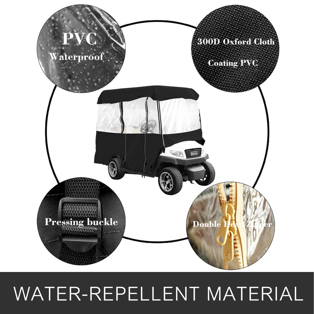 4 Passenger Golf Cart Cover Driving Enclosure Golf cart cover driving enclosure, designed to prolonged the lifetime of your golf cart by keeping it from rain, dirt, and sunray, so that you can spend more time in using it instead of cleaning it. Also it is designed to keep you from bad weather and ensure you a good mood in playing golf. Fit 4 People Premium Material Clear PVC Window Zippered Side Openings Easy Setup and Store VEVOR is a leading brand that specializes in equipment and tools. Along with thousands of motivated employees, VEVOR is dedicated to providing our customers with tough equipment & tools at incredibly low prices. Today, VEVOR has occupied markets of more than 200 countries with 10 million plus global members. Why Choose VEVOR? Premium Tough Quality Incredibly Low Prices Fast & Secure Delivery 30-Day Free Returns 24/7 Attentive Service VEVOR is a leading brand that specializes in equipment and tools. Along with thousands of motivated employees, VEVOR is dedicated to providing our customers with tough equipment & tools at incredibly low prices. Today, VEVOR has occupied markets of more than 200 countries with 10 million plus global members. Why Choose VEVOR? Premium Tough Quality Incredibly Low Prices Fast & Secure Delivery 30-Day Free Returns 24/7 Attentive Service For 4-people Cart 4-sided golf cart enclosure fit most 4-seat golf cart. Roof Top: 110x220cm/43.3x86.6in. Side Height: 158cm/62.2in. Separate rear panel for club access. Water-repellent Material 300D Oxford cloth with PVC coating, PVC window, and #10 Resin Zipper, designed for long-lasting use. Protects you from rain and wind. Transparent PVC Window PVC window is clear from both inside and outside, maximum visibility is ensured. Doors can be easily rolled up and fixed by magic tape. Detachable Front Part Detachable front part can be easily put into the side lining bag after folding for easy storage. Zippered side opening allows people easily get in and get off. Tool-free Setup Installation only needs a few minutes and requires no tool. We believe our golf cart cover is your best choice to promote your outdoor golf life experience. Useful Carrying Bag Offer you one 70cm/27.6 long, 40cm/15.7 wide carrying bag for easy storage. With this bag, you can take the golf cover from place to place with a breeze. Specifications Material: 300D Oxford Cloth, PVC Window, Roof Top: 110x220cm/43.3x86.6in Side Height: 158cm/62.2in Bag Size: 40x70cm/15.7x27.6in Package Content 1 x 4 Passenger Golf Cart Cover Driving Enclosure 1 x Carrying Bag VEVOR is a leading brand that specializes in equipment and tools. Along with thousands of motivated employees, VEVOR is dedicated to providing our customers with tough equipment & tools at incredibly low prices. Today, VEVOR has occupied markets of more than 200 countries with 10 million plus global members. Why Choose VEVOR? Premium Tough Quality Incredibly Low Prices Fast & Secure Delivery 30-Day Free Returns 24/7 Attentive Service VEVOR is a leading brand that specializes in equipment and tools. Along with thousands of motivated employees, VEVOR is dedicated to providing our customers with tough equipment & tools at incredibly low prices. Today, VEVOR has occupied markets of more than 200 countries with 10 million plus global members. Why Choose VEVOR? Premium Tough Quality Incredibly Low Prices Fast & Secure Delivery 30-Day Free Returns 24/7 Attentive Service 4 Passenger Golf Cart Cover Driving Enclosure Golf cart cover driving enclosure, designed to prolonged the lifetime of your golf cart by keeping it from rain, dirt, and sunray, so that you can spend more time in using it instead of cleaning it. Also it is designed to keep you from bad weather and ensure you a good mood in playing golf. Fit 4 People Premium Material Clear PVC Window Zippered Side Openings Easy Setup and Store For 4-people Cart 4-sided golf cart enclosure fit most 4-seat golf cart. Roof Top: 110x220cm/43.3x86.6in. Side Height: 158cm/62.2in. Separate rear panel for club access. Water-repellent Material 300D Oxford cloth with PVC coating, PVC window, and #10 Resin Zipper, designed for long-lasting use. Protects you from rain and wind. Transparent PVC Window PVC window is clear from both inside and outside, maximum visibility is ensured. Doors can be easily rolled up and fixed by magic tape. Detachable Front Part Detachable front part can be easily put into the side lining bag after folding for easy storage. Zippered side opening allows people easily get in and get off. Tool-free Setup Installation only needs a few minutes and requires no tool. We believe our golf cart cover is your best choice to promote your outdoor golf life experience. Useful Carrying Bag Offer you one 70cm/27.6 long, 40cm/15.7 wide carrying bag for easy storage. With this bag, you can take the golf cover from place to place with a breeze. Package Content 1 x 4 Passenger Golf Cart Cover Driving Enclosure 1 x Carrying Bag Specifications Material: 300D Oxford Cloth, PVC Window, Roof Top: 110x220cm/43.3x86.6in Side Height: 158cm/62.2in Bag Size: 40x70cm/15.7x27.6in