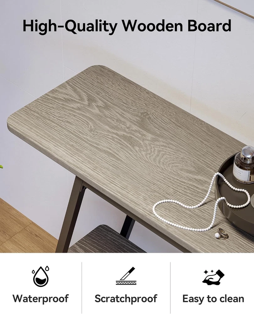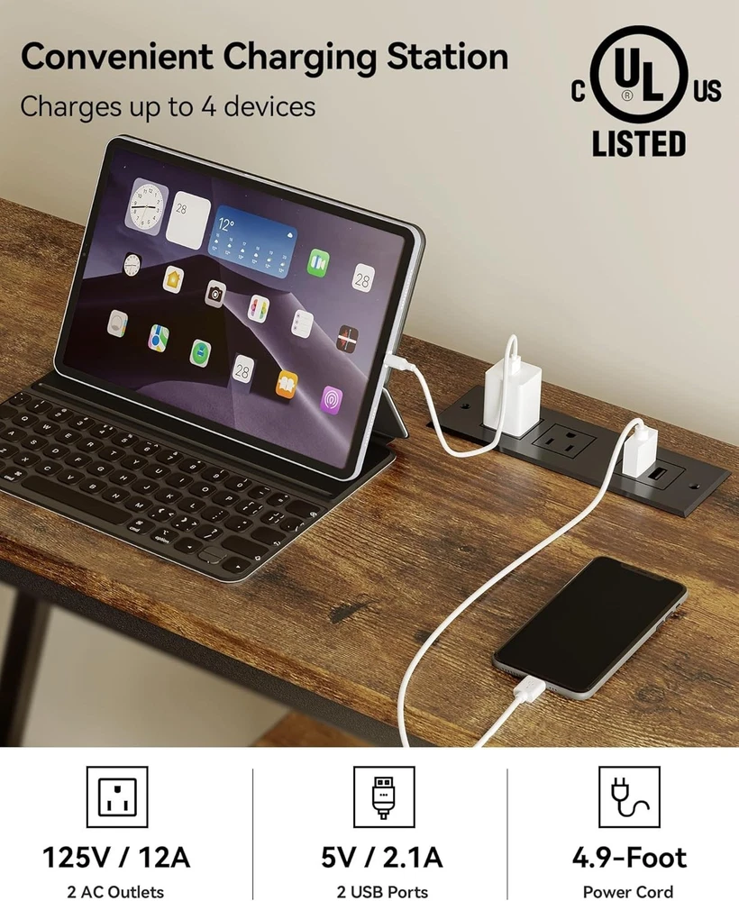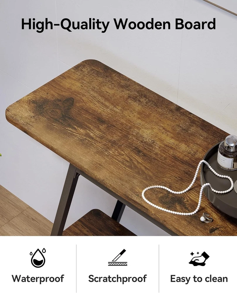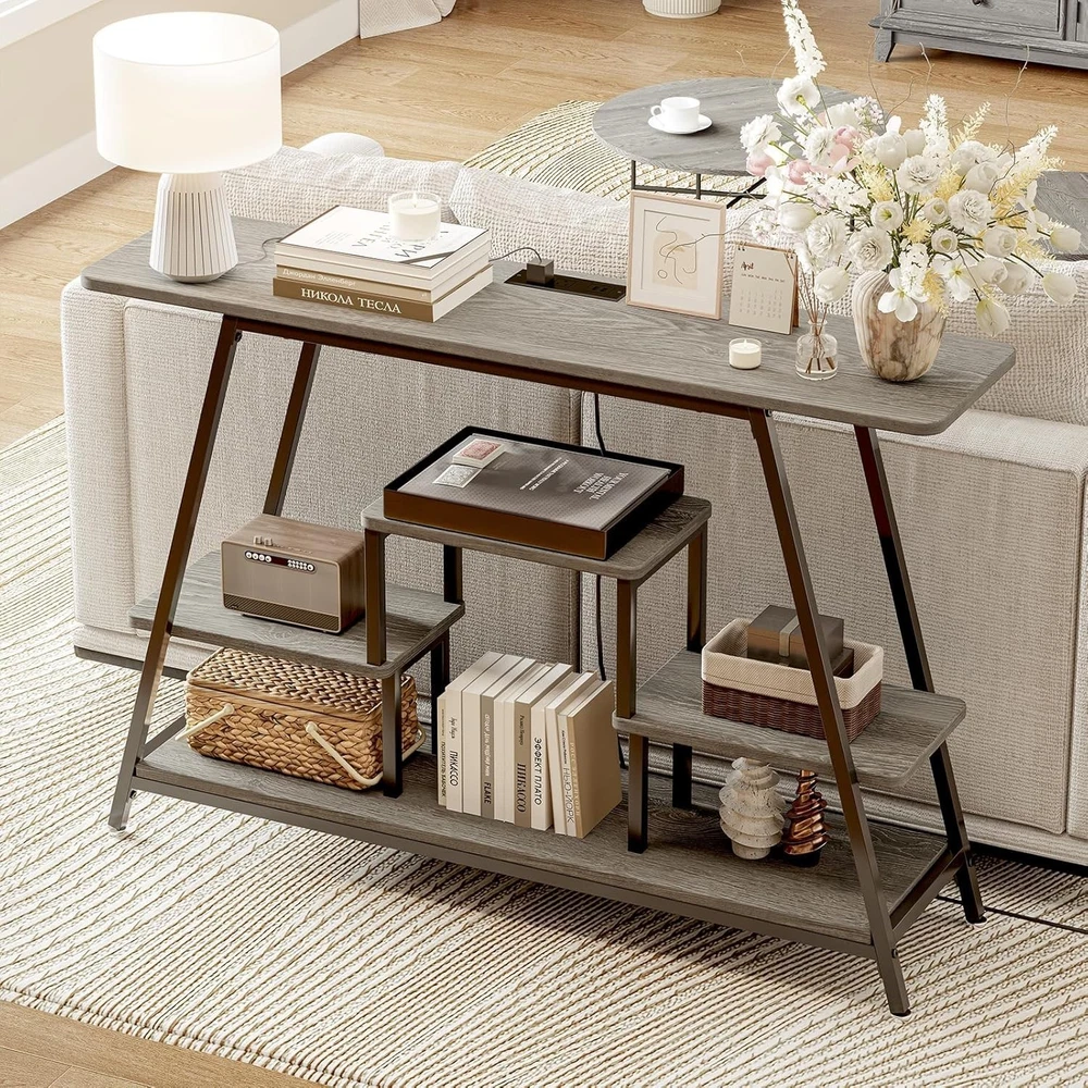Product Description About this item 【 Entryway Table With Charging Station】There is a UL-certified charging station with 2 power outlets, 2 USB charging ports and a 59" long power cord, facilitating the convenient charging of your devices such as smartphones, gaming consoles, desk lamps or Bluetooth devices. Imagine lying comfortably on the couch, playing with your phone, and listening to music without worrying about running out of battery. How blissful it is! 【Console Table With Storage】Say goodbye to the messy room! The entry table features 4 staggered tier shelves with distinctive layering, which not only creates a visually rich sense of space, but also offers plenty of storage space. Whether you want to neatly organize books, place photo frames and vases, or arrange various art decorations, this sofa table perfectly meets your needs, achieving an impeccable balance between functionality and aesthetics. 【Sofa table With Durable Construction】Built to last, this console table is supported by a metal frame and high-quality MDF boards, which offer exceptional stability and longevity. The top shelf can hold up to 110 lbs (50kg), and each of the other shelves can hold up to 55 lbs (25kg). Also, the adjustable footpads protect your floor from scratches when moving the entryway table and ensure a stable seating experience on uneven surfaces. 【Versatile Use】One entryway table, different matchings, endless possibilities for your cozy home. This compact console table, designed with a small footprint, is ideally suited for apartments or rooms with limited space. You can use it as an entryway table, sofa table, hallway table, front door table, TV console table for living room, aquarium stand, plant stand, coffee bar table. 【Safety First】We understand the importance of furniture safety. To create a safe environment for your family, the entryway table features double anti-tipping devices. Besides, the MDF boards have FSC and CARB certifications. Therefore, Susalt narrow console table is suitable for families with children and pets, which has no negative effect on health. Every detail and test is for product quality and your safety. 【30-min Quick Assembly】Say goodbye to tedious assembly! Just 30 minutes for the behind couch table. The package includes detailed assembly instructions and tools. There is also an intuitive assembly video for reference. Even if you have no experience, you can become an installation master in seconds and quickly have a cute hallway table. 【Unrivaled Service】Susalt offers attentive customer service. If you have any problems, please contact our professional support team and we will try our best to provide a quick and satisfactory solution for you.