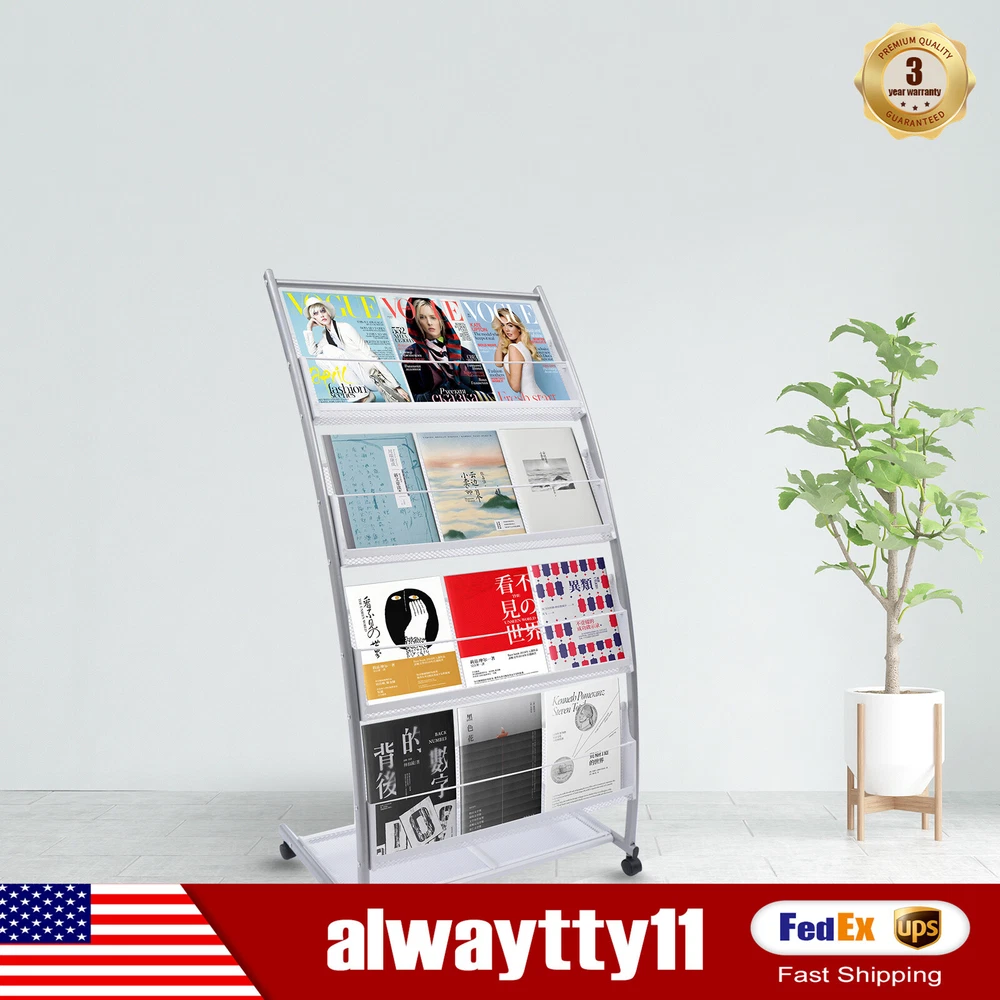 4-Tier Floor-Standing Magazine Rack Brochure Book Rack Storage for Office Store Description This is a four-tier floor-standing magazine rack. It covers an area of less than 2.4ft², and its clever design gives it a large capacity and load-bearing ability, saving you a lot of space. It is made of iron with a baked finish and is reinforced with iron plates at the bottom, which has a beautiful appearance and also has good anti-corrosion and anti-rust. It is suitable for the display of brochures or documents in offices, libraries, living rooms, bank lobbies, hotel reception, real estate companies, etc. Key Features Space-saving: It's less than 0.2m²/2.15ft², so you can place it as you like without taking up too much space. And this magazine rack is a disassembled structure, you can take them apart and store them to save space. High-quality Material: It is made of high-quality iron with a baked finish to make it more resistant to corrosion, moisture, and wear-resistant. The painted surface of the spraying process also makes it more durable and long-lasting with better color and texture. Large Capacity: Each display has four large enough shelves to display A4 brochures side by side and a flat shelf at the bottom of the newspaper rack to meet your diverse needs. Grid Design: The magazine rack's data grid is designed with a grid, which is ventilated and breathable to prevent books and magazines from getting moldy. Ingenious Design: The rectangular shelf design at the bottom of the magazine rack makes it more stable, and the multi-layer storage design is adopted to increase the carrying capacity and improve space utilization and capacity. Easy to Clean: Since it is made of iron and baked with a baked finish, the surface is smooth and does not accumulate dust easily. If there is dust, just simply wipe it with a towel. Easy to Move: The bottom of the magazine rack is designed with universal wheels, and high flexibility, easy to move without much effort. It can be moved at will to place in the position you want. Excellent After-Sales Service: We aim to provide quality products and services. If you have any problems, please feel free to contact us. We will reply and solve the problem for you as soon as possible. Details Multi-level Storage: It adopts the design of multi-layer storage so that the clever partition can reasonably increase its load-bearing capacity. This design can also improve space utilization and the magazine rack's capacity. Smooth Edges: Unlike the old steel process that will scratch your hands, the flattened edges of the magazine rack are designed to be polished smooth and free from safety hazards and will not hurt the skin. Proper Layer Spacing: The four layers of the magazine rack distance is moderate. Even if you place some relatively large magazines will not block the space between the upper and lower layers. Application It is suitable for the display of brochures or documents in offices, libraries, living rooms, bank lobbies, hotel reception, real estate companies, etc. Specification Material: Iron Surface Treatment: Baking Paint Color: White Gross Weight: 6kg/13.23lbs Product Weight: 4.5kg/9.92lbs Load Capacity: 60kg/132.28lbs Product Size: 59*40*113 cm/23.23*15.75*44.49 inch Package Size: 115*44*7cm/45.27*17.32*2.76inch Package Included 2 *Side Pipes 1 *Cross Tube 1 *Bottom Net 4 *Hanging Nets 1 *Screwdriver 1 *Pack of Screws All Accessories for Installation Notes Please allow the slight color difference caused by the shooting light and 1-3 cm error due to manual measurement, and make sure you do not mind before ordering. Payment Delivery details Terms of sales About us Contact us Payment We accept ebay payment 。 Fees such as import duties, taxes are not included in the item price or shipping costs. These charges are the buyer's responsibility. Delivery details Shipping: 2-9 working days to: USA Terms of sales We maintain high standards of excellence and strive for hundred percent customer satisfaction. Feedback is very important to us. We hope that you contact us immediately before you give neutral or negative feedback, so that we can address your concerns. It is impossible to address issues if we do not know about them! About us Your satis faction is our ultimate goal. We work hard to earn your trust and future business. Our certified technicians have tested each item before shipping. The unit comes with 1 year limited warranty on all manufacturing defects. a) If you receive a defective item, you may return it or ask for a discount. Please contact us within 14 days after you receive the package. b) What you returned must be intact and in its original packaging as re? u. Customer is responsible for shipping costs of the returned item. c) We will cover the cost of shipping back t with the shipping rate indicated in the registration page. We will send you a new unit or refund the full payment you paid. Thank you. Contact us Business Hour Business Hour: Monday To Friday: 8:30 AM to 5:00 PM (Beijing China time) Due to time zones, our reply to your questions may not be immediately. But within above working time, we will reply your email within 24 hours. If it's non-workdays, please kindly be patient and wait till Monday. Please contact us with ebay message. Please feel free to contact us if you have any questions. Monday To Friday: 8:30 AM to 5:00 PM (Beijing China time) Due to time zones, our reply to your questions may not be immediately. But within above working time, we will reply your email within 24 hours. If it's non-workdays, please kindly be patient and wait till Monday. Please contact us with ebay message. Please feel free to contact us if you have any questions.