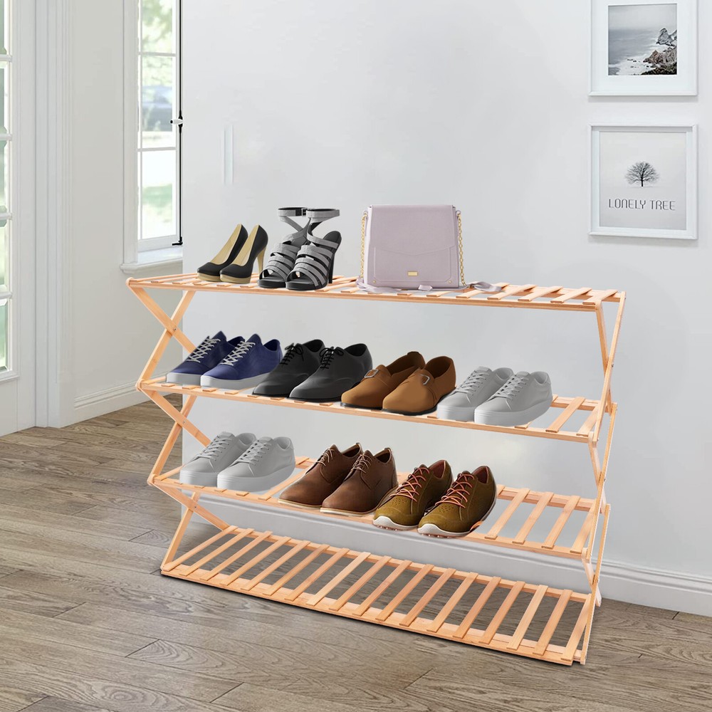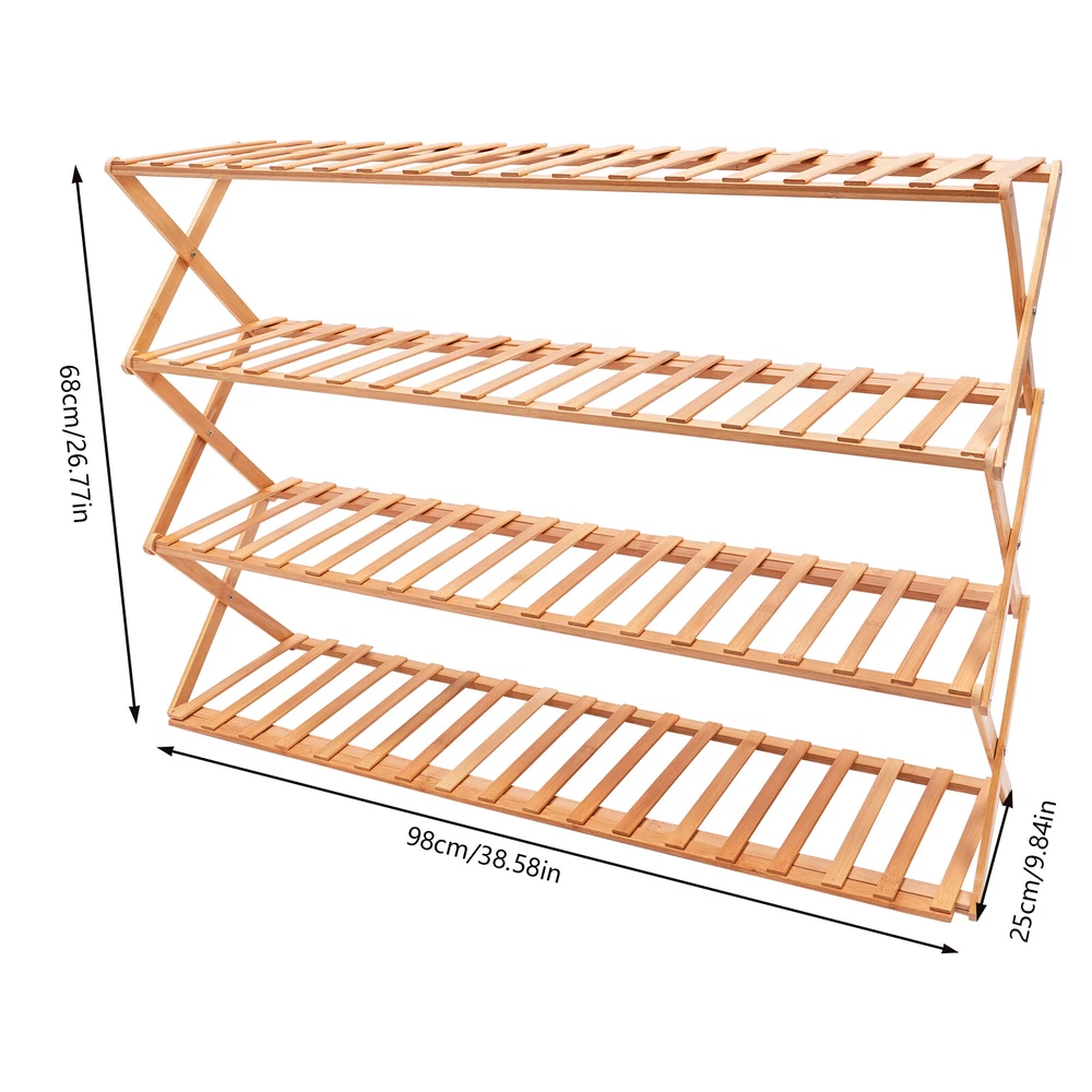 Description Are you beset by the vexing dilemma of wayward shoes scattered haphazardly throughout your abode? Allow us to illuminate an exquisite fusion of utility and elegance: the 4-tiered foldable shoe rack. This innovative foldable shoe rack elegantly transforms disorganization into a calm and orderly atmosphere for a tidy home. Key Features Stable and Durable: It is made of high-quality bamboo(fragrant and odorless), which is carefully polished, anti-corrosion and moth-proof, tough and durable to ensure a long time of use. 4-tiers Large Capacity: Designed with four layers of spacious storage space (38.58*9.84*26.77in), it can easily store all kinds of shoes, whether it's high-heeled shoes, sneakers or boots, can be placed in an orderly manner to maximize the use of space. Living Room Shoe Rack 4-Tier Foldable Shoe Shelf Entryway Hallway Closet Bamboo Description~~ Description Are you beset by the vexing dilemma of wayward shoes scattered haphazardly throughout your abode? Allow us to illuminate an exquisite fusion of utility and elegance: the 4-tiered foldable shoe rack. This innovative foldable shoe rack elegantly transforms disorganization into a calm and orderly atmosphere for a tidy home. Key Features Stable and Durable: It is made of high-quality bamboo(fragrant and odorless) , which is carefully polished, anti-corrosion and moth-proof , tough and durable to ensure a long time of use. 4-tiers Large Capacity: Designed with four layers of spacious storage space (38.58*9.84*26.77in), it can easily store all kinds of shoes, whether it's high-heeled shoes, sneakers or boots, can be placed in an orderly manner to maximize the use of space. Flexible Folding: Innovative folding design allows you to easily fold and put away when not in use, saving space and easy to carry and store. Stable Support: Thickened board (15mm) and X-shaped cross-bracing structure enhance overall stability, allowing for a stable weight capacity of 88.18 lbs. per layer. Simple and Generous: It retains the natural color of bamboo on the surface, while the original wood style blends ideally with various home decorating styles, adding a touch of natural flavor to your living environment. Installation-Free: The one-piece foldable design allows you to start using the product directly after receiving it without the need for complicated installation. Effortless Cleaning: Thanks to its smooth surface and simple construction, you can just wipe it gently to remove stains. Customer Service: We aim to provide quality products and services. If you have any problems, please feel free to contact us. We will reply and solve the problem for you as soon as possible. Details Even Gap: The strip gap (1.38in) is even and organized, preventing items from falling out and giving you peace of mind when using it. Delicate Touch: Each piece of bamboo is finely polished and delicate to the touch, presenting the beauty of natural texture. Carabiner Design: It holds the shoe rack firmly and provides more stable support. Smooth Edges: The smooth and burr-free edges enhance the beauty of the product and better care for your skin when installing and cleaning it. Application It is suitable for entrance,study room, living room, kids room, bedroom, hallway, balcony, patio gate, garage, outdoor, and many other places. It can be used as a shoe rack, display rack, flower rack, and bookshelf, used to organize all kinds of shoes as well as books, potted plants, cutlery, tablets, cell phones, and other daily sundries. Specification Material: Bamboo Color: Wood Process: Polished Feature: Foldable Mount Type: Freestanding Assembly Required: No Number of Tiers: 4 Board Thickness: 1.5cm/0.59in Individual Strip Widths: 2cm/0.79in Single Tier Load-capacity: 40kg/ 88.18 lbs Product Size: 98*25*68cm/38.58*9.84*26.77in Package Size: 95*30*9cm/37.4*11.8*3.5in Net Weight: 4kg/8.82 lbs Gross Weight: 4.05kg/8.93 lbs Package Included 1* 4 -tiered Foldable Shoe Rack 1* English Diagram Notes Please check the color and size before purchasing. Please follow the diagram for usage. Please do not fully open when unfolding, so as to avoid pulling too wide, which may cause the panel is not good to take on the crossbar; wait for all panels to take on the crossbar and then fully unfolded. Be careful not to clip your hand as you unfold shoe racks. When it needs to be taken away or moved, the bamboo shoe rack can be easily stored by operating it in the reverse direction according to the unfolding method. For friends who have pets at home, especially your cats are more curious, you can fix the shoe rack with tape or related things according to your own situation, so as not to be knocked down. If you put a relatively heavy item for a long time on the shoe rack and bend it, you can take it off for a few days, because the shoe rack is made of bamboo with good toughness, and it will naturally recover after that. Please allow the slight color difference caused by the shooting light and 1-3cm error due to manual measurement and make sure you do not mind before ordering. welcome Welcome Payment Delivery details Terms of sales About us Contact us Payment We accept ebay payment 。 Fees such as import duties, taxes are not included in the item price or shipping costs. These charges are the buyer's responsibility. Delivery details Shipping: 2-9 working days to: USA Terms of sales We maintain high standards of excellence and strive for hundred percent customer satisfaction. Feedback is very important to us. We hope that you contact us immediately before you give neutral or negative feedback, so that we can address your concerns. It is impossible to address issues if we do not know about them! About us Your satis faction is our ultimate goal. We work hard to earn your trust and future business. Our certified technicians have tested each item before shipping. The unit comes with 1 year limited warranty on all manufacturing defects. a) If you receive a defective item, you may return it or ask f