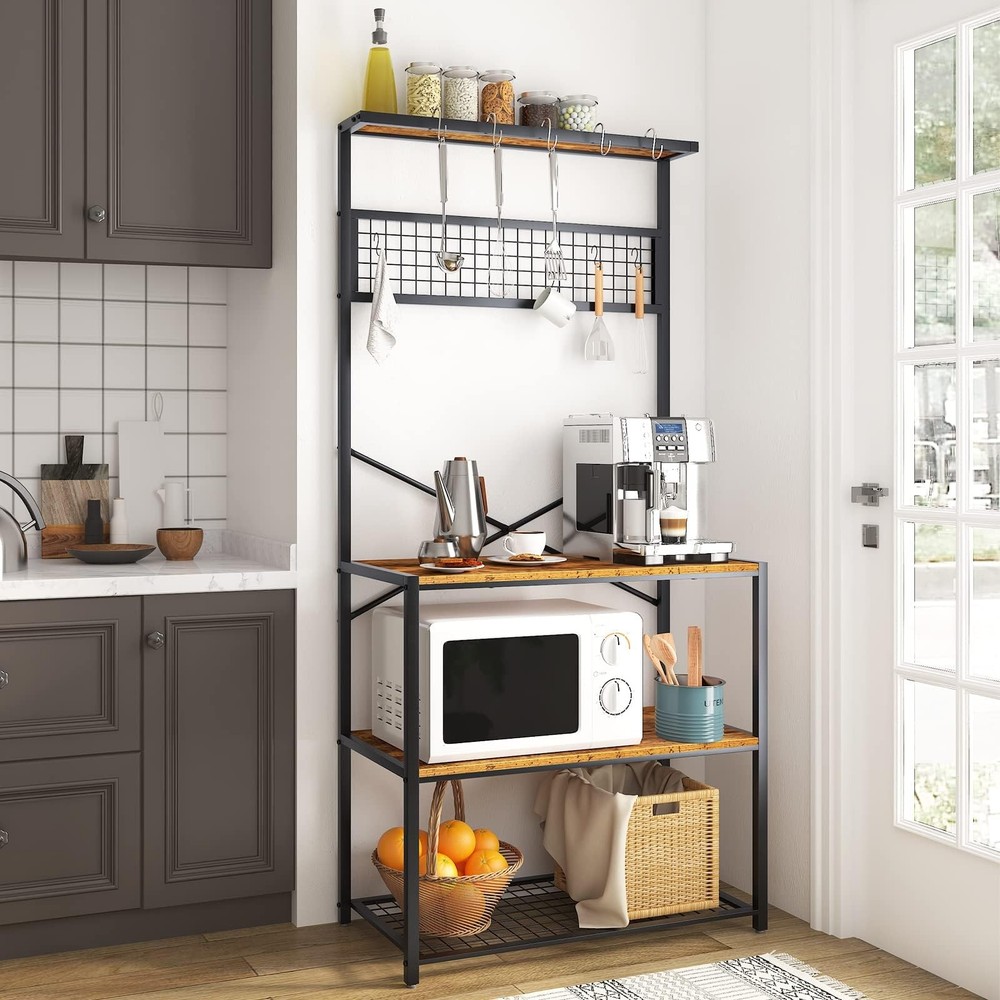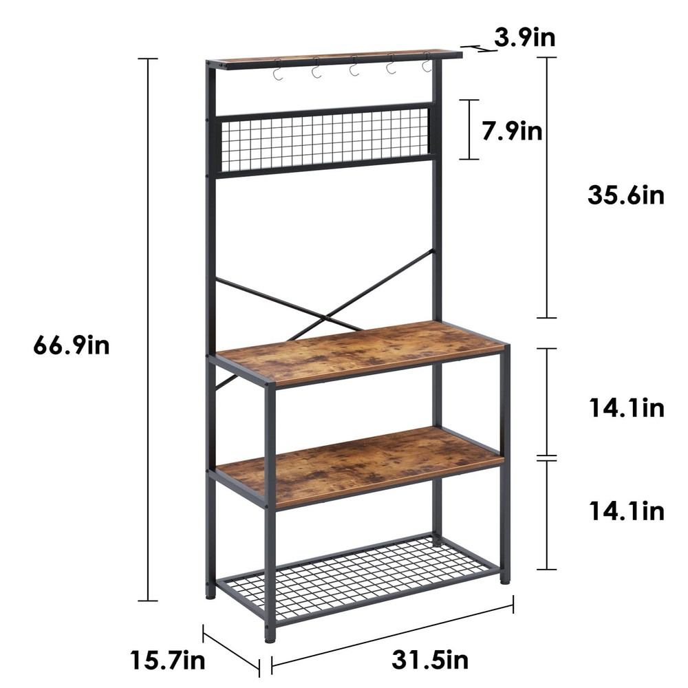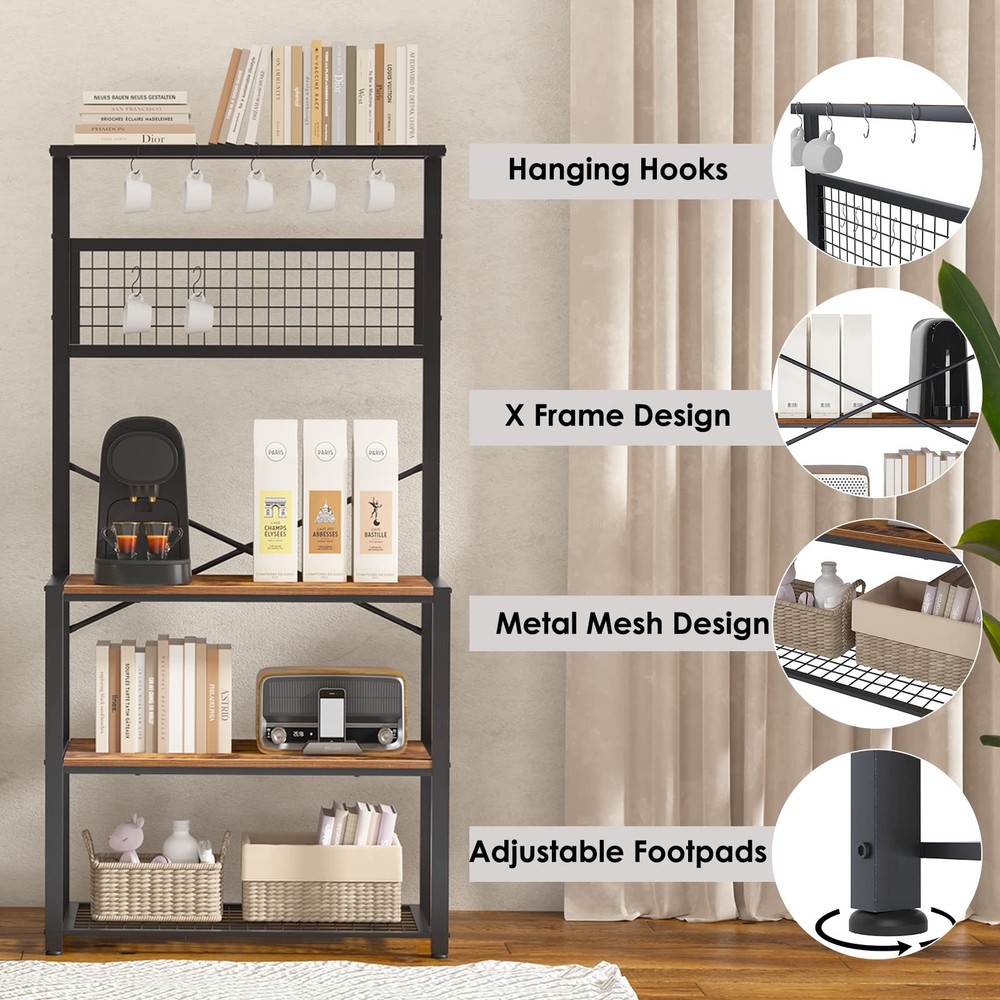 【Multi-Purpose】 This is a multi-functional storage shelf that can be used as a coffee bar, microwave stand, baker's rack, spice rack organizer, and kitchen island in your kitchen. It also includes three particle wood boards and one mesh shelf, providing plenty of storage space. You may prepare food on the wide and open countertop as well 【Durable and Stable】 The storage organizer is made of E1 quality particle board and a heavy-duty 'X' shaped metal frame, making it more solid and durable. Great looking and smooth surface that is also simple to clean that may fulfil your diverse storage demands and put an end to the mess in the kitchen 【Adjustable Feet】 Even on uneven terrain, the industrial bakes rack is secure and rock strong thanks to the thoughtful detailing. It also contains anti-slip and anti-scratch properties to provide a worry-free experience 【Dimension】 The size of our kitchen bakers rack is 33.5 x 15.7 x 66.9 inch and weighs 15.3 Kg. Hand measured, for your reference 【Great After Sales Support】 If you have any issues with the product, please contact us directly. We will respond within 24 hours and give a solution