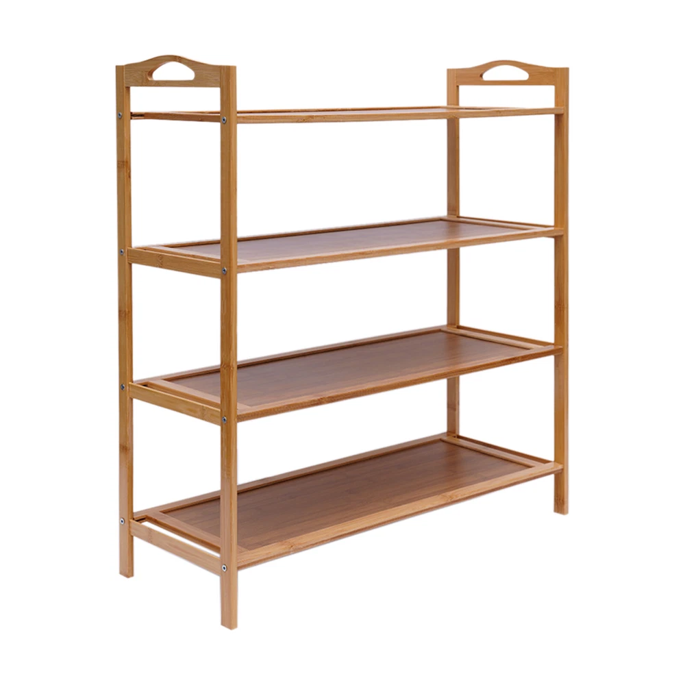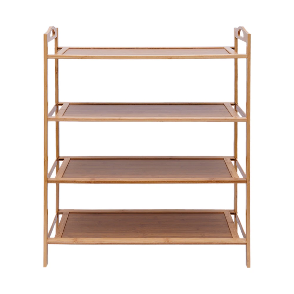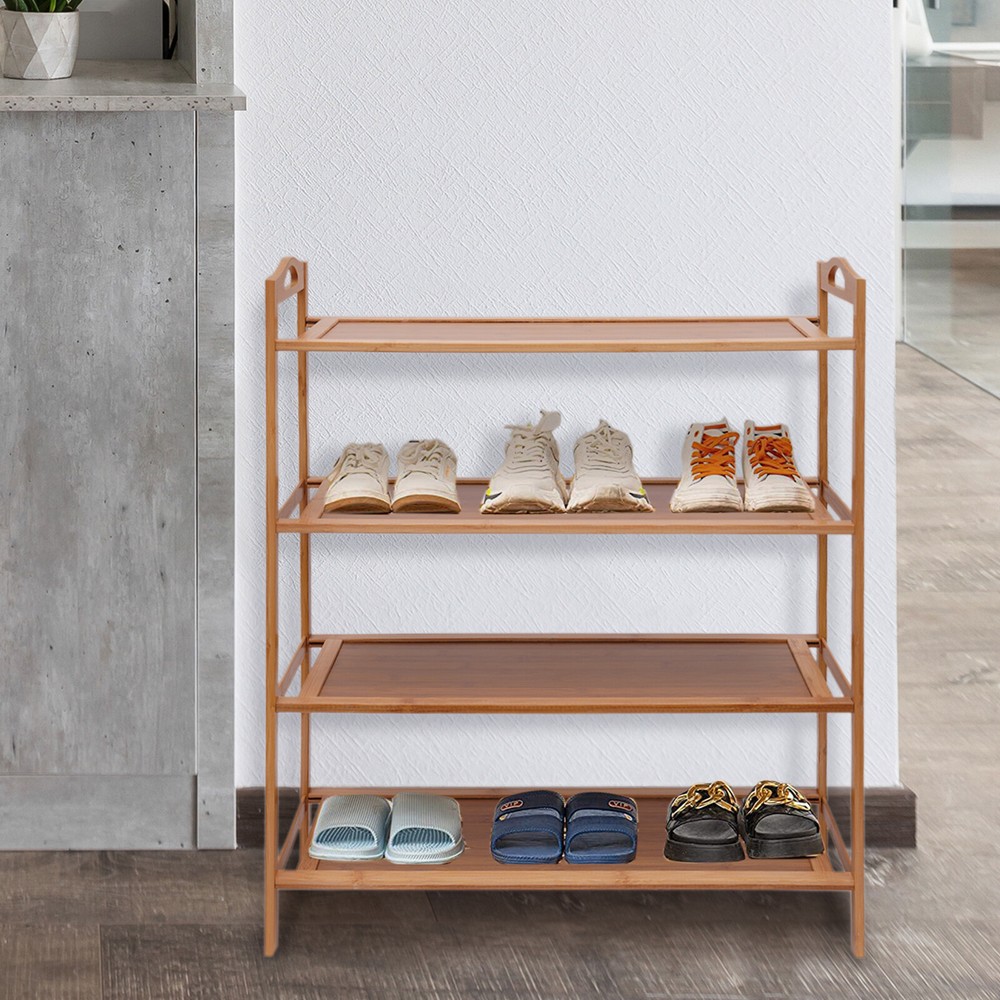 Specification Material: Natural Bamboo, Density Board Color: Wood Color Process: Paint Spraying, Polishing Style: Modern Assembly Required: Yes Mounting Type: Free Standing Number of Tiers: 4 Product Size: 60*25*67cm/23.62*9.84*26.38in Package Size: 97*25.2*7.2cm/38.19*9.92*2.83in Each Tier Load Capacity: About 7.5kg/16.53lbs Gross Weight: 3.5kg/7.72lbs Net Weight: 3kg/6.61lbs Package Included 1* Shoe Rack Other Accessories for Assembly Notes Please allow the slight color difference caused by the shooting light and 1-3cm error due to manual measurement, and make sure you do not mind before ordering. Application It is suitable for kitchen, balcony, office, bedroom or entrance to store Spices, tableware, sundries, flowers, vegetables, flower pots, books, tea sets, school supplies, accessories, shoes and bags. Made to Last: Our product is made of high-quality bamboo and density boards by polishing and paint spraying processes, which is sturdy with strong load-bearing capacity and toughness, and not easy to deform, ensuring a long service life. Large Capacity: The four-tier design provides ample storage space, and each tier can easily accommodate multiple types and sizes of shoes. Whether it's your daily wear or seasonal shoes, they can be arranged in an orderly manner to meet the diverse needs of family members. Open Structure Design: The open structure facilitates ventilation of the shoes and prevents the growth of bacteria, ensuring that the shoes are clean and tidy while making them easy to access. Environmentally Friendly: Bamboo is a renewable resource with a short growth cycle and rapid self-renewal after harvesting. Compared with other woods, the use of bamboo is more in line with the concept of environmental protection and reduces the pressure on forest resources. Natural Beauty: The unique texture and wood color give the shoe rack a natural, rustic beauty, making it a harmonious match with various home styles and enhancing the warmth and quality of life in the space. Easy Assembly: Simple structure and complete accessories help you finish the installation quickly and use it in a short time. Effortless Cleaning: It has a smooth surface and an open structure, so you only need to wipe the dust or residue with a towel. Multifunctionality: In addition to storing shoes, it can also be used to place books, toys, or other household items, flexibly adapting to different scenarios and enhancing space utilization.