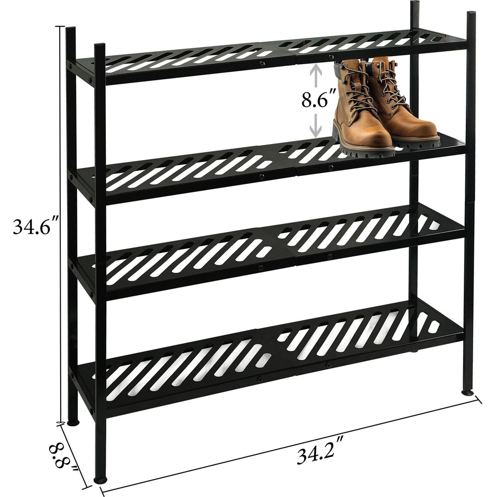 Shoe Rack, 4-tier FreeStanding Shoe Shelf Stand, Stackable Shoe Storage Organizer for Closet, Holds up to 20 - 24 Pairs of Shoes for Entryway, Garage, Front Door Entrance, Metal, Black LARGE CAPACITY: 4 tiers of heavy-duty shoe organizer can store up to 20-25 pairs of women's and children's shoes, each unit can be easily organised to store 4 pairs of adult trainers and tennis shoes, extra bottom storage for 6 pairs of slippers, flip-flops and flats,each shelf can hold up to 35lbs STACKABLE SHOE RACKS: 2 sets of shoe organizer racks can be stacked vertically to form a complete 8-tier shoe stand, stacked high shoe racks can remove one unit of shelves to provide more space for tall boots, space-saving and tidy, with adjustable feet on the bottom to adjust the balance on unbalanced floors SIZE: L 34.2 inches x W 8.8 inches x H 34.6 inches, the distance between each unit of the shoe holder is 8.6 inches EASY TO INSTALL: It only takes a few minutes to install the sturdy shoe storage rack! Comes with installation instructions and necessary screws, no tools required MULTIFUNCTIONAL: Multi-tier shoe shelves is suitable for wardrobes, front door entrances, garages, entryways and indoor-outdoor corners