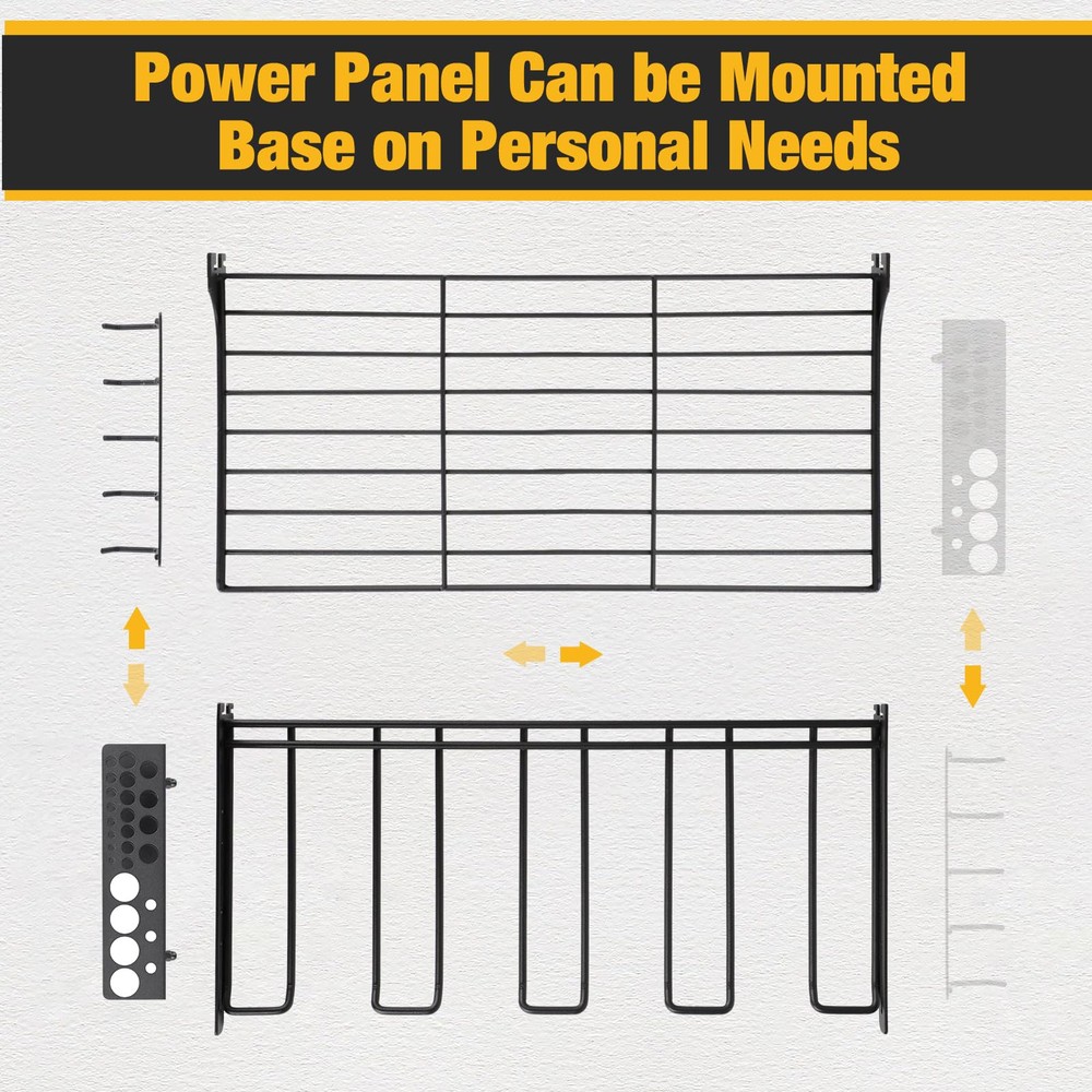 Durable Design: power tool organizer is crafted from high-quality iron with excellent welding craftsmanship, ensuring a robust connection between its components. This design allows it to withstand the weight of power tools without deformation or loosening, and the paint won't peel, guaranteeing reliable storage and support for your tools. Ingenious Adjustable Design: cordless tool rack features a 4-tier shelving system that offers flexible height adjustments. 3 tiers can accommodate toolboxes, other commonly used tools, or accessories, while the bottom tier can hold up to four electric tools. User-Friendly Features: tool organizer includes thoughtful features such as a dedicated slot for drill bits and screwdrivers for quick access. The included curved hooks can be used to hang pliers, hammers, wrenches, and other tools and accessories, enhancing the efficiency and tidiness of your workspace. Easy Installation: We provide a straightforward and easy-to-follow installation guide, allowing you to complete the setup in just a few simple steps. No complex tools or professional skills are required, making it effortless for you to enjoy a more organized workspace. Versatile User Base: electric tool organizer caters to a diverse user base, including craftsmen, DIY enthusiasts, garage and workshop organizers, professionals in repair and construction industries, and homeowners with electric tools. It's a versatile solution for anyone seeking efficient and organized tool storage.