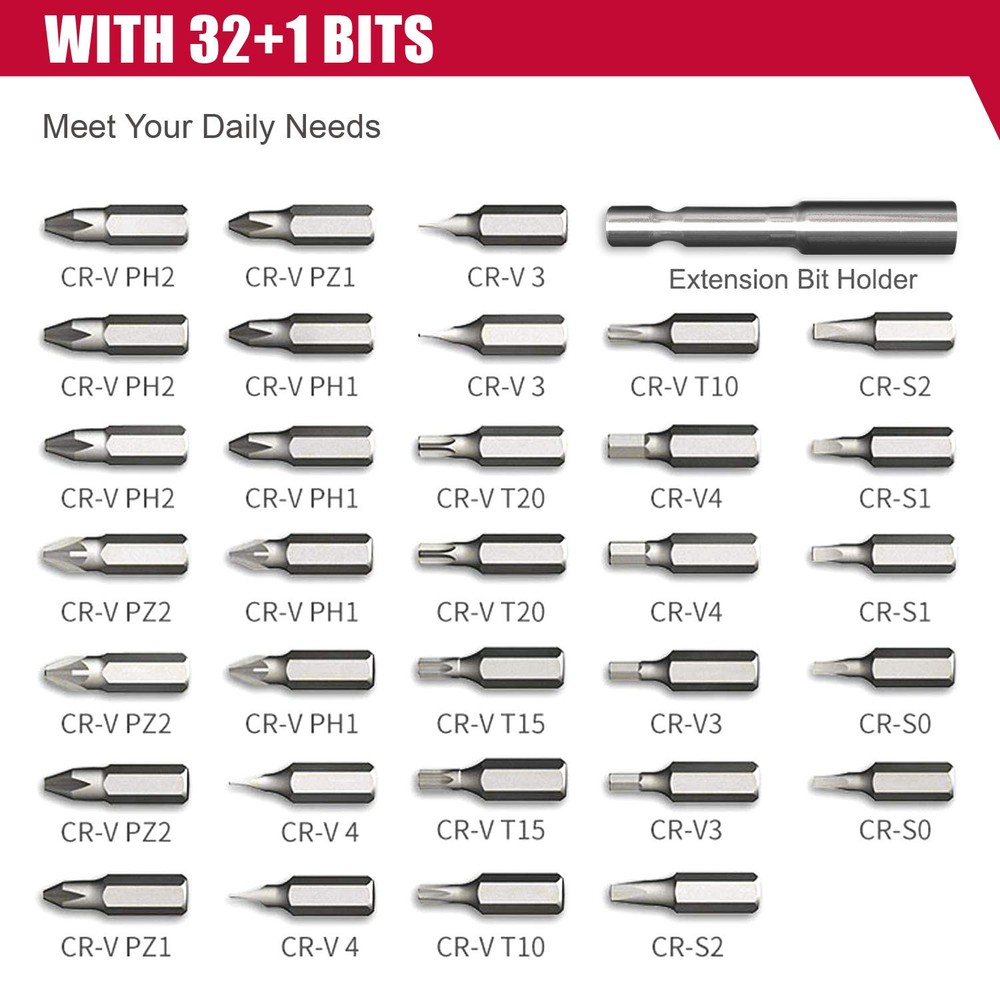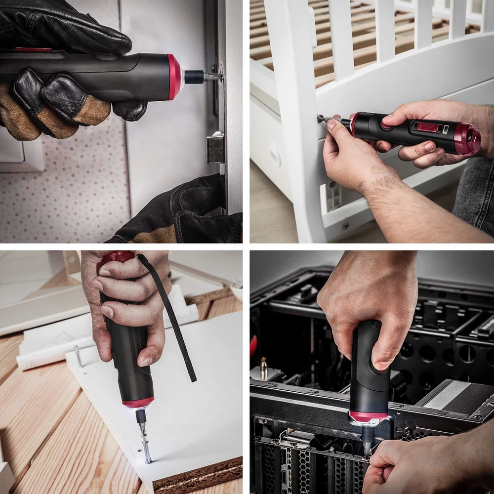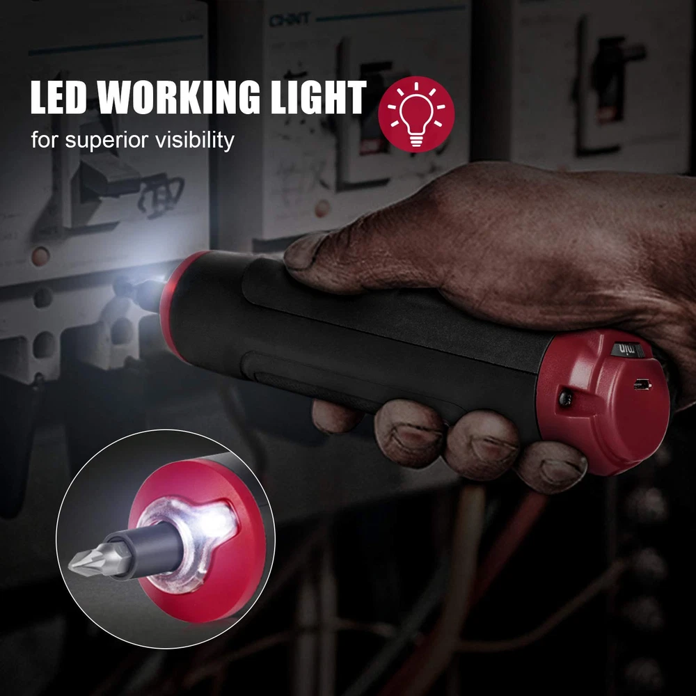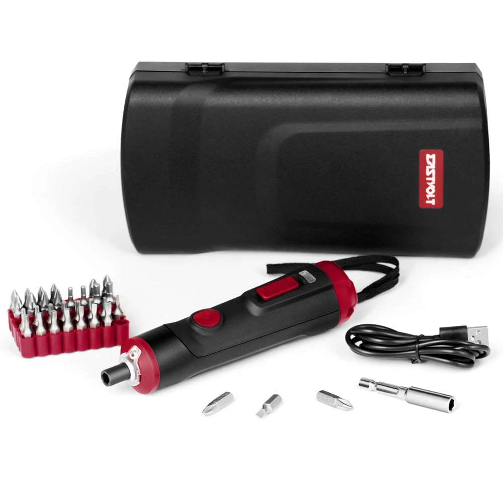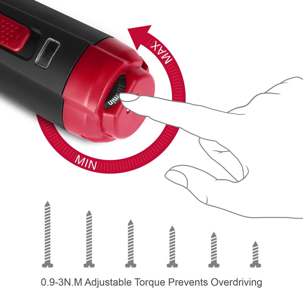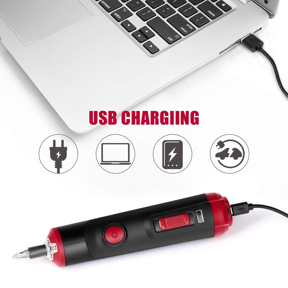 4V Smart Screwdriver Voltage: 4. 0V No Load Speed: 260rpm Torque: 0. 9~3N. M (variable torque ) Max Torque for Manual: 10N. M Chuck capacity: 1/4"(6. 35mm) Hexagonal Battery type: 1. 50Ah li-ion(inbuilt) Charging interface: MICRO USB Operation time under full charging : 3-4h. Charging time : 45mins(5V/2A)/90mins(5V1A) Including: 32 drill bits+1pc extend rod No charger included. diretion switch: the three directions are forward, reverse and stop. 【DESIGNED FOR SMALL APPLIANCES AND LIGHT DUTY WORK】 No load speed of 260rmp makes it a better of handtool screwdrivers. Its compact and light-weight features with a magnetic hexagonal head, making it suitable for some small appliants and light-duty work, like circuit repair, bicycle repair, electrical maintenance, switch installation, etc. 【CONVENIENT CHARGE & WIRELESS DESIGN】It can be charged anywhere with the USB plot, like laptop, powerbank, car charger, etc. 【SAFTY USE】 3-gear mode are forward, reverse and stop. Spindle lock allows users to fasten and loosen screws manually so that the users can under greater control of the work. Overdrive protection and variable torgue settings prevent damaging surfaces and stripping the hole. 【EASY USE】 Battery indicator indicates real-time battery level; Front LED light makes it possible to work in dark area; Small carrying case makes it easy for carring and storage 【PACKAGE CONTENTS】1* 4V Mini Screwdriver; 32* Drill Bits; 1* Extension Bit Holder; 1*USB Charging Cable; 1* Toolbox; 1*User Manual.