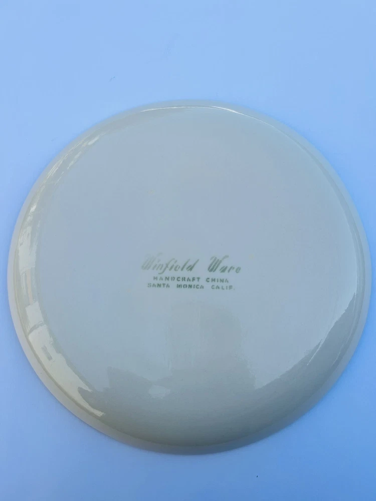Add a touch of vintage charm to your dining table with these four large chop plates from Winfield Ware. Crafted in California in the 1940s, these ceramic plates feature a beautiful multicolor design that is sure to impress your guests. Perfect for serving meat dishes, these platters are made using a pottery production technique and are ideal for collectors and enthusiasts alike. Bring a piece of history to your table with these unique and stylish plates. Beautiful set of (4) no chips or cracks 7.16.24
