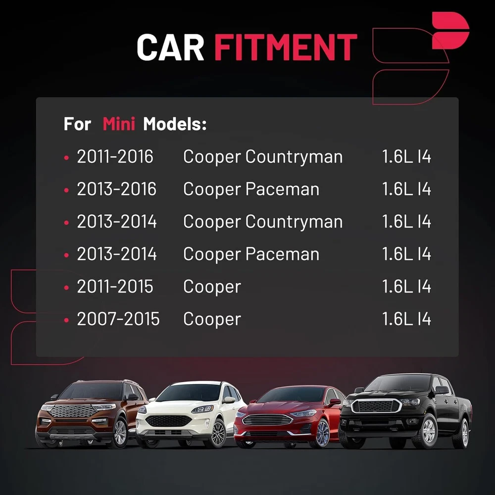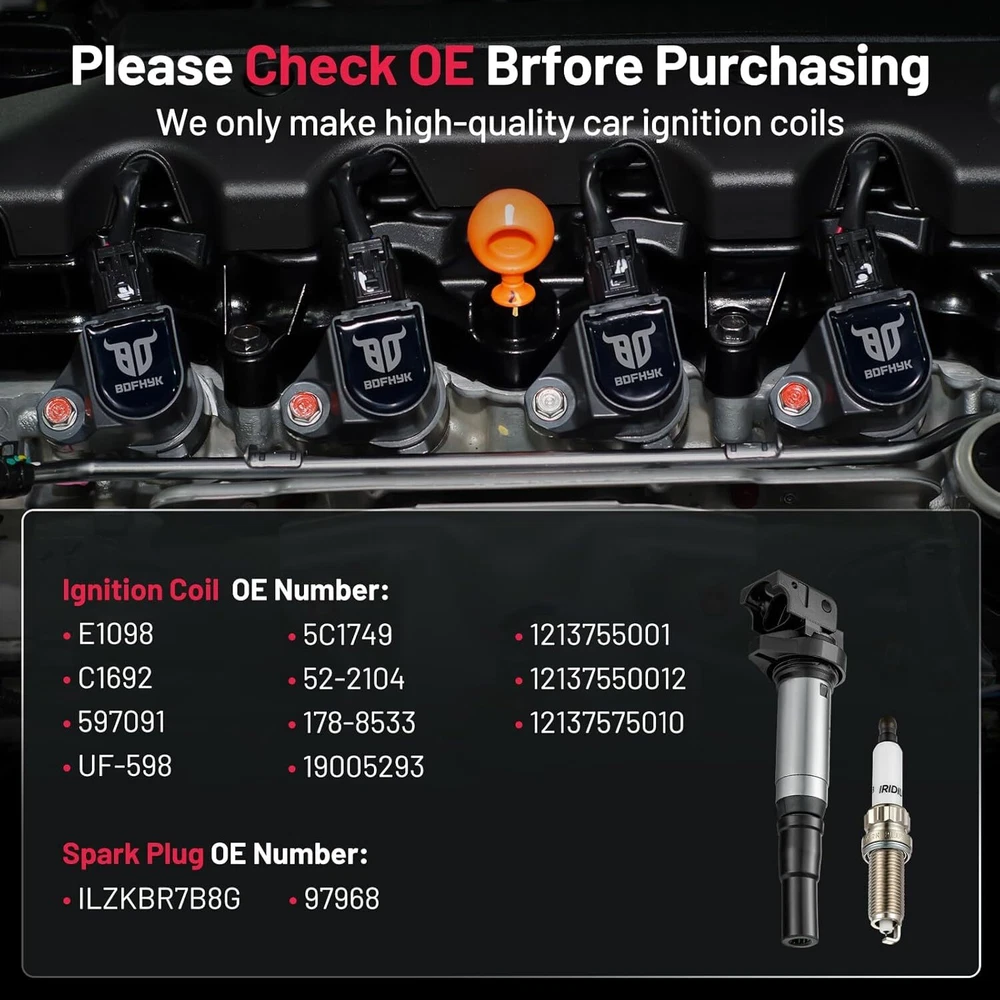 Package include: 4X UF598 Ignition Coils + 4X ILZKBR7B8G Iridium Spark Plugs Specification: Voltage: 12V Connector Gender:Female Terminal Gender:Male Connection: 3 pins Terminal Type: Blade High Performance High Energy, 15% more energy than regular coils Brand new ignition coil set, never used or installed Ready to use, Direct Replacement Interchange Part Number: C1692, UF598, 12137575010, 1213755001, 12137550012 UF-598, 5C1749, E1098, IC688, 597091, 52-2104 Spark Plug Part Number: ILZKBR7B8G Spark Plug Material: Iridium Compatible Vehicle With: For 2007 Mini Cooper 1.6L L4 For 2008 Mini Cooper 1.6L L4 For 2009 Mini Cooper 1.6L L4 For 2010 Mini Cooper 1.6L L4 For 2011 Mini Cooper 1.6L L4 For 2012 Mini Cooper 1.6L L4 For 2013 Mini Cooper 1.6L L4 For 2014 Mini Cooper 1.6L L4 For 2015 Mini Cooper 1.6L L4 For 2011 Mini Cooper Countryman 1.6L L4 For 2012 Mini Cooper Countryman 1.6L L4 For 2013 Mini Cooper Countryman 1.6L L4 For 2014 Mini Cooper Countryman 1.6L L4 For 2015 Mini Cooper Countryman 1.6L L4 For 2016 Mini Cooper Countryman 1.6L L4 For 2013 Mini Cooper Paceman 1.6L L4 For 2014 Mini Cooper Paceman 1.6L L4 For 2015 Mini Cooper Paceman 1.6L L4 For 2016 Mini Cooper Paceman 1.6L L4