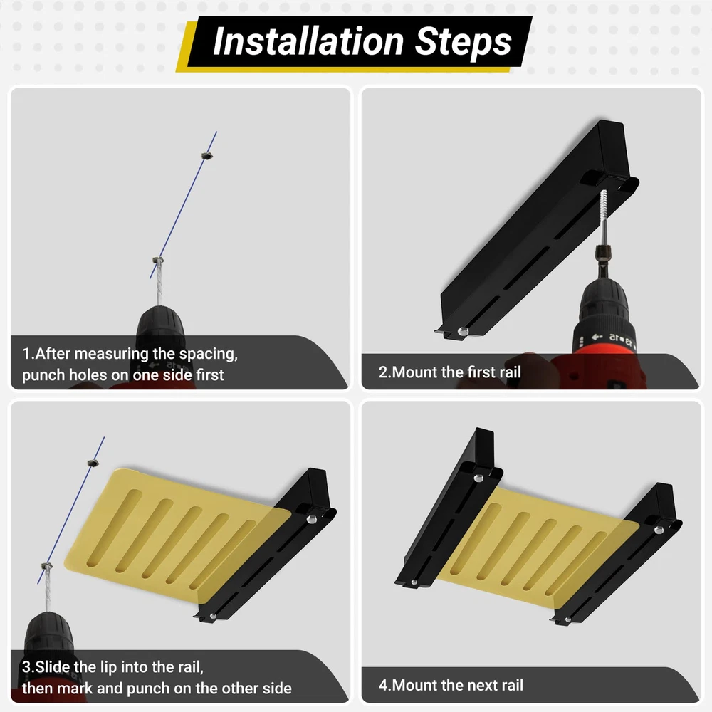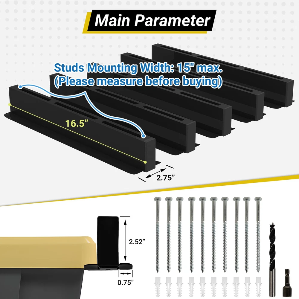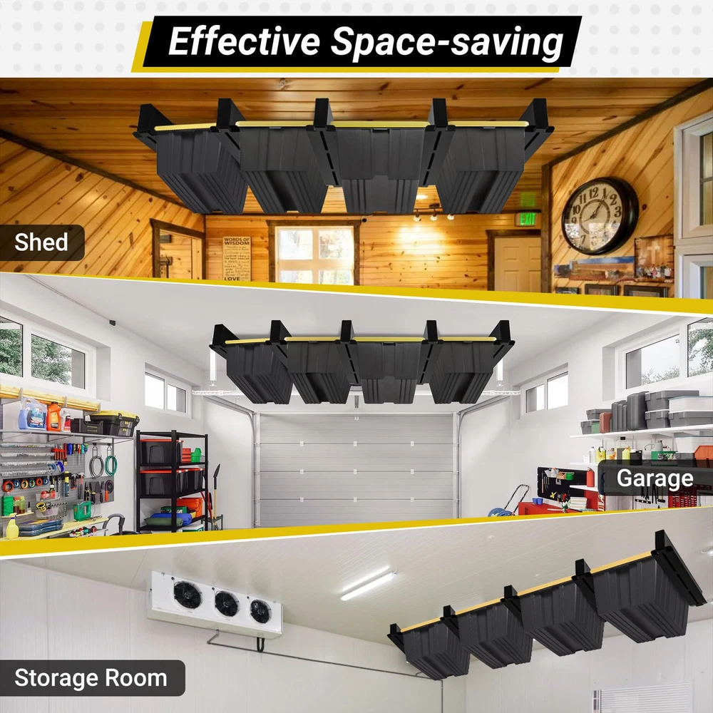 Garage Storage System: Designed for optimal space management, the garage storage racks stores up to 4 bins on top. The overhead garage storage racks are perfect for garages or sheds for efficient space organization (Note: Bins are not included) Expandable T-shaped Design: Our ceiling storage racks feature a unique T-shaped design. The garage ceiling storage hold more boxes if mounted horizontally, so you can buy an extra set for extra storage space ( Product Dimension: 16.6”L x 2.75”W x 2.8”H) 400 LBS Load Capacity: The 4-bin storage racks hold up to 400 pounds and is large enough to hold most common tools and accessories, sports equipment, camping gear and more High-quality Materials: Our garage overhead storage racks are made of sturdy, heavy-duty steel. The coating process on the surface provides effective protection against corrosion and long-lasting use Professionalism and Safety: These tote storage racks are equipped with specialty screws to securely fasten to ceiling joists and will not come loose. The anti-detachment design ensures complete safety for you and your items Easy to Install: In addition to the essential screw kits and detailed installation instructions, our ceiling racks are supplied with an drill for your convenience