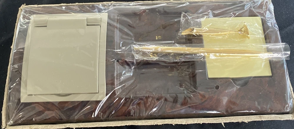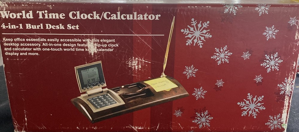 The World Time Clock/Calculator 4-in-1 Burl Desk Set 2003 is a vintage desktop item that features a unique burlwood look design. This collectible piece combines a clock, calculator, and world time display functions in one convenient desk set. Perfect for adding a touch of retro charm to any workspace, this item is both functional and decorative, making it a standout piece for collectors of desktop items or vintage decor.