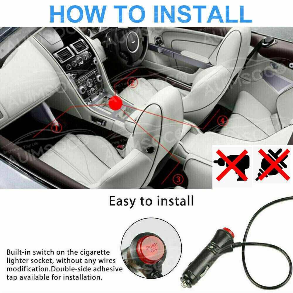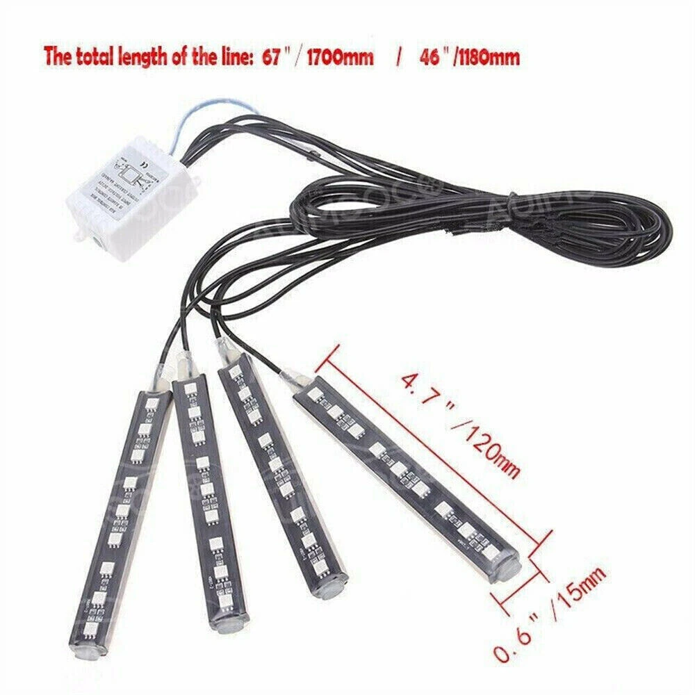 Features: Brand new and high quality. This is about one set of decoration light, including 4 pieces lights one cigarette lighter and one remote control. Simple design for you a beautiful, exotic and romantic interior. Double-side adhesive tap available for installation. It can be used on the car interior floor or dash. Remote Function: on/off, change color, change flashing pattern, change flshing speed. Specifications: Number of LEDs: 9 LEDs Per Light Colour of LEDs: RGB Colourful Source Type: 5050SMD Waterproof Level: IP65 Scope: ambient lighting Current: 0.03A Voltage: 12V Power: 3W Lamp beads: 4 * 9LED APPLICATION: Universal Single LED Strip size: 12CM Length of the light line: two of them are 67 inch (170cm), the other two are 46 inch(118cm) Length of the cigarette lighter line: 0.55m Light Color: Colorful (Colors can be Set via remote control ) Installation: Directly put the cigarette lighter into the cigarette lighter socket, without any wires modification. (Notice :Not Include Remote Battery ,If you have any question ,you can always contact us) Package Includes: 1set(4pcs)Led Car RGB LED Atmosphere Lights+RF Controler