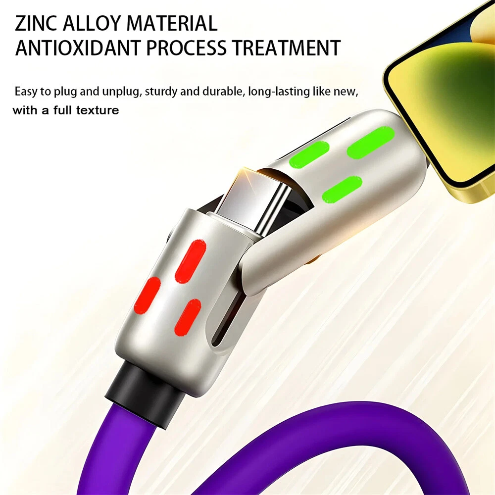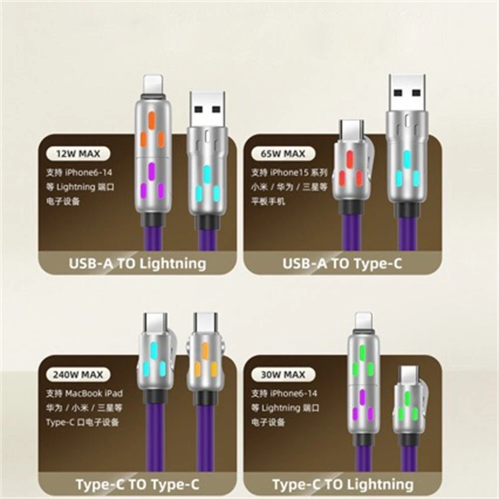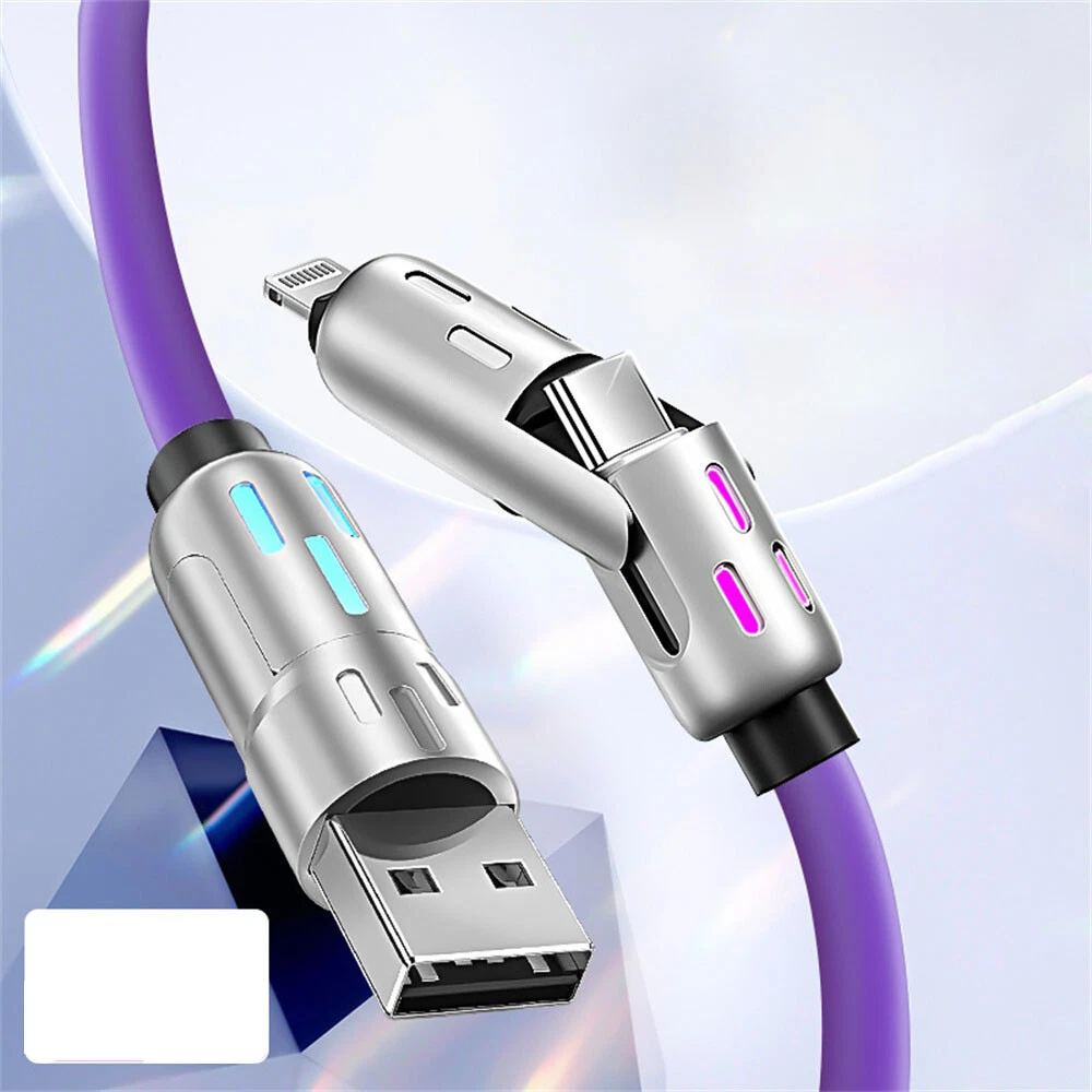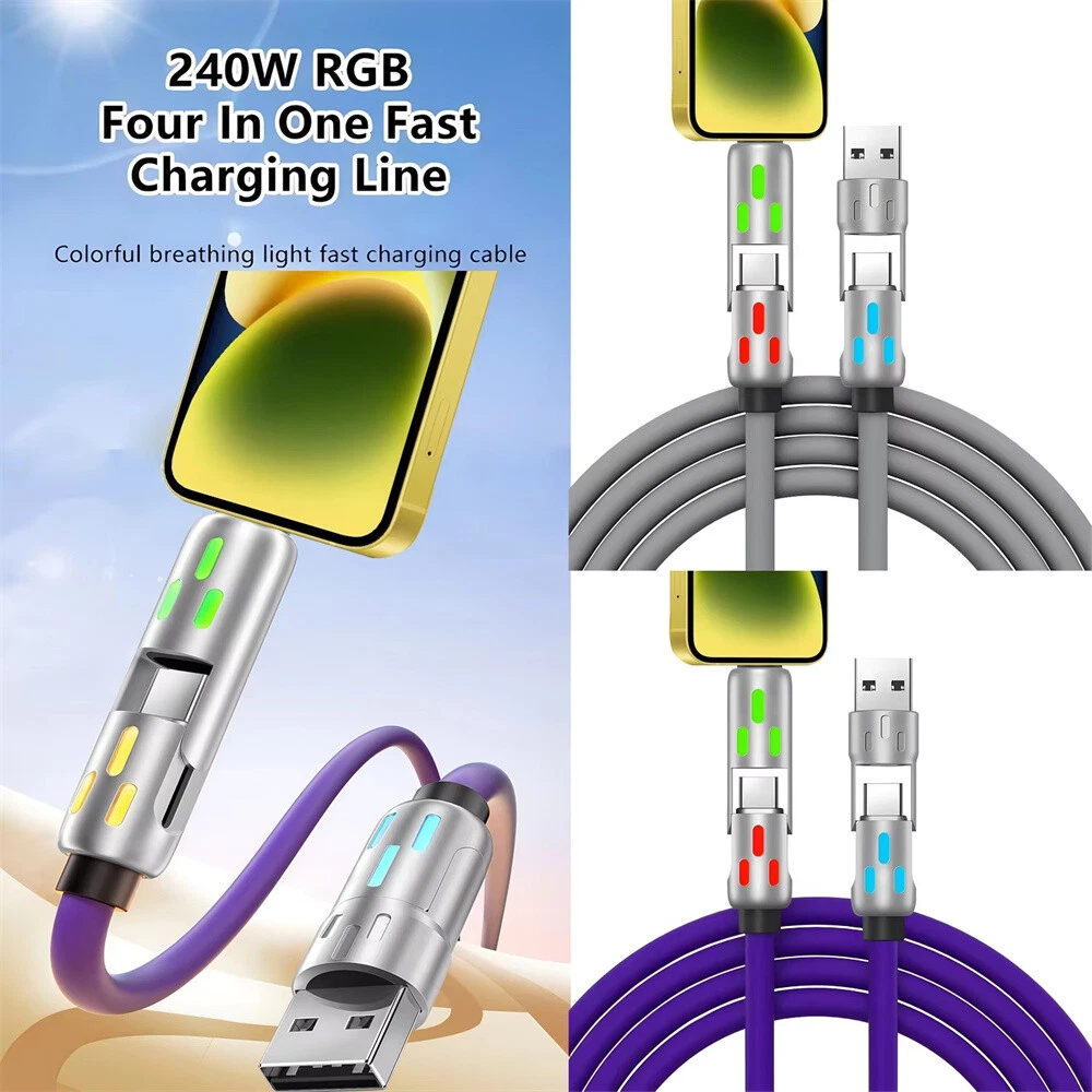 Description: Colorful breathing light fast charging cable 240W fast charging fully Universal with everything High power to low power 240/140100/60/30W device data cables are fully compatible Four modes, four options Four interfaces can be combined at will, multi-protocol full device support can be switched between mobile phones, tablets and other devices 240W fast charging PD full series compatible Support iPhone7-iPhone15 Samsung and other mobile phones compatible Colorful atmosphere lights make charging at night more convenient With soft colorful atmosphere lights, you can find your phone clearly when charging at night Zinc alloy material anti-oxidation process Free plug and unplug,as good as new, full of texture Free bending and long-term use without breaking After 20000+ bending test, wear-resistant and non-breaking, with longer service life Bold gold-plated copper wire charges faster and more stably The conduction area is increased, the resistance is reduced, and the charging and transmission speed is more stable and faster Product name: 4-in-1 liquid silicone data cable Interface: Type-C/USB-A/8pin Function: charging + data transmission Material: zinc alloy + liquid silicone Transmission speed: 480Mbp/s Current: 2.4A/5A Length: 1.2m Color: pearl nickel shell + purple line Applicable models: For Apple/Android/Type-C interface devices include: 1pcs 1.2 4in1 240w liquid silicone data cable