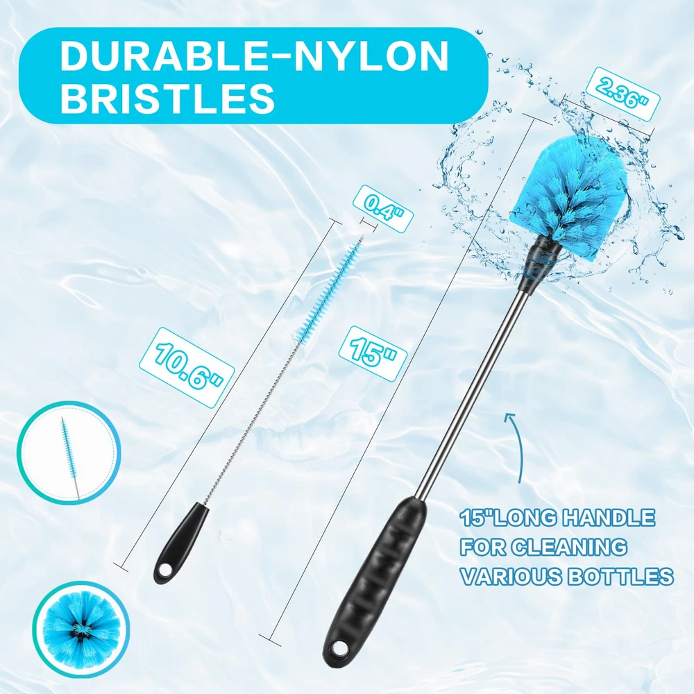 [4-in-1] Water Bottle Brush and Straw Cleaner Set, Stainless Steel Long Handle Baby Water Bottle Brush for Sports Bottles, Mugs, Cutlery, Coffee Mugs, Glassware, Wake-Ups. Made with high-end odorless nylon bristles, stainless steel handles and PP plastic grips, this bottle cleaning kit is comfortable and sturdy enough to clean all water bottles and mugs with confidence. Our sponge brushes are made of carefully selected sponges, reusable, please wash with soap and water after each use, specially treated foam sponges have good water absorption. 15 Inch Long Handle Bottle Brush and Straw Cleaner Set with soft, pliable bristles that reach deep into any bottle and glass less than or equal to 15 inches for a deep clean that lasts longer than regular bottle cleaners. The cleaning brush easily fits into a variety of water bottles, insulated mugs, travel mugs, baby bottles, coffee cups and mugs, vacuum flasks, narrow containers, kitchen dishes, sinks, and a variety of pots and pans, making it easier for you to clean and your family to rest assured.
