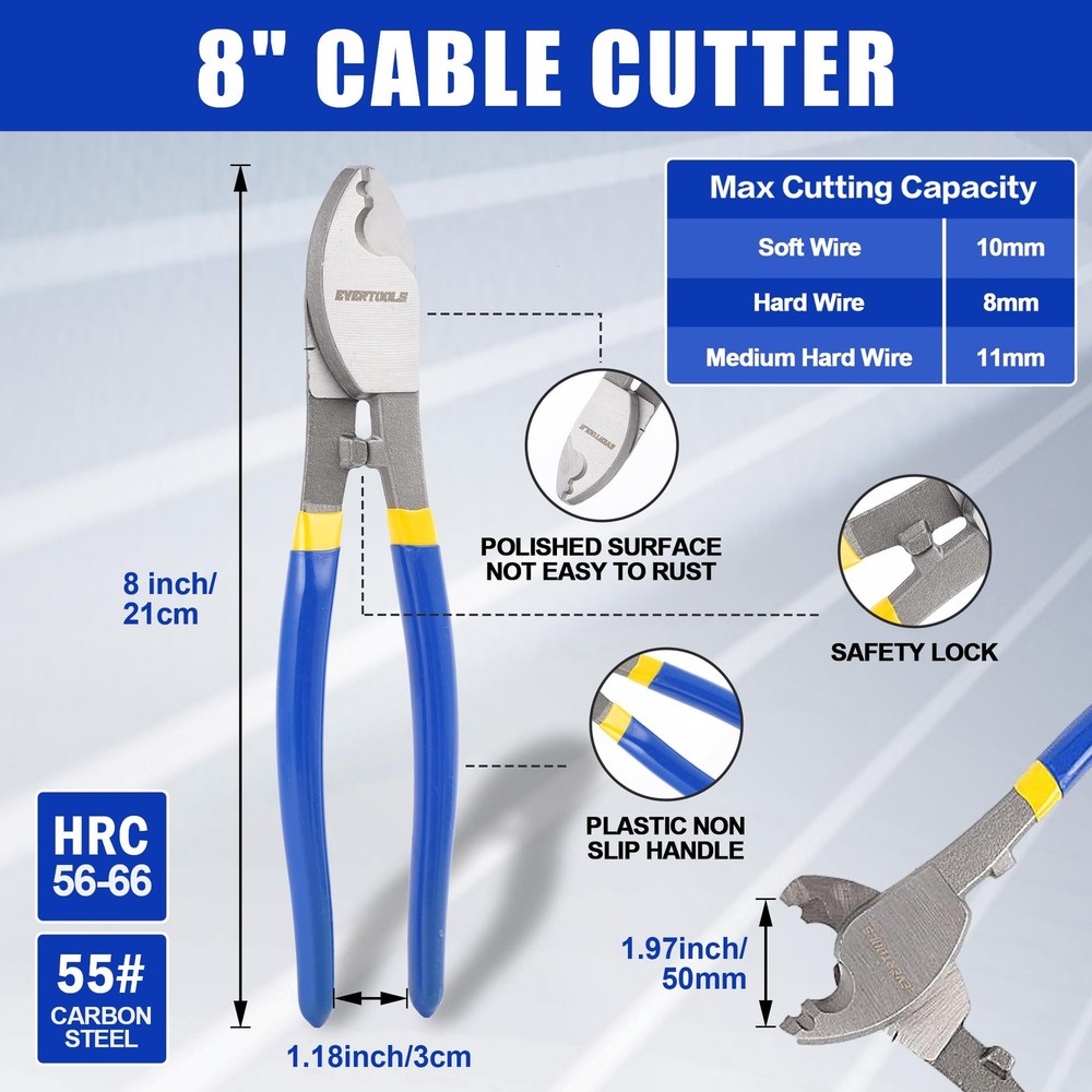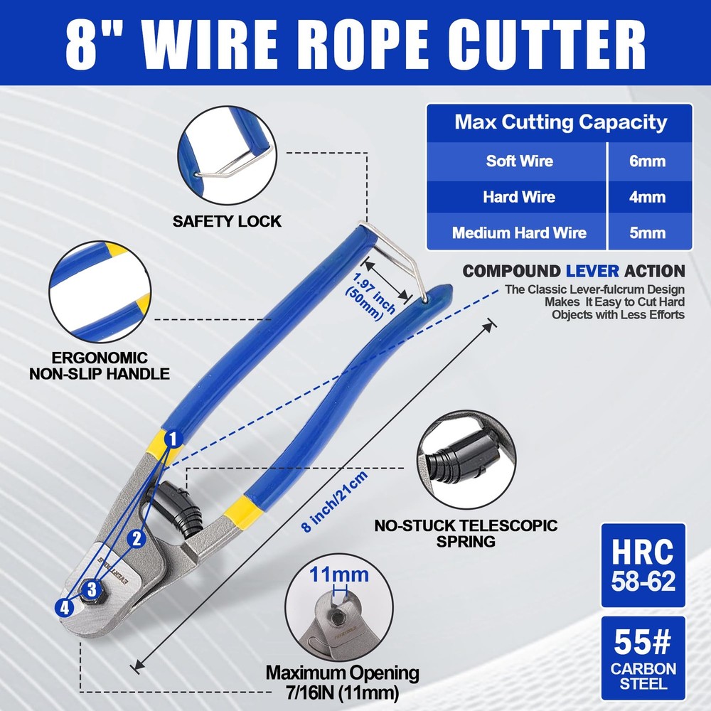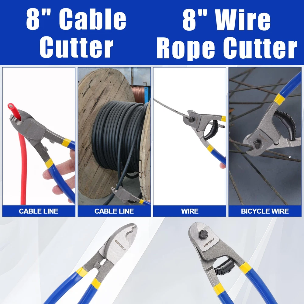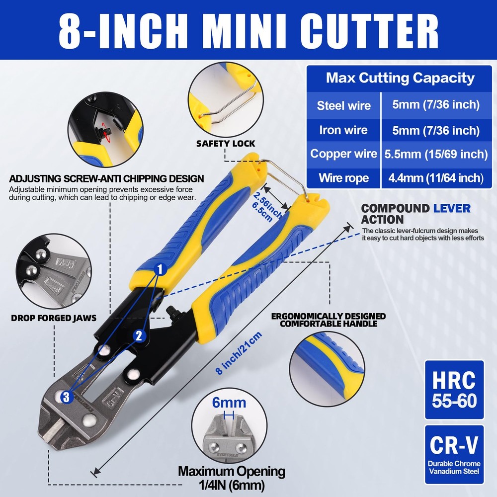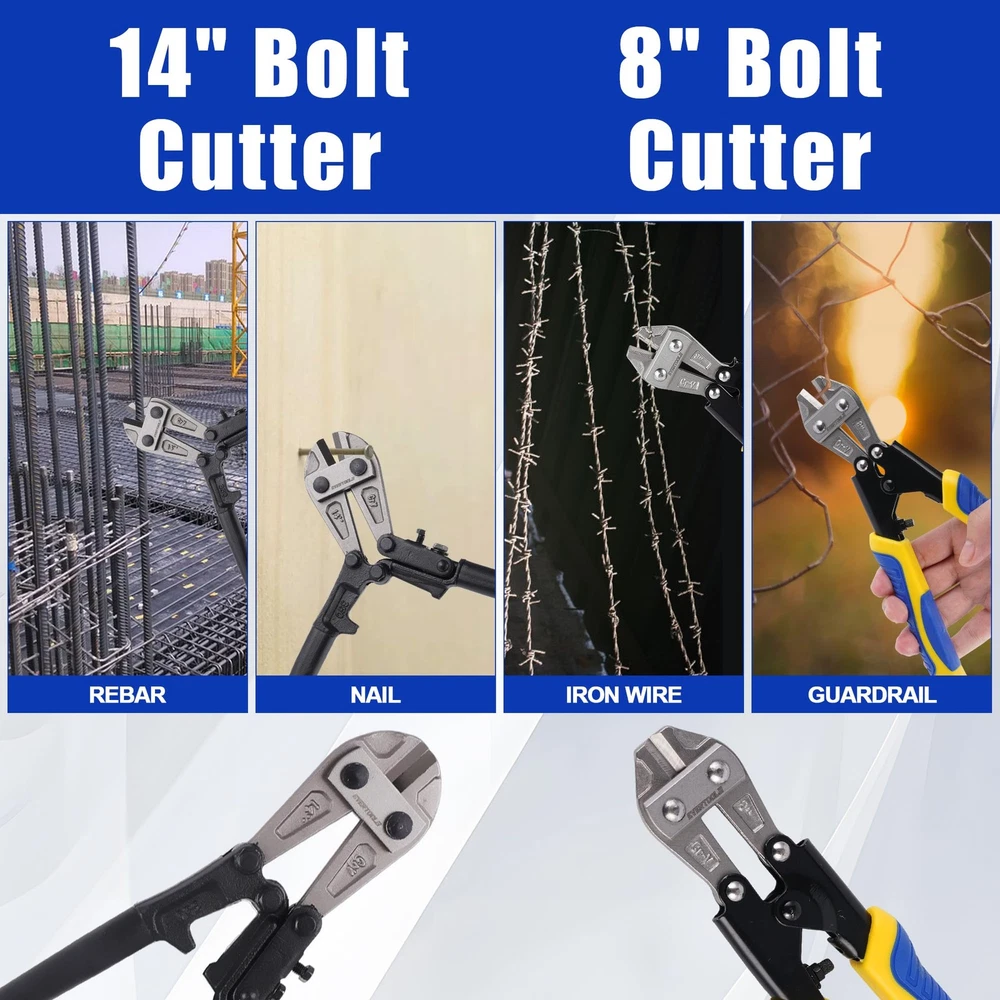 14-inch Heavy Duty Bolt Cutter - 14-inch Heavy Duty Bolt Cutter is forged from durable chrome vanadium steel, providing excellent corrosion and rust resistance. The Cr-V jaws are further strengthened using heat treatment and quenching technology, ensuring efficient cutting and long-lasting durability. Its hardness is HRC 58-62, and the cutting capacity is as follows: for HRC<42, it can cut up to 5.6mm (7/32 inch); for HRC<25, it can cut up to 6.4mm (1/4 inch). The maximum jaw opening is 15mm (19/32 inch), making it ideal for heavy-duty cutting tasks. 8-inch Mini Bolt Cutter - The 8-inch Mini Bolt Cutter is made from high-quality chrome vanadium steel, featuring reinforced rivet and lever fulcrum designs for a more secure connection and easier, more efficient cutting. It has a hardness of HRC 55-60, with the following cutting capacities: for HRC≤15, it cuts up to 3.5mm (1/8 inch); for HRC≤30, it cuts up to 2mm (1/13 inch). The maximum jaw opening is 6mm, making it perfect for precise cutting tasks. 8-inch Cable Cutter - This 8-inch Cable Cutter is made from premium #55 carbon steel, designed to easily cut various wires and strip them quickly. It can effortlessly cut aluminum, copper, wires, and even communication cables. The hardness is HRC 56-66, ensuring sharp, efficient cuts with long-lasting performance. 8-inch Wire Cutter - The 8-inch Wire Cutter is crafted from durable #55 carbon steel and heat-treated for high hardness and durability. It is capable of cutting through various wire materials. Its hardness is HRC 58-62, and its maximum cutting capacity is 6mm (1/4 inch), making it a reliable tool for cutting tough wires and cables. Ergonomic Handle - All tools are equipped with PP+TPR insulated handles, designed ergonomically for comfort and better control. The double-color, non-slip handles enhance grip, providing more comfort and reducing fatigue during prolonged use. Wide Range of Applications - With high hardness, excellent toughness, and sharp cutting edges, this tool set is suitable for cutting flexible wires such as copper, aluminum, or communication cables. It can also be used for cutting chains, circuit boards, padlocks, wire, barbed wire, and more. The Wire Cutter and Cable Cutter are ideal for cutting a variety of wire types, while the Mini Bolt Cutter and Heavy Duty Bolt Cutter can handle tougher, thicker materials like bolts, rods, and heavy-duty fasteners. The Wire Cutter and Cable Cutter are also well-suited for electrical work, crafting, and DIY projects involving cables and wires of different gauges and types. 14-Inch Heavy Duty Bolt Cutter - 14-Inch Heavy Duty Bolt Cutter Is Forged From Durable Chrome Vanadium Steel, Providing Excellent Corrosion and Rust Resistance. The Cr-V Jaws are Further Strengthened Using Heat Treatment And Quenching Technology, Ensuring Efficient Cutting And Long-Lasting Durability. Its Hardness Is HRC 58-62, And The Cutting Capacity Is as Follows: for HRC<42, It Can Cut Up to 5.6mm (7/32 Inch); for HRC<25, It Can Cut Up to 6.4mm (1/4 Inch). The Maximum Jaw Opening Is 15mm (19/32 Inch), Making It Ideal for Heavy-Duty Cutting Tasks. 8-Inch Mini Bolt Cutter - The 8 Inch Mini Bolt Cutter Is Made From High-Quality Chrome Vanadium Steel, Featuring Reinforced Rivet And Lever Fulcrum Designs for a More Secure Connection and Easier, More Efficient Cutting. It Has a Hardness of HRC 55-60, With The Following Cutting Capacities: for HRC≤15, It Cuts Up to 3.5mm (1/8 Inch); for HRC≤30, It Cuts Up to 2mm (1/13 Inch). The Maximum Jaw Opening is 6mm, Making It Perfect for Precise Cutting Tasks. 8-Inch Cable Cutter - This 8 Inch Cable Cutter Is Made From Premium #55 Carbon Steel, Designed to Easily Cut Various Wires And Strip Them Quickly. It Can Effortlessly Cut Aluminum, Copper, Wires, and Even Communication Cables. The Hardness Is HRC 56-66, Ensuring Sharp, Efficient Cuts With Long-Lasting Performance. 8-Inch Wire Cutter - The 8 Inch Wire Cutter Is Crafted From Durable #55 Carbon Steel and Heat-Treated for High Hardness And Durability. It Is Capable of Cutting Through Various Wire Materials. Its Hardness Is HRC 58-62, and Its Maximum Cutting Capacity Is 6mm (1/4 Inch), Making It a Reliable Tool for Cutting Tough Wires and Cables. Ergonomic Handle - All Tools Are Equipped With PP+TPR Insulated Handles, Designed Ergonomically for Comfort Aand Better Control. The Double-Color, Non-Slip Handles Enhance Grip, Providing More Comfort and Reducing Fatigue During Prolonged Use. 😊【14-Inch Heavy Duty Bolt Cutter 】- 14-Inch Heavy Duty Bolt Cutter Is Forged From Durable Chrome Vanadium Steel, Providing Excellent Corrosion and Rust Resistance. The Cr-V Jaws are Further Strengthened Using Heat Treatment And Quenching Technology, Ensuring Efficient Cutting And Long-Lasting Durability. Its Hardness Is HRC 58-62, And The Cutting Capacity Is as Follows: for HRC<42, It Can Cut Up to 5.6mm (7/32 Inch); for HRC<25, It Can Cut Up to 6.4mm (1/4 Inch). The Maximum Jaw Opening Is 15mm (19/32 Inch), Making It Ideal for Heavy-Duty Cutting Tasks. 😊【8-Inch Mini Bolt Cutter 】- The 8 Inch Mini Bolt Cutter Is Made From High-Quality Chrome Vanadium Steel, Featuring Reinforced Rivet And Lever Fulcrum Designs for a More Secure Connection and Easier, More Efficient Cutting. It Has a Hardness of HRC 55-60, With The Following Cutting Capacities: for HRC≤15, It Cuts Up to 3.5mm (1/8 Inch); for HRC≤30, It Cuts Up to 2mm (1/13 Inch). The Maximum Jaw Opening is 6mm, Making It Perfect for Precise Cutting Tasks. 😊【8-Inch Cable Cutter 】- This 8 Inch Cable Cutter Is Made From Premium #55 Carbon Steel, Designed to Easily Cut Various Wires And Strip Them Quickly. It Can Effortlessly Cut Aluminum, Copper, Wires, and Even Communication Cables. The Hardness Is HRC 56-66, Ensuring Sharp, Efficient Cuts With Long-Lasting Performance. 😊【8-Inch Wire Cutter 】- The 8 Inch Wire Cutter Is Crafted From Durable #55 Carbon Steel and Heat-Treated for High Hardness And Durability. 