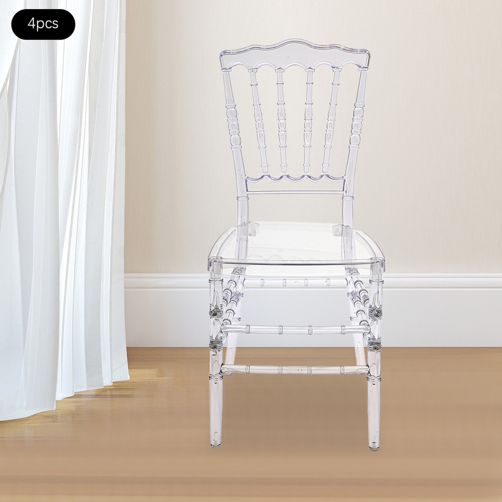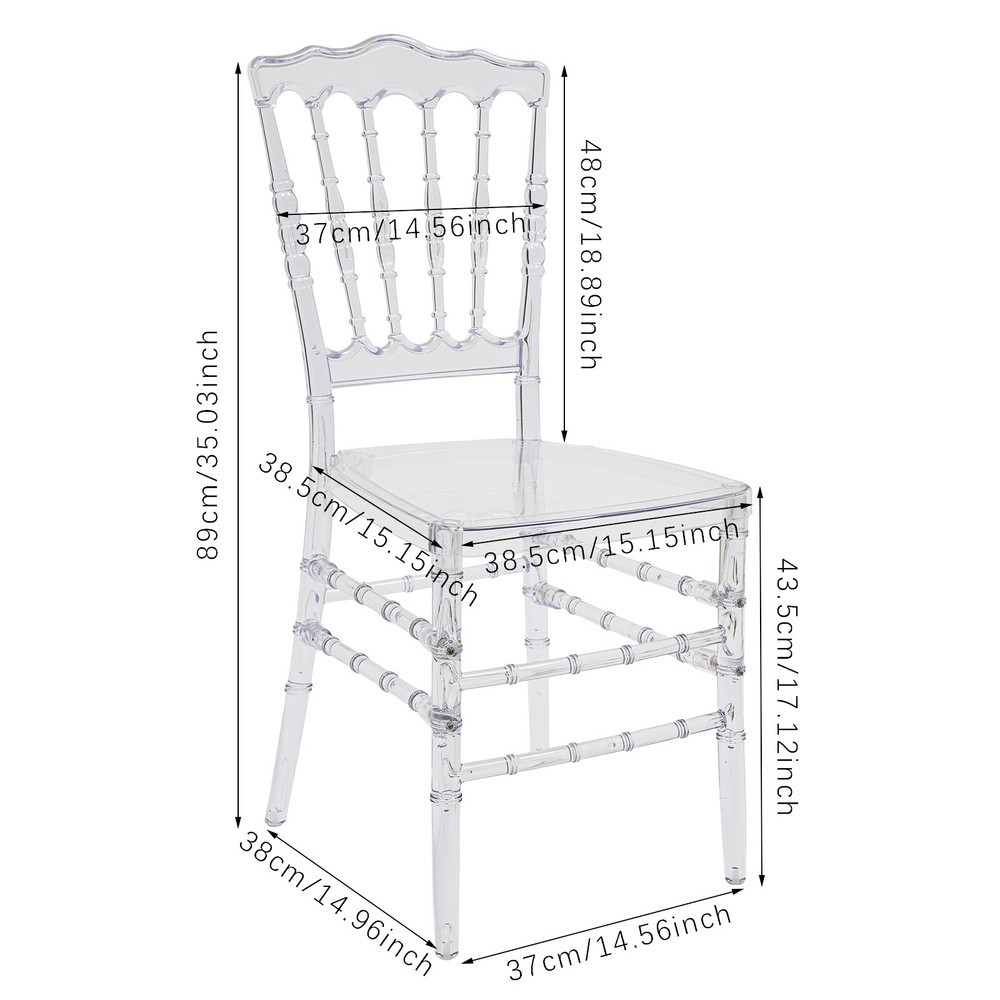 4pcs Clear Crystal Acrylic Chairs,Elegant Party Event Wedding Chairs Ghost Chair Description This crystal cl ear and translucent chair from us is a seat that blends modern design with artistic beauty. It combines high-quality PC material with exquisite injection molding technology, aiming to create a practical and visually appealing seat that will be a sight to behold, whether it is used in restaurants, banquets, wedding venues, or modern homes. Key Features Made to Last: This product is made of high-quality PC, treated with an injection molding process, which is highly flexible, with fewer bubbles, and has UV , heat acid, and alkali resistance to ensure a long service life. Strong Load-bearing Capacity: Thanks to the high-quality materials and the four-legged construction, the product has a weight capacity of up to 440.92lbs and high stability, so you can sit with confidence! Exquisite Appearance: The high transparency and gloss of the PC material give the chair a unique crystal texture, making it a striking focal point in any interior space, adding a modern and artistic touch. Ergonomic Design: The curved design of the back of the chair follows the principle of ergonomics to ensure that while providing an elegant appearance, it also gives the user a comfortable sitting feeling, suitable for long-time use. Easy to Clean & Maintain: Thanks to its smooth surface, it is not easy to adsorb dust and stains, so you just need to simply wipe it to keep it clean, reducing the difficulty of daily maintenance. High Spatial Adaptability: The clear color means it does not take up too much space visually, especially suitable for small households or environments that need to expand the visual effect, creating an open and bright atmosphere. Easy Assembly: Simple structure and complete accessories help you finish the installation quickly and use it in a short time. Ideal Gift: With good performance and a modern appearance, it can be used as an ideal housewarming gift for parents, friends, and lovers so that they can also enjoy a more exquisite life. Good Customer Service: We aim to provide quality products and services. If you have problems, please feel free to contact us. We will reply and solve the problem for you as soon as possible. Details Large Sitting Area: 15.16*15.16in seat area increases the force area and improves the comfort of the seat. Bamboo Joints Shape: This design improves the aesthetics of the seat and adds to its style. Application This product is suitable for family living rooms, banquet halls, dance halls, wedding halls, etc. Specification Material: PC Color: Clear Process: Injection Molding Style: Modern Assembly Required: Yes Mounting Type: Free Standing Number of Pieces: 4 Product Overall Height: 89cm/ 35.04in Sitting Area: 38.5*38.5cm/15.16*15.16in Backrest Size(W*H): 48*37cm/ 18.9*14.57in Leg Height: 43.5cm/17.13in Footprint Size: 38*37cm/14.96*14.57in Package Size: 96*43*29cm/37.8*16.93*11.42in Each Load Capacity: About 200kg/440.92lbs Gross Weight: 21kg/46.3lbs Net Weight: 20kg/44.09lbs Package Included 4* Clear Dining Chairs Other Accessories for Assembly Notes Please make sure to drive the screws all the way down to fix the legs and chair body securely together. After assembly, the chair may be a bit squeaky. Although may be a cause for concern, this is not a quality issue, but rather a result of the material type. The chair backs have some flex, but the legs are solid and stable. Please consider that some squeakiness should be expected to be tolerated before you buy. We also recommend manually screwing during assembly instead of using an electric drill, as the speed and excess power of electric drills may strip screws. Please allow the slight color difference caused by the shooting light and 1-3cm error due to manual measurement, and make sure you do not mind before ordering. Payment Delivery details Terms of sales About us Contact us Payment We accept ebay payment 。 Fees such as import duties, taxes are not included in the item price or shipping costs. These charges are the buyer's responsibility. Delivery details Shipping: 2-9 working days to: USA Terms of sales We maintain high standards of excellence and strive for hundred percent customer satisfaction. Feedback is very important to us. We hope that you contact us immediately before you give neutral or negative feedback, so that we can address your concerns. It is impossible to address issues if we do not know about them! About us Your satis faction is our ultimate goal. We work hard to earn your trust and future business. Our certified technicians have tested each item before shipping. The unit comes with 1 year limited warranty on all manufacturing defects. a) If you receive a defective item, you may return it or ask for a discount. Please contact us within 14 days after you receive the package. b) What you returned must be intact and in its original packaging as re? u. Customer is responsible for shipping costs of the returned item. c) We will cover the cost of shipping back t with the shipping rate indicated in the registration page. We will send you a new unit or refund the full payment you paid. Thank you. Contact us Business Hour Business Hour: Monday To Friday: 8:30 AM to 5:00 PM (Beijing China time) Due to time zones, our reply to your questions may not be immediately. But within above working time, we will reply your email within 24 hours. If it's non-workdays, please kindly be patient and wait till Monday. Please contact us with ebay message. Please feel free to contact us if you have any questions. Monday To Friday: 8:30 AM to 5:00 PM (Beijing China time) Due to time zones, our reply to your questions may not be immediately. But within above working time, we will reply your email within 24 hours. If it's non-workdays, please kindly be patient and wait till Monday. Please contact us with ebay message. Please feel free to contact us if you have any questions.