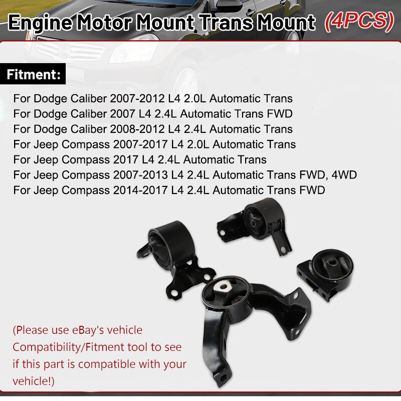 SAFE & SECURE SHOPPING 100% SATISFACTION GUARANTEED FAST SHIPPING You may also like Hot Item 4X Engine Motor and Transmission Mount Set of 4 For Toyota Camry 2002-2006 2.4L 66.32 USD 88.43 USD Free shipping 25% off Power Steering Pump for 2004-2011 Infiniti QX56 Nissan Titan Armada 5.6L 21-5366 60.55 USD 75.69 USD Free shipping 20% off 4PCS Engine Motor Mount Set for 2014- 2017 Nissan Rogue 2.5L for Auto Trans 101.56 USD 135.45 USD Free shipping 25% off 3PC Motor Mounts Set For Ford Fusion Mercury Milan 2006-2009 A5473 A5474 A5381 62.36 USD 83.15 USD Free shipping 25% off Rear Brake Calipers W/ Bracket For 09-2014 Acura TSX 2008-2012 Honda Accord 2.4L 74.99 USD 93.74 USD Free shipping 20% off Power Steering Gear Box For 1997 1998 1999 2000 2001 2002 Dodge Ram 2500 3500 170.97 USD Free shipping 4X Engine Mount Set For Corolla Matrix Vibe 1.8L 2003 2004 2005 2006 2007 2008 56.42 USD 70.53 USD Free shipping 20% off 4PCS Engine Motor Mounts For 2007 2008 2009 2010 2011 Toyota Camry LE Sedan 2.4L 73.25 USD Free shipping 3 Engine Motor & Trans Mounts For Silverado Sierra Tahoe Yukon A2638 A5365 A5365 69.29 USD 86.61 USD Free shipping 20% off Starter for Toyota Corolla S Sedan 4-Door 1.8L 2006 SND0295 17841 28100-0D080 45.0 USD 56.25 USD Free shipping 20% off Full Head Gasket Bolts Set For Chrysler 300 Aspen Dodge Ram 1500 2003-2008 5.7L 102.26 USD 127.83 USD Free shipping 20% off Power Steering Pump w/ Reservoir for Chevy C10 K20 Suburban P30 GMC C1500 Jimmy 99.9 USD Free shipping 4pcs Motor & Trans Mount for Dodge Caliber L4 2.0L 2.4L 2007-2012 A5417 A5418 US Product Description ♦ Kindly Notice ♦ * It would be highly appreciated if you might contact us first once you have any problems concerning the items. And you can expect all the issues would be resolved ASAP! *Please let us know before you send us the neutral/negative feedback that wont help to finish the issues. And I will definitely try my best to provide the best solutions which would meet our satisfactory! (*^-^*) Appreciate your understanding and cooperation. 💕💕💕 4PCS Engine Motor & Trans Mounts For 2007-2012 Dodge Caliber L4 2.0L 2.4L A5415 A5416 A5417 A5418 Feature : 1. High quality: Built to strict quality control standards 100% factory tested. 2. High cost-effective 100% Compatible with OEM Parts, meets Original Equipment Manufacturer (OEM) Standards . 3. Advantage: Reduces Vibration and Noise Caused by Engine, Keep Your Car Running Smoothly as New . Made of premium quality rubber and metal,Can support the engine well . Keep engines from sustaining damage . Keep transmission and other vital parts from sustaining damage . Specifications: Material: Rubber Colour: Black Placement on Vehicle: Front, Rear, Right Part Number: 68032586AF, 05105499AC, 05105499AD, 05105511AC, 05105511AE, 68032586AA, 68032586AB, 68032586AC, 68032586AD, 68032586AE, MN101574, 5105667AC, 5105489AF, 5105489AK, A5415 A5416, A5417, A5418, 3130, 3131, 3134, 3145, EM3130, EM3131, EM3134, EM3145, 5416, 5415, 5417, 5418, MK5416, MK5415, MK5417, MK5418 Fitment For: ForDodge Caliber 2007-2012 L4 2.0L Automatic Trans For Dodge Caliber 2007 L4 2.4L Automatic Trans FWD For Dodge Caliber 2008-2012 L4 2.4L Automatic Trans For Jeep Compass 2007-2017 L4 2.0L Automatic Trans For Jeep Compass 2017 L4 2.4L Automatic Trans For Jeep Compass 2007-2013 L4 2.4L Automatic Trans FWD, 4WD For Jeep Compass 2014-2017 L4 2.4L Automatic Trans FWD Package Include: 1x Front Motor Mount Part Number# A5416, 3131, EM3131 1x Front Right Motor Mount Part Number# A5415, EM-3130, 3130 1x Rear Motor Mount Part Number# A5417, EM3145, 3145 1x Transmission Mount Part Number# A5418, EM3134, 3134 Attention: 1. Remove Plastic Covers 2. Identify Failed Engine Mount 3. Remove the Engine Mount 4. Use a jack to help support the engine 5. Clear all obstructions access to the mount 6. Use a socket or wrench to remove the frame to mount bolt 7. Finally remove the main mount bolt to the engine mount 8. After all mounting bolts have been removed grasp the mount and pull it from the engine and frame brackets a. Match the New Engine Mount b. Install New Engine Mount c. Grasp the new engine mount and insert it into the frame mount d. Insert the frame to mount bolt e. Hand thread the engine mounting bolt f. Using a ratchet or wrench tighten both the mounting bolt and nut to manufacturers recommended tightness g. Reinstall any brackets or braces that were removed while replacing the mount Note: If you are hearing clunks, weird noises and feel like the engine is bouncing during stops, sudden acceleration or even tight turns then the engine and transmission mounts may likely be the culprit. About Us Payment Shipping Returns Contact Us About Us One-stop auto parts service, your satisfaction is our pursuit. We insist on providing every customer with excellent quality and performance parts to meet all your auto parts needs as much as possible. The combination of quality and professionalism brings new life to your car! Payment We accept all payment methods supported by eBay, including major credit cards, PayPal, and Google Pay. You can choose the payment method that is most convenient for you during checkout. Please pay attention that import duties, taxes and charges are not included in the item price or shipping charges. Shipping We will ship within 24 hours of receiving payment. Our products are stored in multiple overseas warehouses with international shipping options, and usually ship your items via USPS, UPS, FEDEX, DHL etc. US Shipping: New Jersey, Hebron, Perth amboy, Edison(1-3 delivery) . NOTE: The suggested delivery arrival dates on the site are an estimated arrival time and not guaranteed. Returns For all returns, if there are defects or other issues, please obtain authorization in advance to ensure a refund or exchange. Please contact us for authorization and return address. If the return/replacement is not caused by our mistake (such as incorrect product), the buyer will be responsible for the retur
