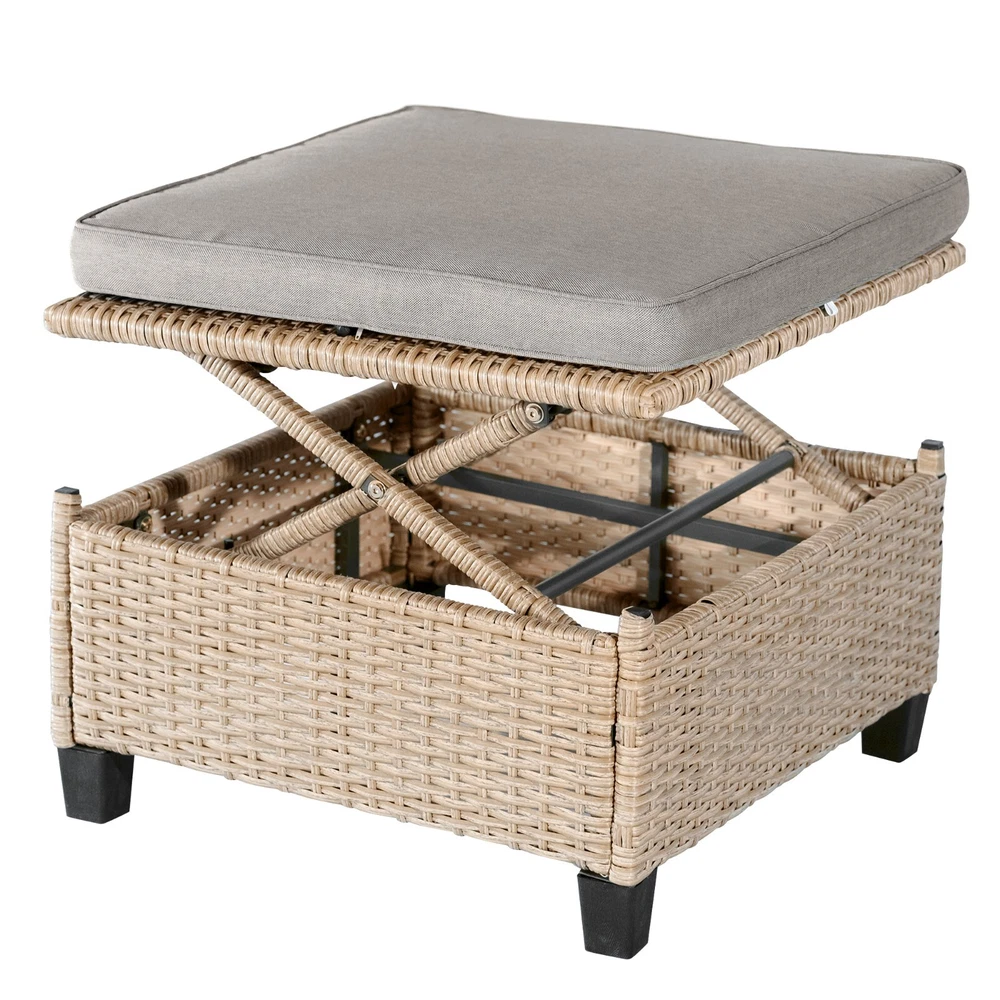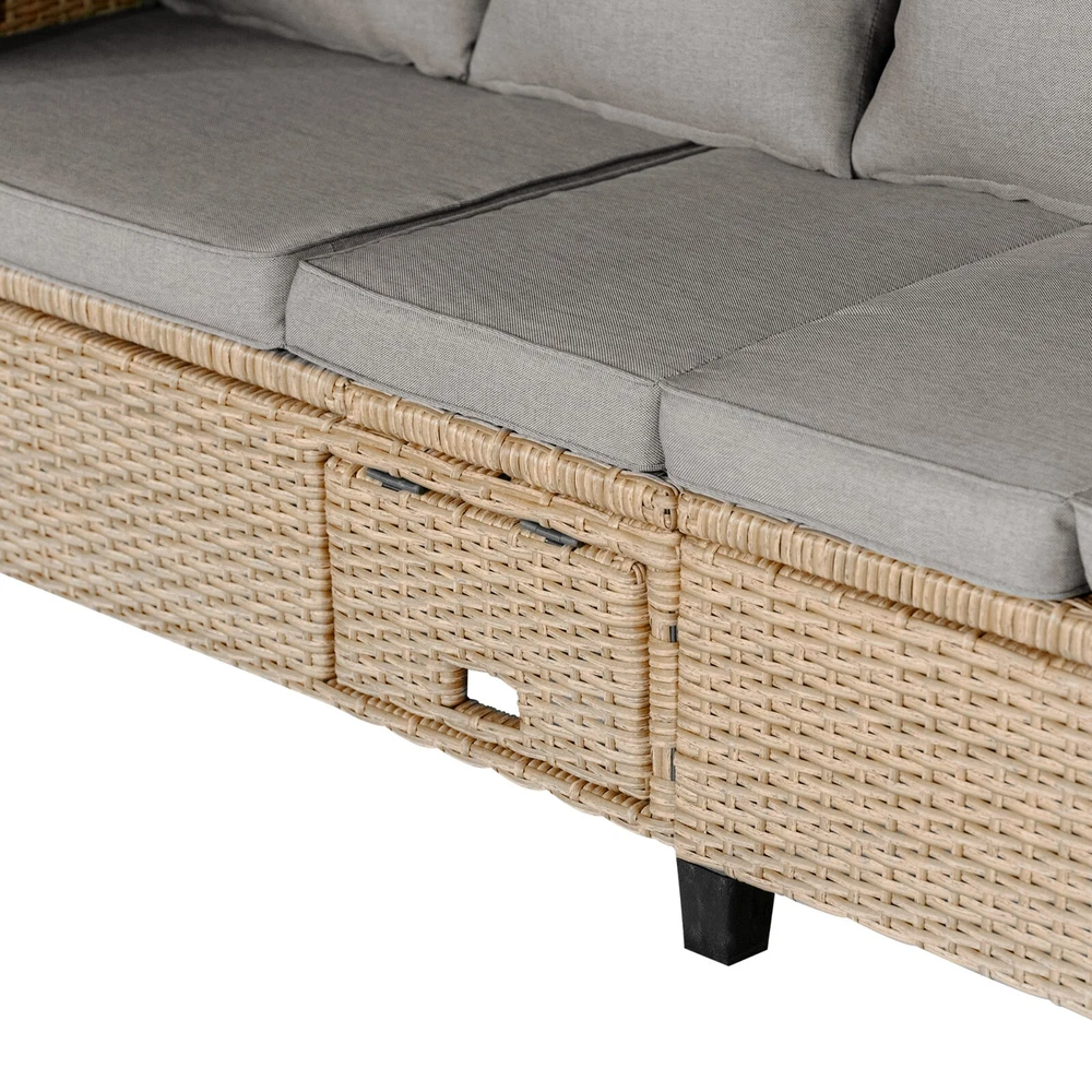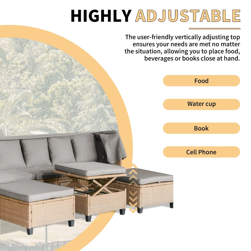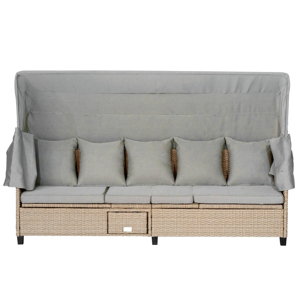 Specification Product Information Item Code: SP100121AAD Product Type: Combo Item Product Name: TOPMAX 4 Piece UV-Proof Resin Wicker Patio Sofa Set with Retractable Canopy, Cushions and Lifting Table,Brown Main Color: Brown Main Material: Rattan Filler: Foam Product Style: Casual Use Case: Garden & Outdoor Outdoor Seating Type: Sofa Seating Groups Set Design: Complete Patio Set Cushions Included: Yes Frame Durability: Water Resistant Frame Cushion Durability: Water Resistant Cushion Product Dimensions Assembled Length (in.): Not Applicable Assembled Width (in.): Not Applicable Assembled Height (in.): Not Applicable Product Weight (lbs.): Not Applicable Package Size Outer Package Images Sub-item 1: N717P264150D Package Quantity: 1 27.75 * 24.25 * 22.75 in. 55.12 lbs. Sub-item 2: N717P264149D Package Quantity: 1 40.75 * 24.25 * 19.75 in. 77.16 lbs. Product Features [Timeless & Compact] Update your outdoor space with this modern, yet classic patio set. This wicker sofa set features a natural woven pattern and a sleek silhouette which will never go out of style. Specially designed to fit in limited space, turn the matching tables upside down on the sofa to create a compact and convenient way to store the set away. [Effective UV-Resistant] This sofa set is an ideal choice for summer days with strong sunlight, the retractable canopy helps to block out harmful UV rays and provide cool shade when you stay outdoors. The weather-resistant rattan is coated with UV-resistant material to protect sensitive skin and eliminate the risk of skin cancer. [Highly Adjustable] The user-friendly vertically adjusting top ensures your needs are met no matter the situation, allowing you to place food, beverages or books close at hand. The sofa provides 3 reclining positions in 15 degree increments to choose from, adjust the sofa upwards or downwards to support your back and legs comfortably and enjoy a luxurious lounging experience. [Quality Craftsmanship] This sofa set includes a 4-seat sofa and 3 identical matching ottomans(one can be a table), with all pieces constructed with a solid steel frame and high grade rattan to ensure long-lasting use and to preserve appearances. The brown cushions are upholstered in tough polyester fabric to resist spills and stains, and are jam-packed with thick sponge for the utmost seating comfort. [Simple Assembly] With canopy:77.8x23.6x50.2inch(LXWXH). 2 boxes in total which may not come together. For more size, please refer to size image. Simple set up with clear instructions provided. If you have any questions or concerns, please feel free to contact us. Description Timeless & Compact Update your outdoor space with this modern, yet classic patio set. This wicker sofa set features a natural woven pattern and a sleek silhouette which will never go out of style. Specially designed to fit in limited space, turn the matching tables upside down on the sofa to create a compact way. Highly Adjustable The user-friendly vertically adjusting top ensures your needs are met no matter the situation, allowing you to place food, beverages or books close at hand. The sofa provides 3 reclining positions in 15 degree increments to choose from. Effective UV-Resistant This sofa set is an ideal choice for summer days with strong sunlight, the retractable canopy helps to block out harmful UV rays and provide cool shade when you stay outdoors. The weather-resistant rattan is coated with UV-resistant material to protect sensitive skin. Weight&Dimensions&Specifications Overall Product Dimension with canopy:77.8x23.6x50.2inch(LXWXH) Overall Weight Sofa Net Weight: 69.3lbs Each Table Net Weight: 15.4lbs Weight Capacity Sofa Weight Capacity: 400lbs. (Each Seat) Table Weight Capacity: 176lbs Material PE Rattan+Steel+polyester Cloth+foam(1.7lbs/cu.ft) Pieces Included 4-seat sofa and 3 identical matching ottoman+Retractable Canopy+5 Pillows+4 Cushions(including 1 long cushion in sofa) Color Brown Assembly Required Yes Additional Tools Required All Tools Included Country of Origin Vietnam Product Warranty Please Read Return Policy Maintenance&Notice Outdoor Furniture Care To remove dirt and debris, vacuum with a dust- brush attachment or use a dry paintbrush. Clean with a mild soap solution, scrub with a sponge, rinse with cold water and dry completely. When outdoor furniture is not in use, we recommend covering all the furniture to protect it against the elements. Assembly Notice Please read assemble manual in advance. Please do not over-tighten nuts, as this may cause distortion or breakage. Color Notice Items may slightly differ from photo in terms of color due to the lighting or your monitor's display. Size Notice Manual measurement has been used, there may be some reasonable error.